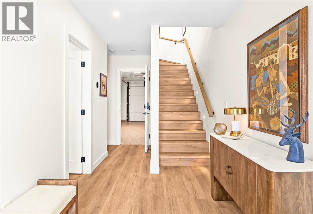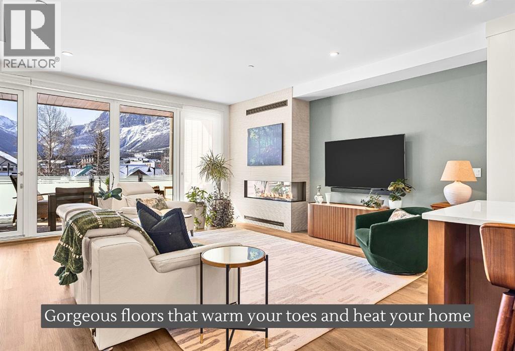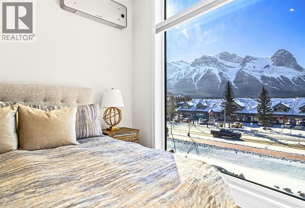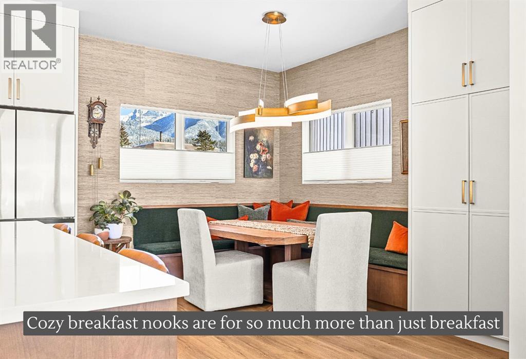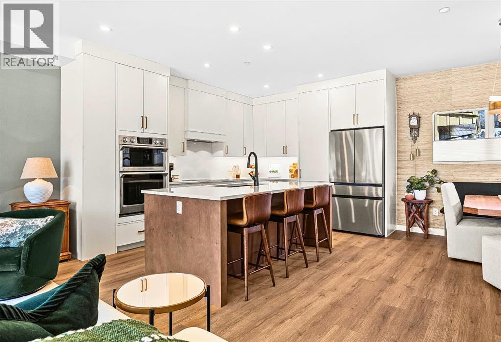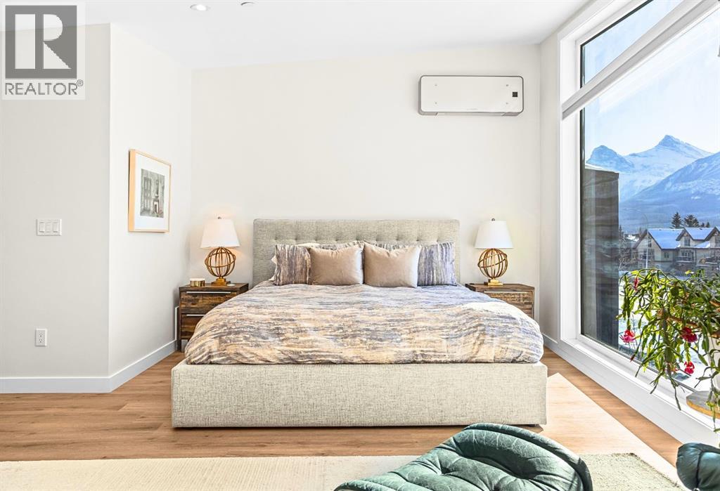 Welcome to the alpine sanctuary of Raven's Peak (Residential Only) in the heart of majestic Canmore — Completed in 2023 by a local homebuilder, this like-new 3-bedroom, 3-bathroom townhome blends thoughtful craftsmanship with refined modern design. Every detail feels intentional. Every space feels elevated. Step into the living room and feel the immediate impact of a dramatic floor-to-ceiling wall of Lux triple glaze windows — a stunning architectural statement that perfectly frames the grand mountain views beyond. Whether it’s sunrise alpenglow or a snow-dusted evening skyline, the striking peaks of the Canadian Rockies become your ever-changing artwork. The heart of the home is a showpiece kitchen anchored by a prominent quartz island — sleek, sculptural, and ideal for entertaining. Efficient stainless steel appliances complement clean modern lines, while a cozy breakfast nook invites slow mornings with coffee and your loved ones. It’s a space that effortlessly transitions from a quiet intimate evening, to a lively dinner parties with friends. The primary bedroom is nothing short of breathtaking. Imagine waking up to unobstructed mountain views — visible directly from your pillow. No buildings. No rooftops. Just stars, peaks, and bright blue sky. Spacious and serene, this retreat offers the kind of daily inspiration that never grows old. Beyond beauty lies performance. A highly efficient geothermal system provides sustainable heating and cooling year-round, delivering exceptional comfort with reduced environmental impact. Triple-glaze windows enhance both efficiency and tranquility, creating a peaceful indoor environment in every season. Practicality is equally refined. A convenient mudroom and bathroom sit directly off the garage — ideal for after mountain adventures. The single attached garage features durable epoxy flooring and a slatwall organizing system to keep all your gear in order. An exterior hose makes clean-up easy after hikes or bike rides, and the fe nced front patio offers a private space to relax in the alpine sun & air. Perhaps most coveted of all — direct pedestrian access across the street to downtown Canmore. Leave the car behind and stroll to cafés, boutiques, groceries, dining, and trailheads within minutes. No need for Canmore's amazing free public transit, but there is a stop a stones throw away. This is more than a townhome.It’s modern mountain living — elevated, efficient, and effortlessly connected to the very best of Canmore. (This is a Residential home, No STR allowed) (id:58070)