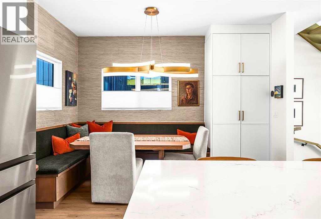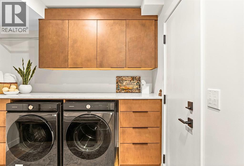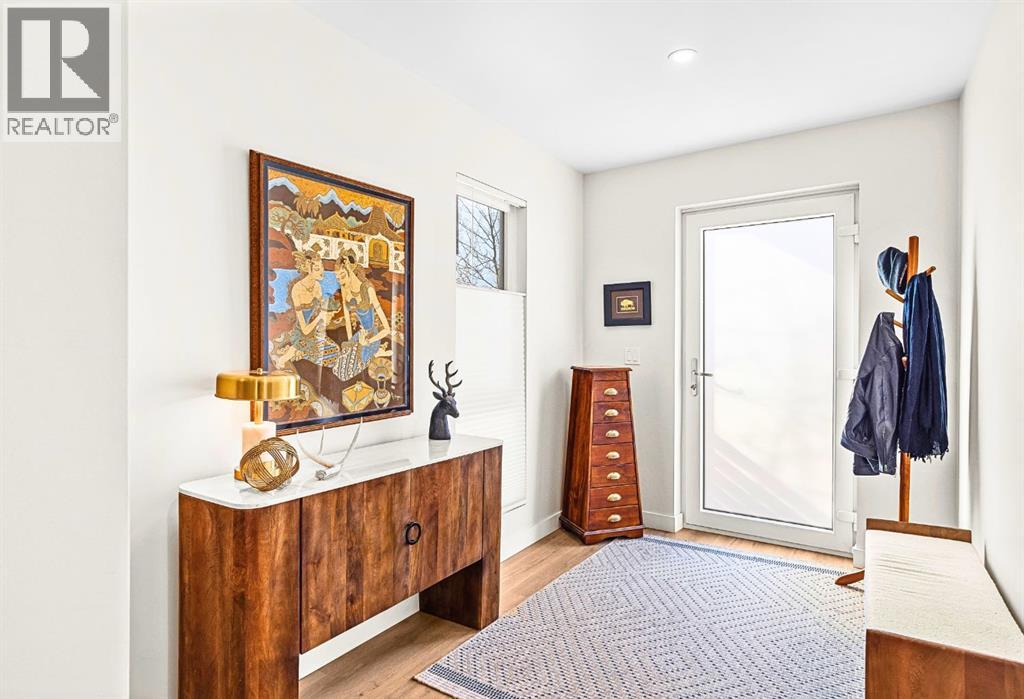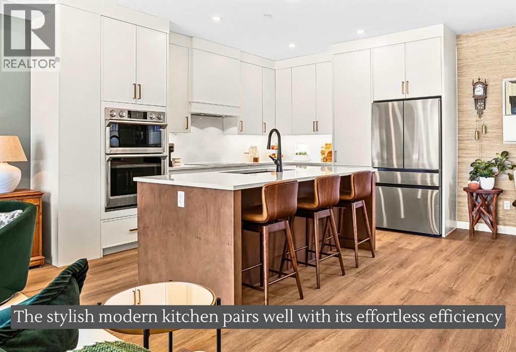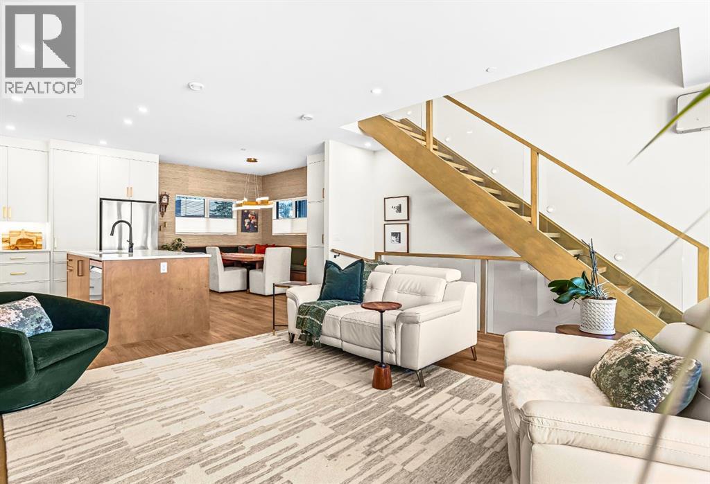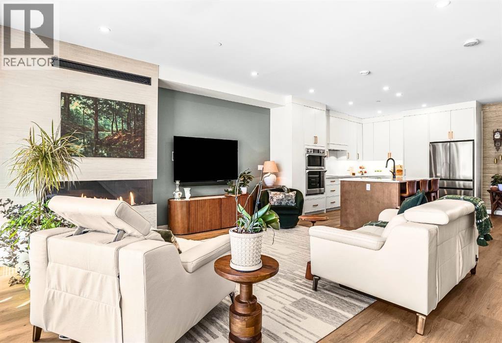 Welcome to the alpine sanctuary of Raven's Peak (Residential Only) in the heart of majestic Canmore — Completed in 2023 by a local homebuilder, this like-new 3-bedroom, 3-bathroom townhome blends thoughtful craftsmanship with refined modern design. Every detail feels intentional. Every space feels elevated. Step into the living room and feel the immediate impact of a dramatic floor-to-ceiling wall of Lux triple glaze windows — a stunning architectural statement that perfectly frames the grand mountain views beyond. Whether it’s sunrise alpenglow or a snow-dusted evening skyline, the striking peaks of the Canadian Rockies become your ever-changing artwork. The heart of the home is a showpiece kitchen anchored by a prominent quartz island — sleek, sculptural, and ideal for entertaining. Efficient stainless steel appliances complement clean modern lines, while a cozy breakfast nook invites slow mornings with coffee and your loved ones. It’s a space that effortlessly transitions from a quiet intimate evening, to a lively dinner parties with friends. The primary bedroom is nothing short of breathtaking. Imagine waking up to unobstructed mountain views — visible directly from your pillow. No buildings. No rooftops. Just stars, peaks, and bright blue sky. Spacious and serene, this retreat offers the kind of daily inspiration that never grows old. Beyond beauty lies performance. A highly efficient geothermal system provides sustainable heating and cooling year-round, delivering exceptional comfort with reduced environmental impact. Triple-glaze windows enhance both efficiency and tranquility, creating a peaceful indoor environment in every season. Practicality is equally refined. A convenient mudroom and bathroom sit directly off the garage — ideal for after mountain adventures. The single attached garage features durable epoxy flooring and a slatwall organizing system to keep all your gear in order. An exterior hose makes clean-up easy after hikes or bike rides, and the fe nced front patio offers a private space to relax in the alpine sun & air. Perhaps most coveted of all — direct pedestrian access across the street to downtown Canmore. Leave the car behind and stroll to cafés, boutiques, groceries, dining, and trailheads within minutes. No need for Canmore's amazing free public transit, but there is a stop a stones throw away. This is more than a townhome.It’s modern mountain living — elevated, efficient, and effortlessly connected to the very best of Canmore. (This is a Residential home, No STR allowed) (id:58070)
