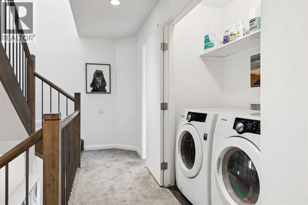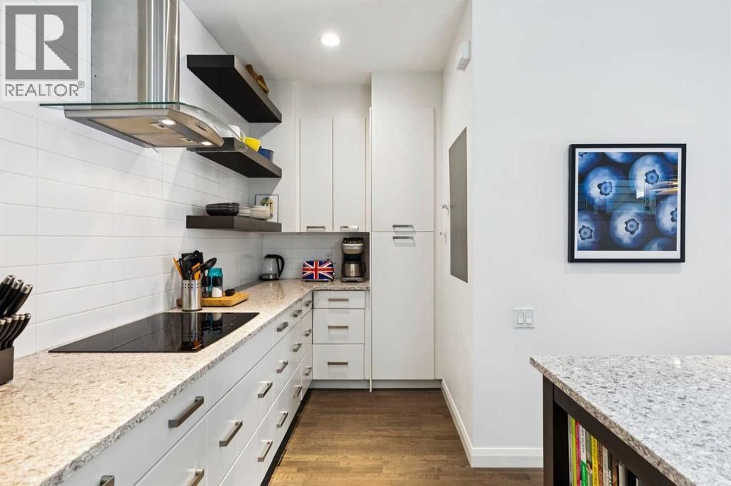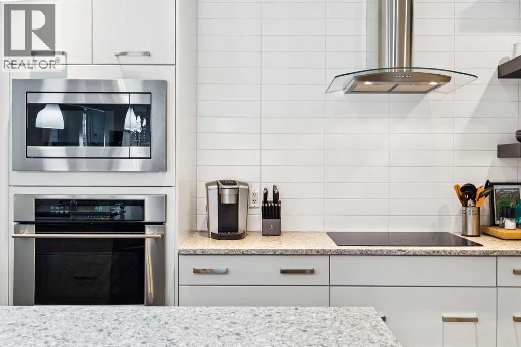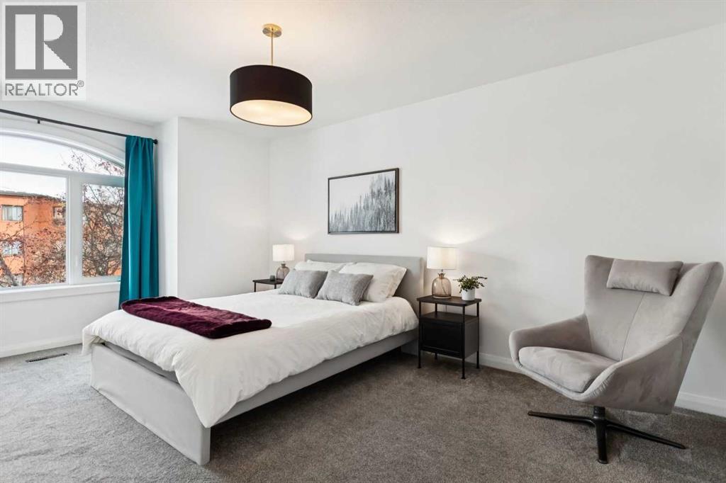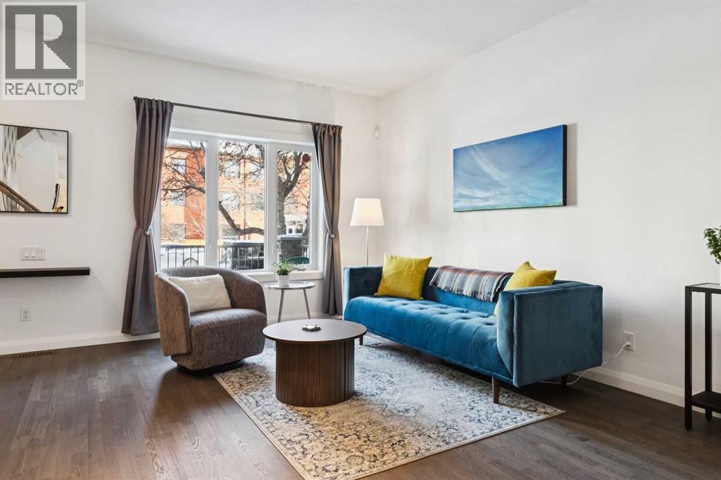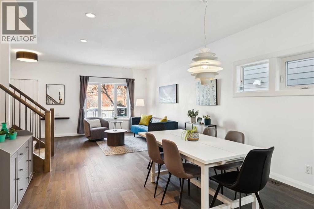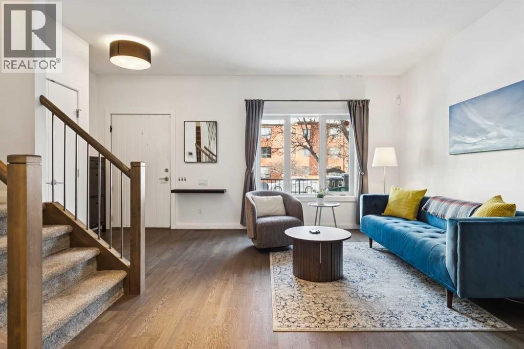 Looking to enter West Hillhurst, but don't want to sacrifice space or quality? Welcome to #1, 2421 2 Avenue NW: a beautiful FRONT-FACING 3-storey townhouse in sought-after West Hillhurst offering over 2,500 sqft of total living space, including a fully developed basement. The home sits at the front of the complex with a welcoming front deck and aggregate concrete exterior, and includes one stall in the detached garage off the back lane along with a visitor parking pad. The main floor features 9-foot ceilings, an extra-wide front door, hardwood flooring, and an open-concept living room, dining area, and kitchen, plus a convenient half bathroom with quartz countertops and tile floors. The kitchen includes stainless steel appliances, an in-wall oven, an induction stovetop with range hood, quartz countertops, pantry storage, a bar fridge, and a microwave replaced in 2023. Soundproofing between units is exellent, and solid doors are installed throughout the home. On the second floor, you will find 2 carpeted bedrooms, laundry, and a full bathroom with quartz countertops, tile floors, and a tiled tub/shower combination. The primary bedroom also includes a large private ensuite with dual sinks, quartz countertops, a tiled shower, and a large soaker tub. The incredible top floor is a bright and versatile space with vaulted ceilings, skylights, a ceiling fan, and a Juliet balcony, making it ideal for a bedroom, office, workout space, playroom, or media room. The developed basement offers new carpet, a large rec room with wet bar, a spacious bedroom, and a full bathroom with quartz countertops, tile floors, and a tiled tub/shower combination, along with the boiler system. Carpet throughout the top two floors and basement was replaced in 2022, and shingles were replaced in 2023. Maintenance fees are a low $418 per month and include reserve fund contributions, snow removal, annual exterior window cleaning, exterior insurance, and electricity for the garage. Located in the highl y desirable community of West Hillhurst, this home is within walking distance to the amazing Bow River pathway system, close to a grocery store, and near several schools and local amenities, with quick access to downtown and Kensington. Book your showing before it's too late! (id:58070)