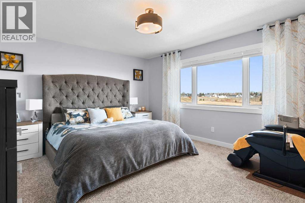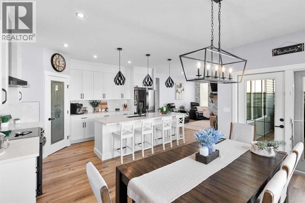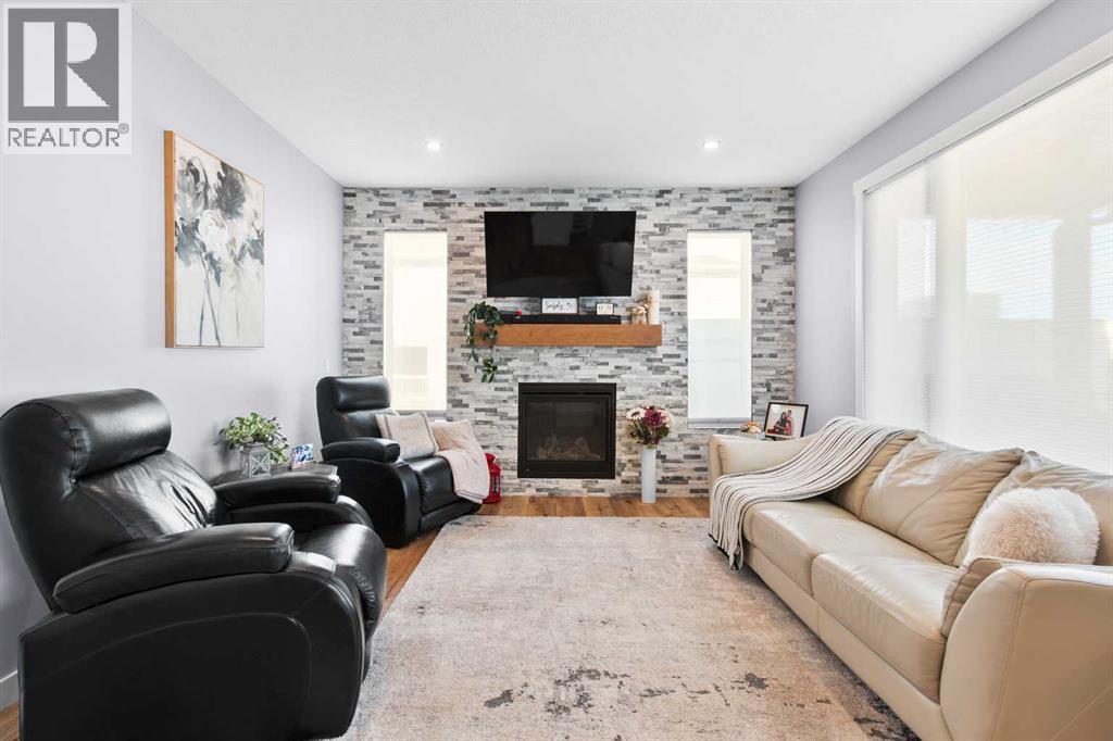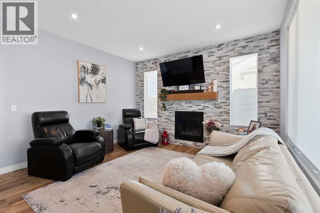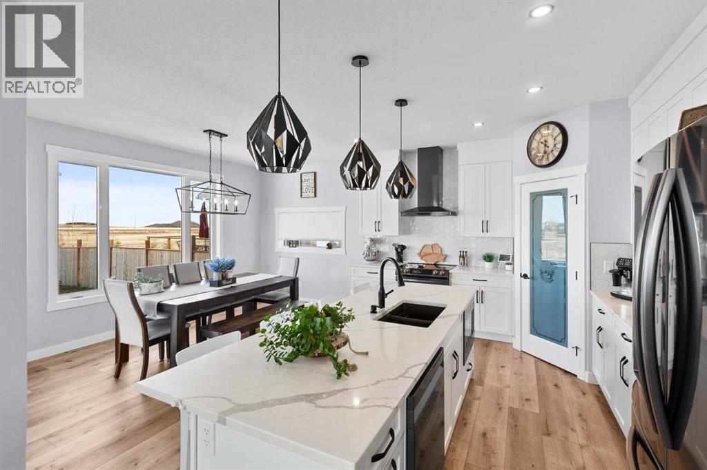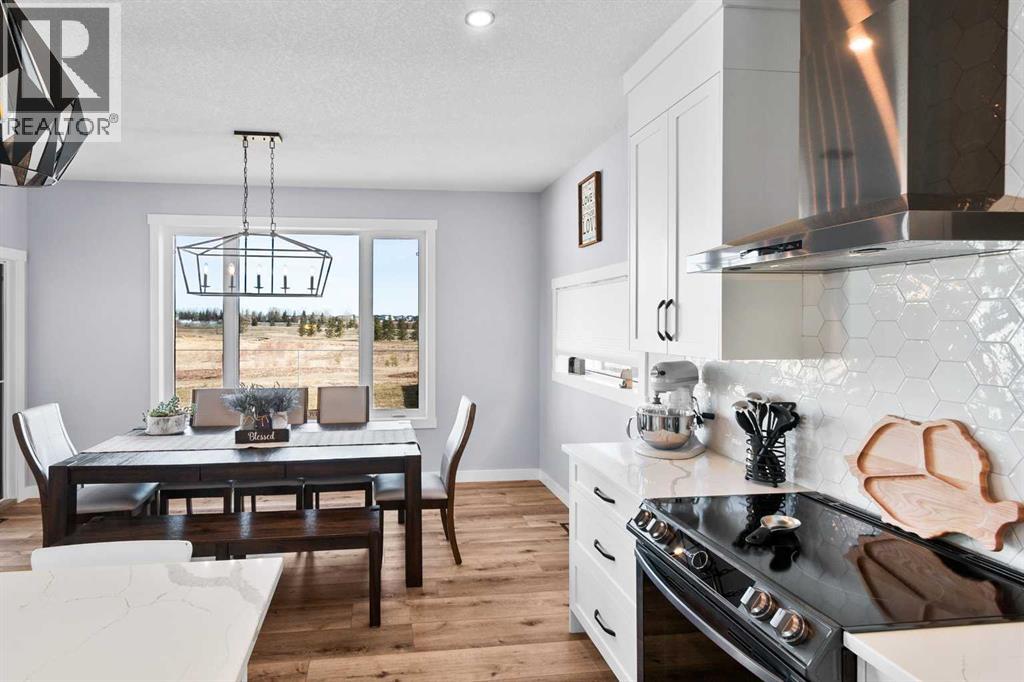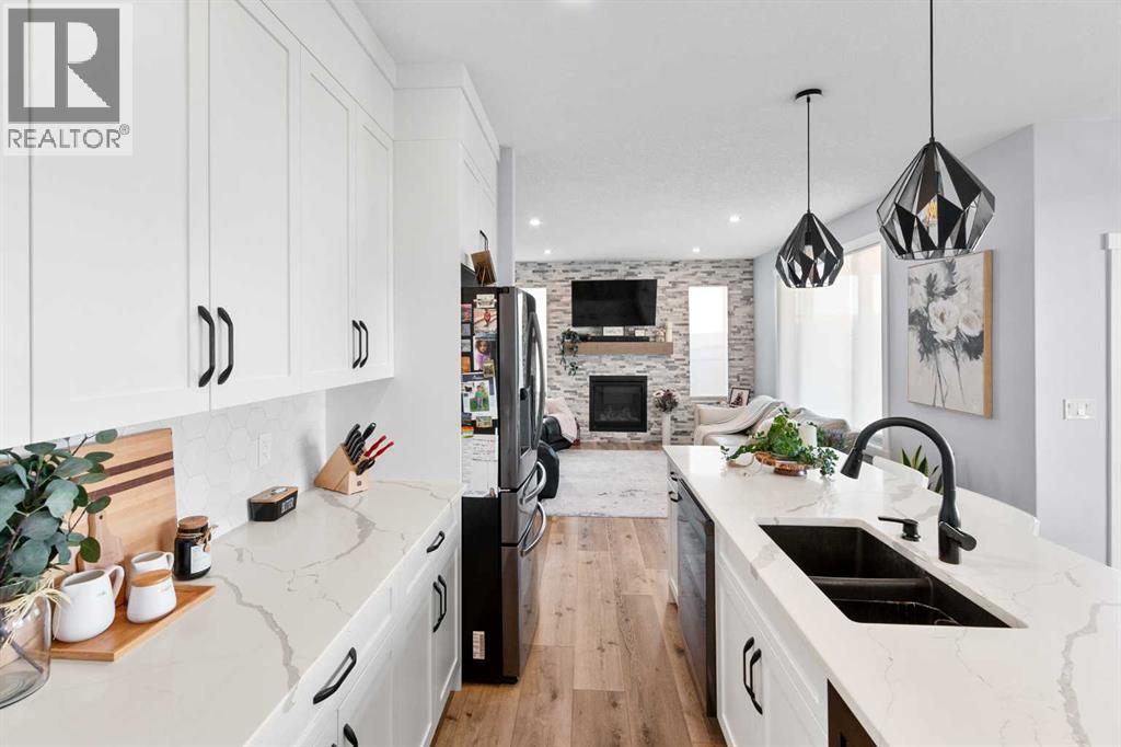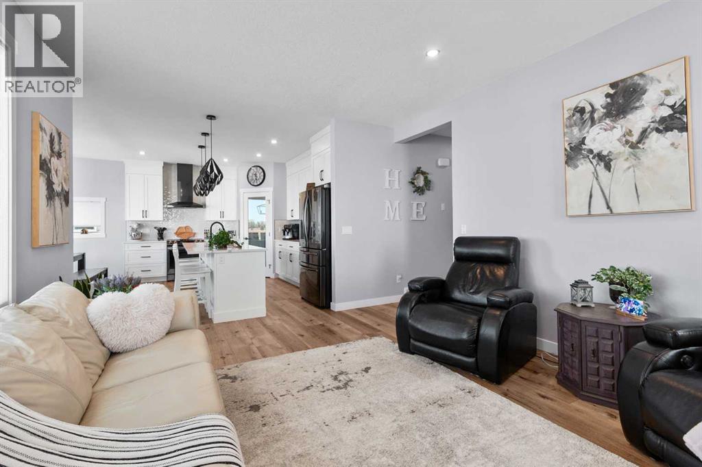 This spotless home was built by a local reputable builder (Anchored Custom Homes) and it backs the Nature Space in Carstairs. It has many added features such as extra windows, special trim, oversized island, wood shelves and much more that is evident when you walk through. The front entry is spacious with its full height ceiling. Go next Into the great room which has vaulted ceilings and vinyl plank flooring. The generous sized living room has a gas fireplace with windows on each side and a brick feature wall. The bright white kitchen has a large island with quartz counters and lots of counter space and cabinets. The microwave is tucked under the counter and the pantry is a walk thru one with wood shelves. The dining room is large enough for a big table and has a big window which faces the back yard and the view of the park/nature space WITHOUT ANY NEIGHBORS BEHIND. The door from the dining area leads to the covered back deck and the partially fenced yard. There is an area with gravel that is ready for a patio level. Back inside on the main floor is the powder room with quartz counter, a laundry room and the entry to the garage. The 23x24 ft garage is insulated, drywalled and painted and has an infrared heater. It easily fits 2 vehicles. Upstairs you will find a large primary bedroom with ensuite which has double vanities and a separate shower as well as soaker tub. The walk in closet is large. There are 2 more bedrooms on this level with nice windows and great closets. The main bathroom is large. The basement is ready for your development ideas with large windows and 9 ft ceilings. There is an alley on the west side of the house which makes RV parking easy. Make an appointment today to see this special home. You will not be disappointed. (id:58070)