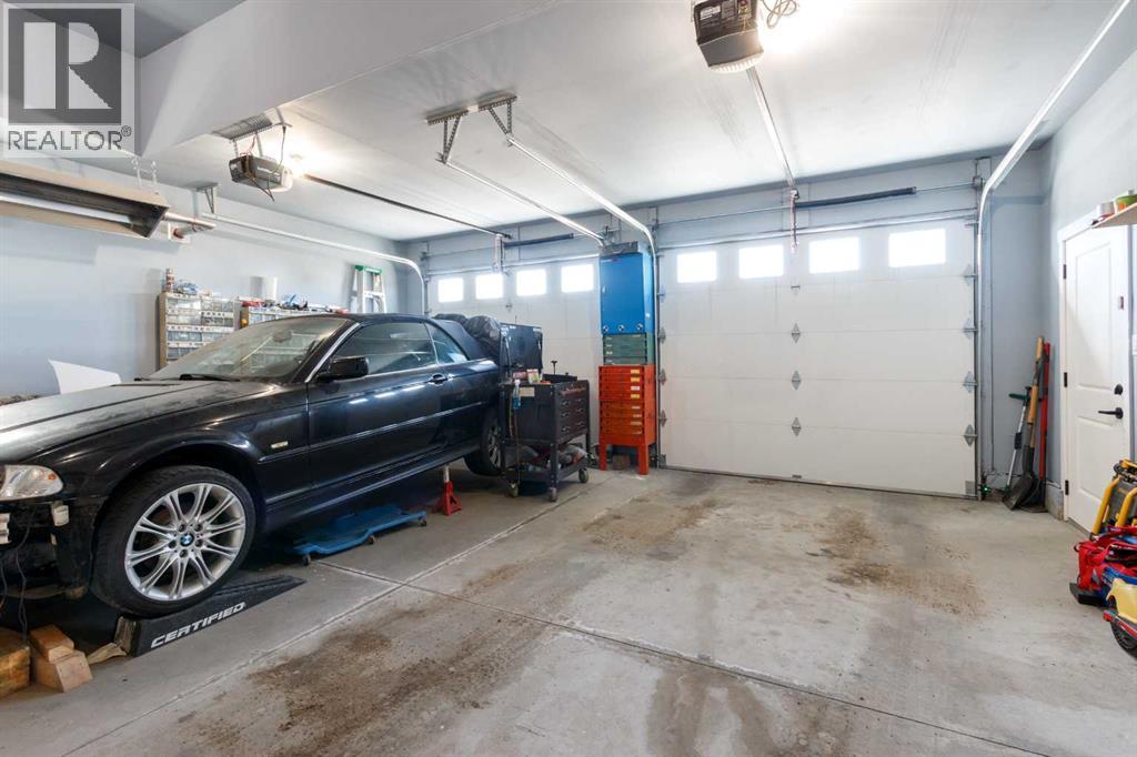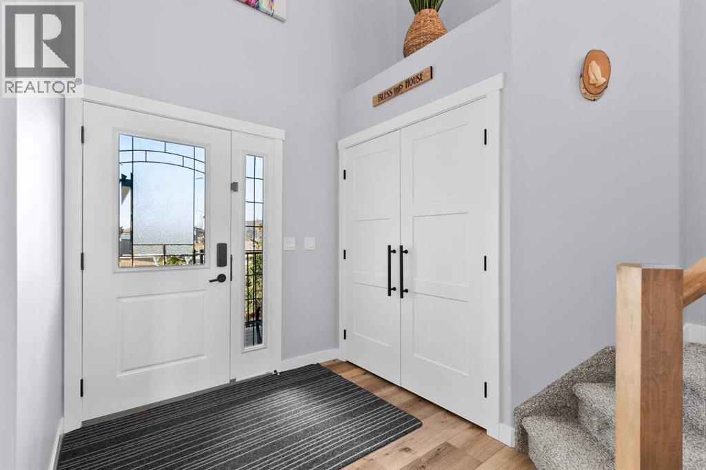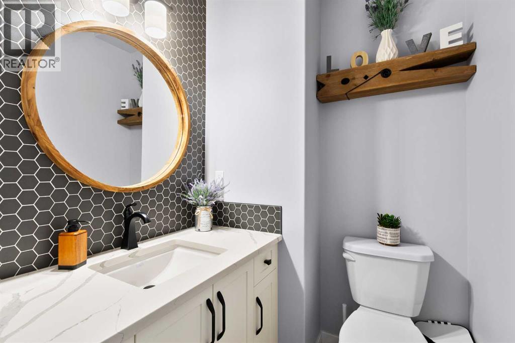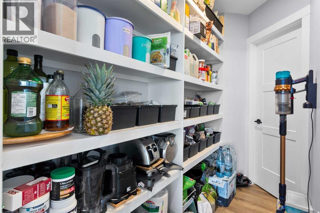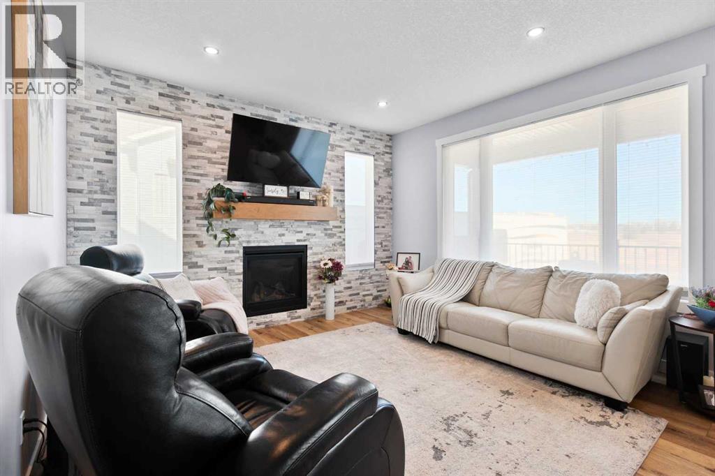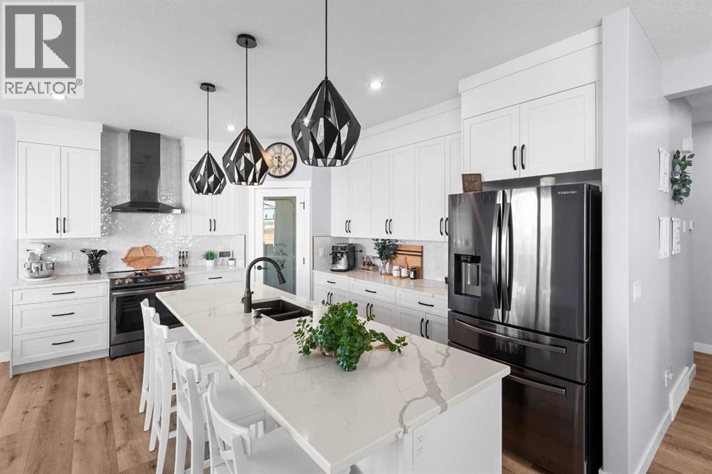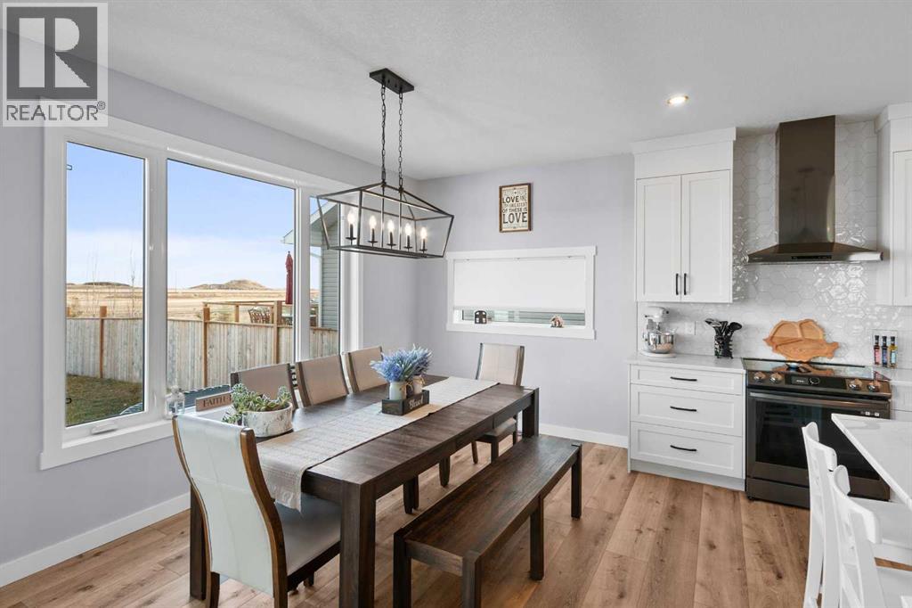 This spotless home was built by a local reputable builder (Anchored Custom Homes) and it backs the Nature Space in Carstairs. It has many added features such as extra windows, special trim, oversized island, wood shelves and much more that is evident when you walk through. The front entry is spacious with its full height ceiling. Go next Into the great room which has vaulted ceilings and vinyl plank flooring. The generous sized living room has a gas fireplace with windows on each side and a brick feature wall. The bright white kitchen has a large island with quartz counters and lots of counter space and cabinets. The microwave is tucked under the counter and the pantry is a walk thru one with wood shelves. The dining room is large enough for a big table and has a big window which faces the back yard and the view of the park/nature space WITHOUT ANY NEIGHBORS BEHIND. The door from the dining area leads to the covered back deck and the partially fenced yard. There is an area with gravel that is ready for a patio level. Back inside on the main floor is the powder room with quartz counter, a laundry room and the entry to the garage. The 23x24 ft garage is insulated, drywalled and painted and has an infrared heater. It easily fits 2 vehicles. Upstairs you will find a large primary bedroom with ensuite which has double vanities and a separate shower as well as soaker tub. The walk in closet is large. There are 2 more bedrooms on this level with nice windows and great closets. The main bathroom is large. The basement is ready for your development ideas with large windows and 9 ft ceilings. There is an alley on the west side of the house which makes RV parking easy. Make an appointment today to see this special home. You will not be disappointed. (id:58070)