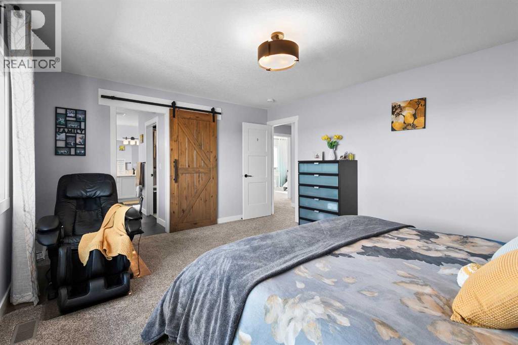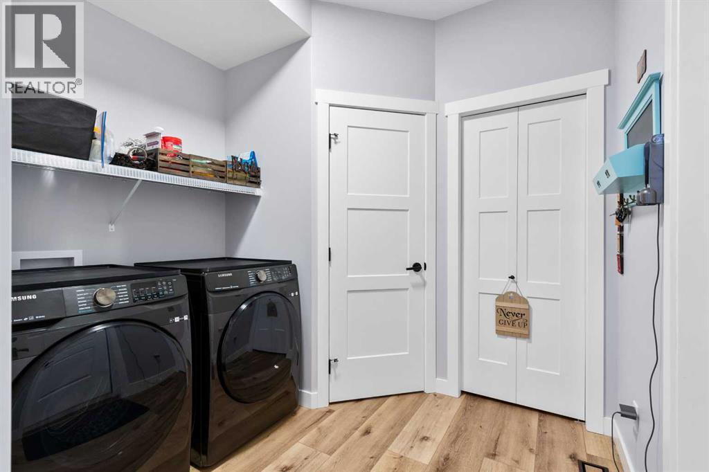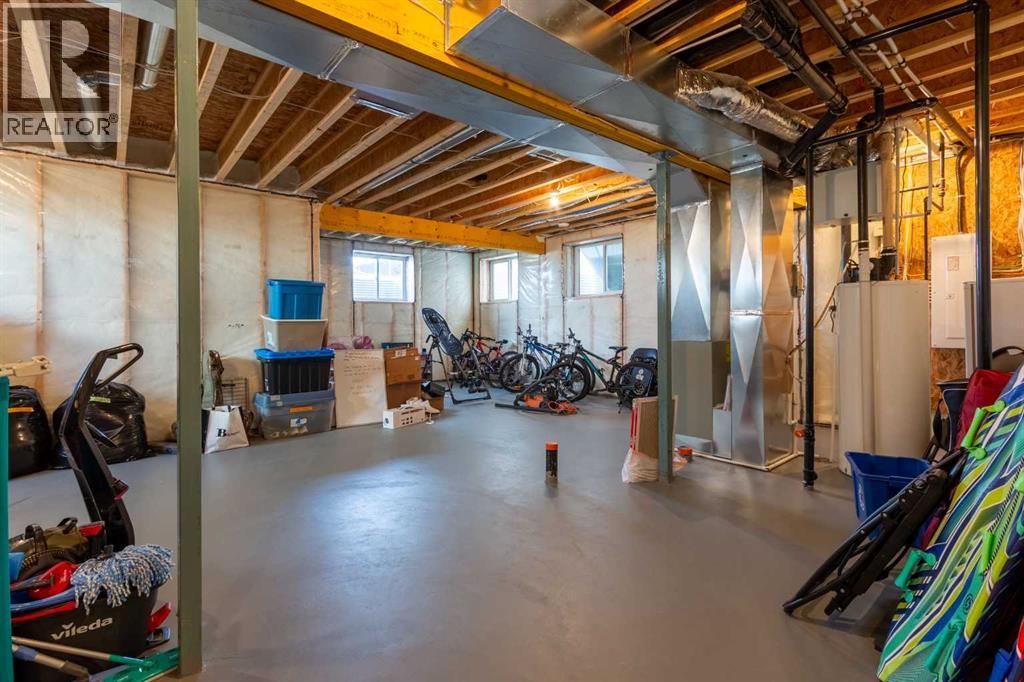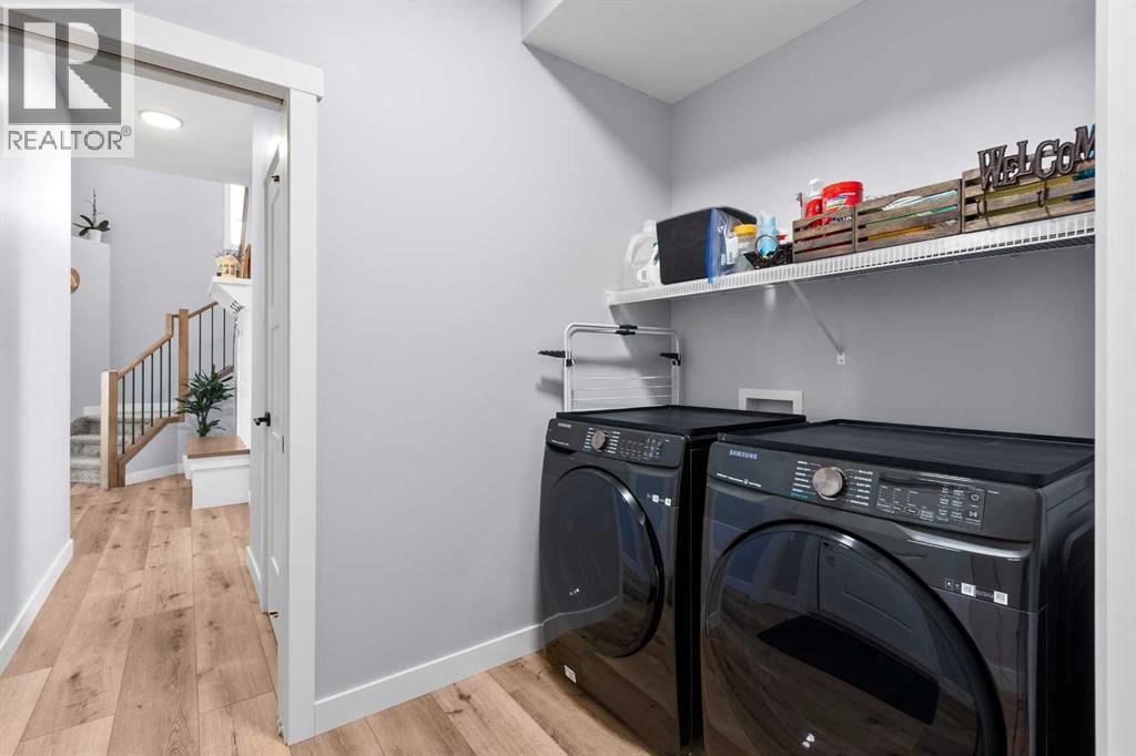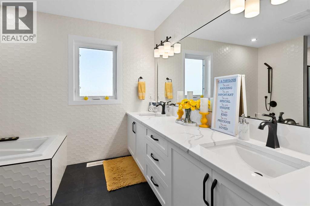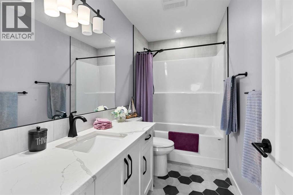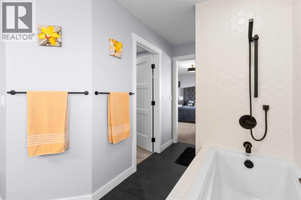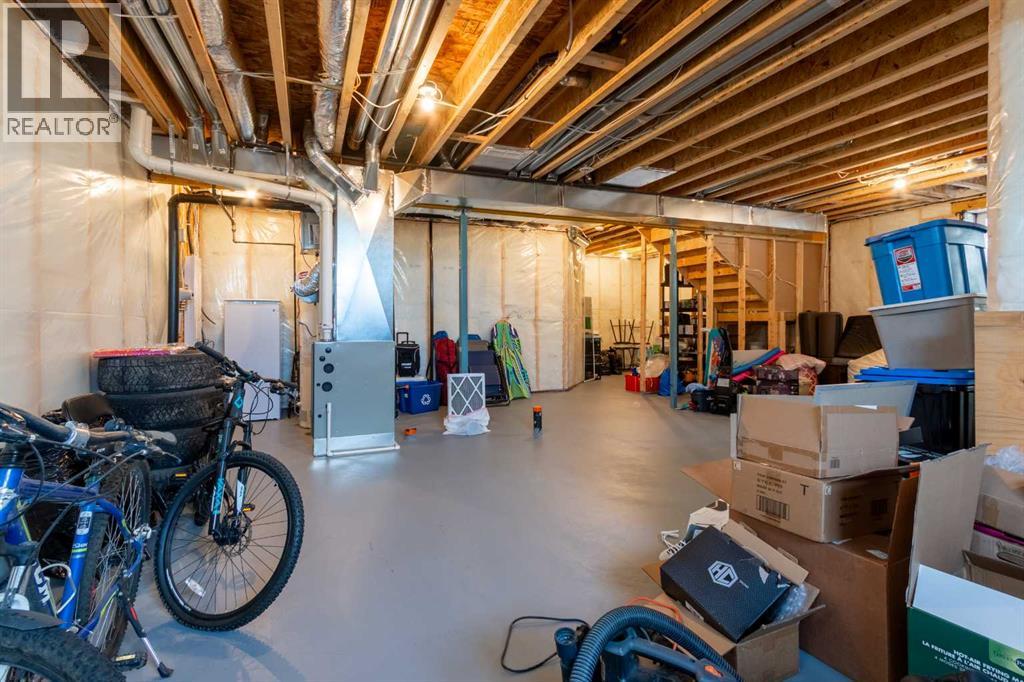 This spotless home was built by a local reputable builder (Anchored Custom Homes) and it backs the Nature Space in Carstairs. It has many added features such as extra windows, special trim, oversized island, wood shelves and much more that is evident when you walk through. The front entry is spacious with its full height ceiling. Go next Into the great room which has vaulted ceilings and vinyl plank flooring. The generous sized living room has a gas fireplace with windows on each side and a brick feature wall. The bright white kitchen has a large island with quartz counters and lots of counter space and cabinets. The microwave is tucked under the counter and the pantry is a walk thru one with wood shelves. The dining room is large enough for a big table and has a big window which faces the back yard and the view of the park/nature space WITHOUT ANY NEIGHBORS BEHIND. The door from the dining area leads to the covered back deck and the partially fenced yard. There is an area with gravel that is ready for a patio level. Back inside on the main floor is the powder room with quartz counter, a laundry room and the entry to the garage. The 23x24 ft garage is insulated, drywalled and painted and has an infrared heater. It easily fits 2 vehicles. Upstairs you will find a large primary bedroom with ensuite which has double vanities and a separate shower as well as soaker tub. The walk in closet is large. There are 2 more bedrooms on this level with nice windows and great closets. The main bathroom is large. The basement is ready for your development ideas with large windows and 9 ft ceilings. There is an alley on the west side of the house which makes RV parking easy. Make an appointment today to see this special home. You will not be disappointed. (id:58070)