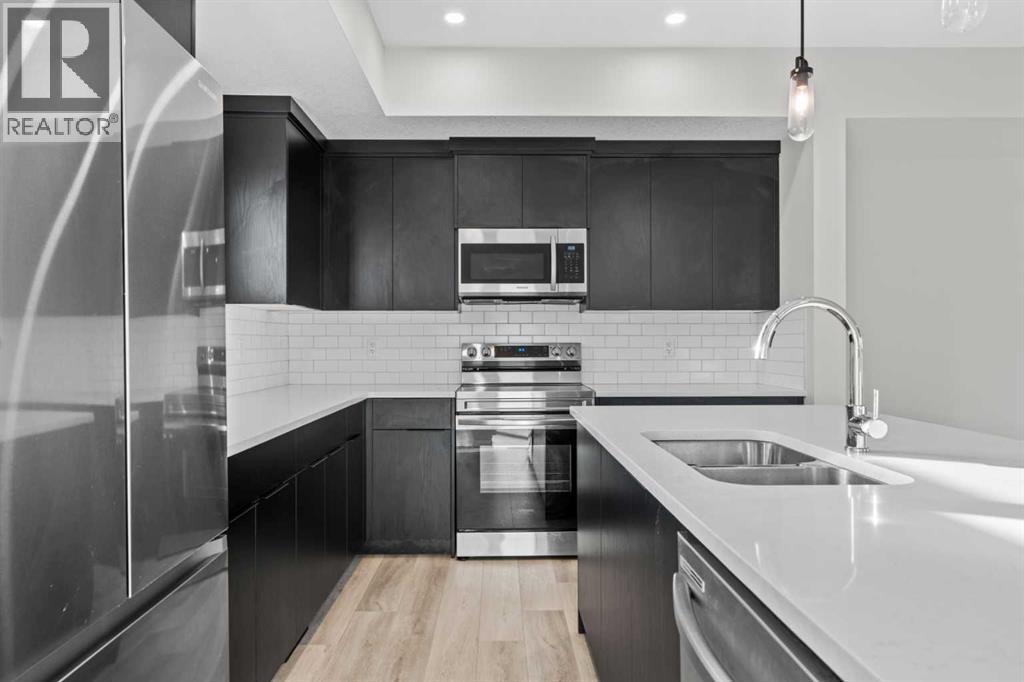 Fronting onto the COURTYARD, this stylish 3-BEDROOM + 2-DEN townhome by award-winning CEDARGLEN LIVING combines modern design with everyday functionality. Nestled beside SCENIC PONDS in a beautifully landscaped, PET-FRIENDLY complex, it offers a connected yet tranquil lifestyle. An INSULATED DOUBLE ATTACHED GARAGE with WATER BIB makes parking and projects easy, while a FLEXIBLE ENTRY-LEVEL SPACE adapts perfectly as a PLAYROOM, REC ROOM, OFFICE, or HOBBY AREA. The bright, OPEN-CONCEPT MAIN FLOOR is filled with NATURAL LIGHT from both NORTH and SOUTH EXPOSURES. A comfortable LIVING ROOM flows seamlessly into the DINING AREA and GOURMET KITCHEN featuring QUARTZ COUNTERTOPS, FULL-HEIGHT CABINETRY, STAINLESS STEEL APPLIANCES, TIMELESS SUBWAY TILE BACKSPLASH, and a LARGE CENTRE ISLAND with extra prep space and seating. Step out to the GLASS-RAILED BALCONY with a GAS LINE for relaxed summer BBQs overlooking the courtyard. A BRIGHT, ENCLOSED DEN on the main level creates the ideal spot for a HOME OFFICE or CREATIVE SPACE, complemented by a convenient POWDER ROOM. Upstairs, THREE SPACIOUS BEDROOMS, a 4-PIECE BATHROOM, and LAUNDRY await. The serene PRIMARY SUITE offers a HUGE WALK-IN CLOSET and a SPA-INSPIRED ENSUITE with DUAL SINKS, QUARTZ COUNTERTOPS, and an OVERSIZED SHOWER. Rough-ins for FUTURE CENTRAL A/C add extra comfort. This vibrant community offers WALKING PATHS, PONDS, and GREEN SPACE, plus access to a PRIVATE CLUBHOUSE with SPORTS COURTS, SPRAY PARK, SKATING RINK, and more. With FISH CREEK PARK’s extensive trails close by, and easy access to RESTAURANTS, SHOPS, and the WORLD’S LARGEST YMCA in SETON, the location is second to none. MOVE-IN READY, this home delivers MODERN FINISHES, SMART DESIGN, and a WELCOMING LIFESTYLE in one of Calgary’s most active communities. (id:58070)