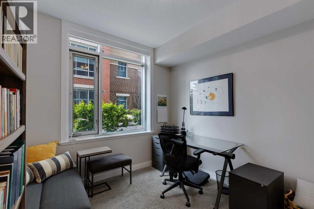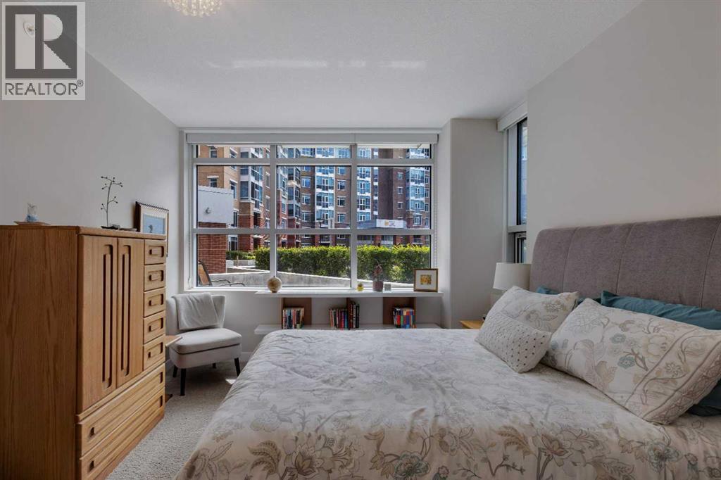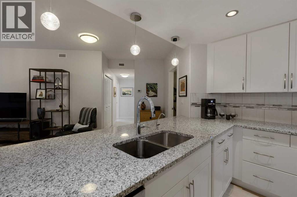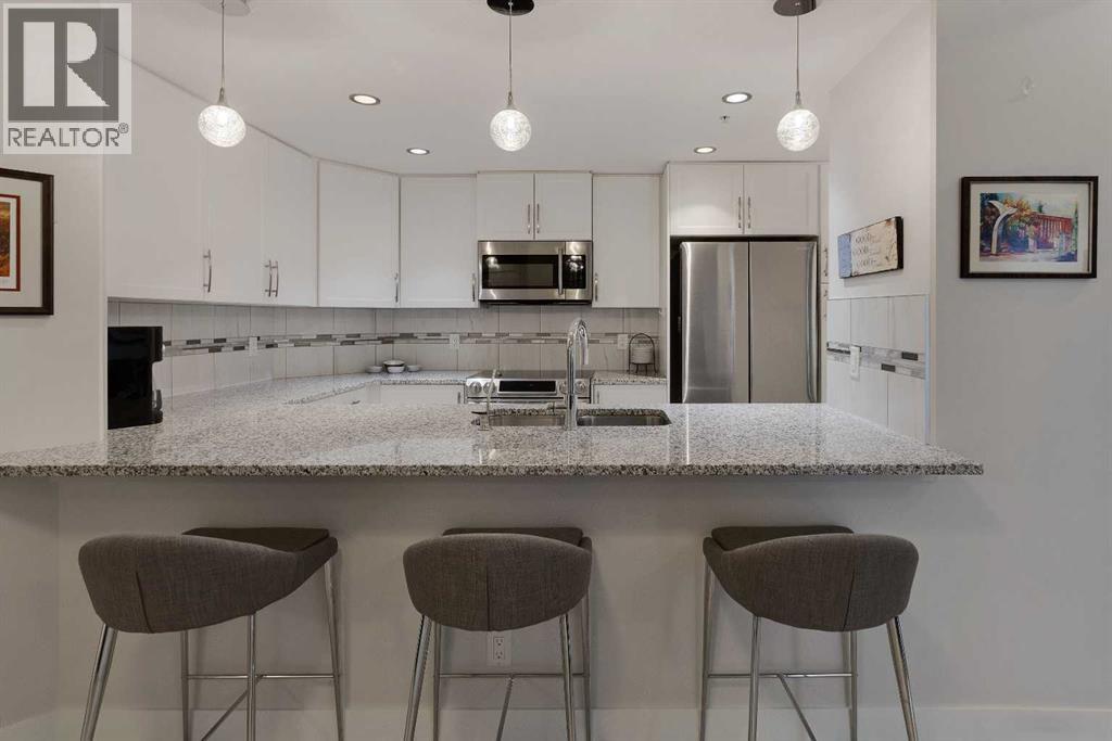 Welcome to stylish condo living in the highly sought-after community of Varsity Estates. This beautifully upgraded 2-bedroom, 2-bathroom main floor unit offers the perfect combination of style, comfort, and unbeatable convenience. Originally a former show suite, this home is loaded with upgrades including granite countertops, upgraded maple cabinetry, and beautiful flooring that create a modern feel throughout. The kitchen flows seamlessly into the bright living area, creating an inviting space for both everyday living and entertaining. Gorgeous laminate flooring enhances the main living area while the well-planned layout offers excellent separation from bedrooms for added privacy. The primary bedroom is a true retreat, featuring large south-facing windows that fill the room with natural light, a walk-in closet and a 5-piece bathroom, featuring dual sinks, a soaker tub and a separate shower. A second bedroom and full bathroom provide flexibility for guests, family or a home office. Step outside to enjoy the large patio space, offering covered and uncovered areas, perfect for morning coffee and summer evenings. Additional highlights include in-suite laundry, pantry, titled underground parking and a separate storage locker. Residents of the Groves of Varsity enjoy outstanding year-round amenities including a fully equipped fitness centre, steam rooms, meeting and party spaces and a spectacular roof-top terrace with mountain views. Located steps from coffee shops, parks, medical offices and shopping, this location truly offers everything at your doorstep. (id:58070)