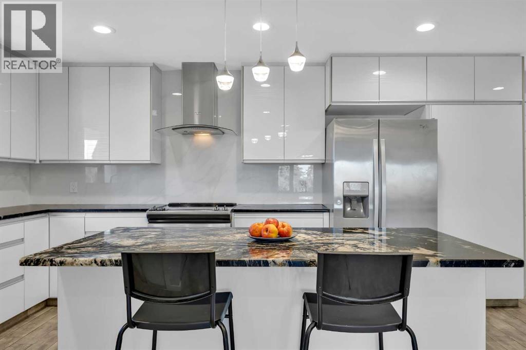 Fully renovated 4-level split in West Haysboro offering over 2,500 sq. ft. of living space. A legal walk-out basement suite, ideal for second family, provides a full kitchen, living room with a 72” electric fireplace, two bedrooms, a 3pc bathroom, and in-floor heating.An open-concept kitchen highlights the main floor, featuring oversized cabinets, stainless steel appliances, granite counters, an eating bar, and a pantry. Adjacent to the kitchen is a living room with a second 72” electric fireplace, built-in wall units, and a custom tiled feature wall. The formal dining area comfortably fits a large family table and includes a built-in bar.Upstairs, the master retreat includes a walk-in closet and a 5pc spa-inspired ensuite complete with dual sinks, a glass shower with bench and water jets, a soaker tub, and heated floors. A second spacious bedroom completes the upper level.Notable upgrades include aluminum windows with retractable screens, new doors with multi-point locking systems, Alfa tile flooring, granite counters throughout, custom closet organizers, a newer Kinetico water softener, and a newer high-efficiency furnace. Smart home additions such as LED lighting, a smart thermostat, and code/chip/fingerprint deadbolts enhance convenience and security.Outdoor living is just as impressive with a west-facing yard featuring low-maintenance landscaping, a patio, hot tub, storage shed, and natural stone retaining. Parking is exceptional with an oversized insulated and heated double detached garage with alley access, plus a covered carport.Located close to the BRT line, Southland C-Train Station, an off-leash dog park, and nearby amenities. Positioned north of Southland Drive and west of Elbow Drive. (id:58070)