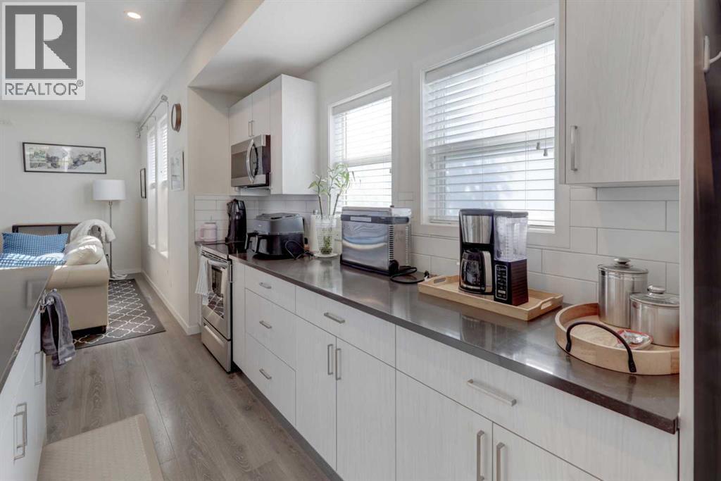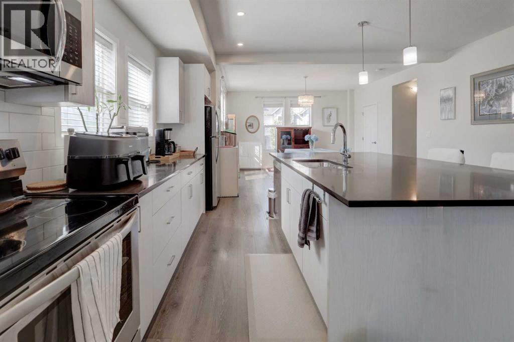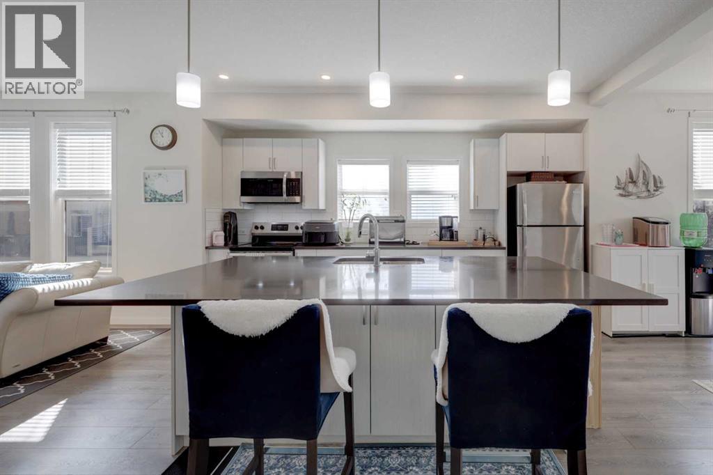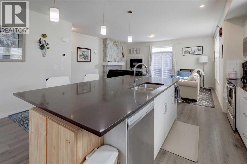 EXCEPTIONAL END UNIT in Airdrie's sought after community of South Point. This stunning 3-level townhouse offers over 2000 sq. ft. of contemporary living with a floorplan designed for both comfort and functionality. The main level features a spacious flex room, perfect for a home office, gym or rec room. Upstairs, the heart of the home is a chef inspired kitchen, showcasing a large island, quartz countertops, and plenty of cabinetry to meet all your storage needs. The open- concept layout flows seamlessly into the dining room and living areas, ideal for entertaining. The primary bedroom is a private retreat with dual sinks in the spa-like ensuite. Laundry is conveniently located on the upper level, making daily living effortless. Situated in an amenity-rich neighbourhood, this home is close to schools and everyday essentials-providing the perfect balance of lifestyle and location. (id:58070)