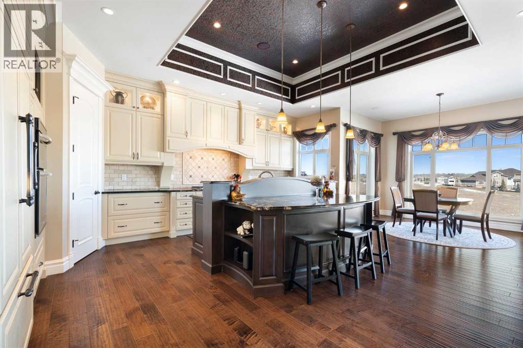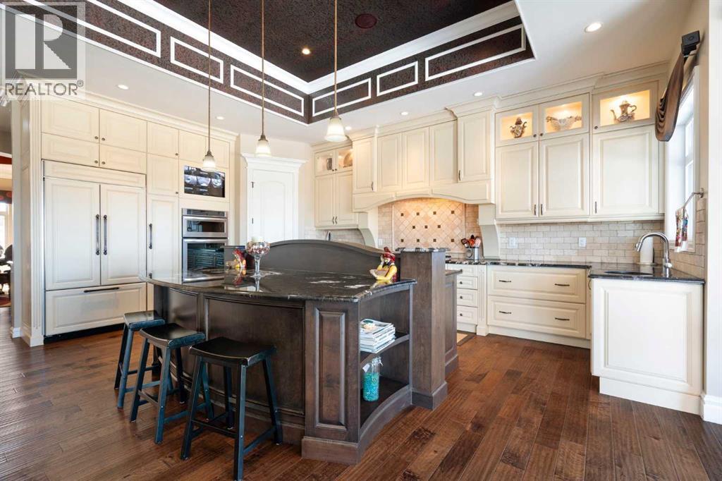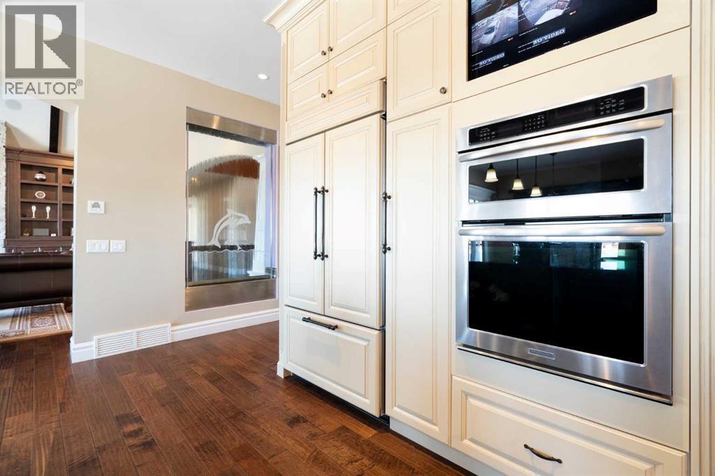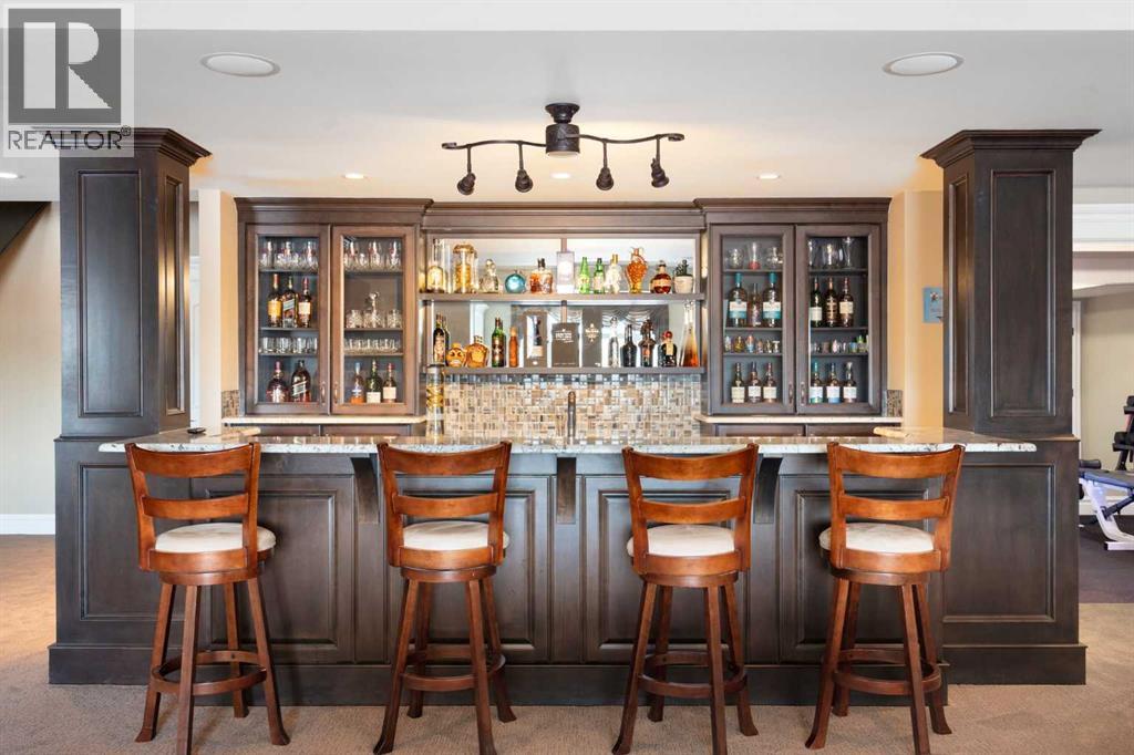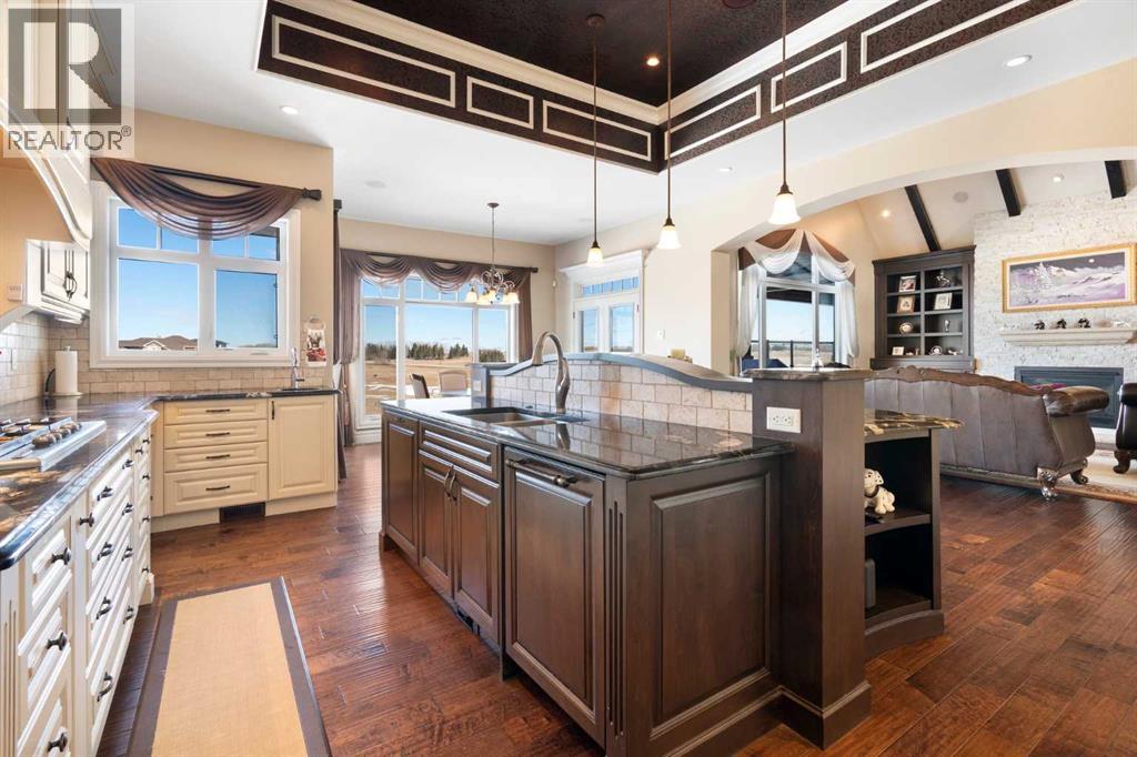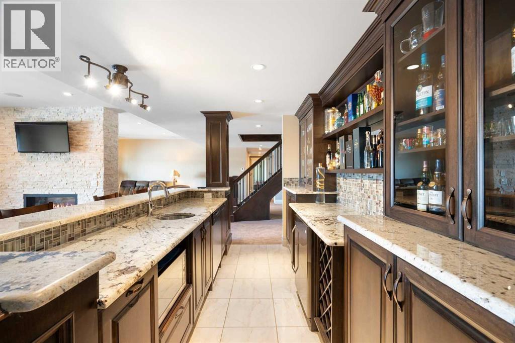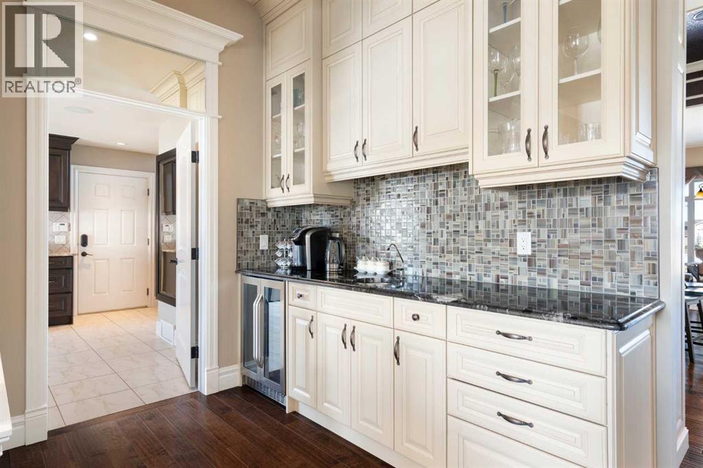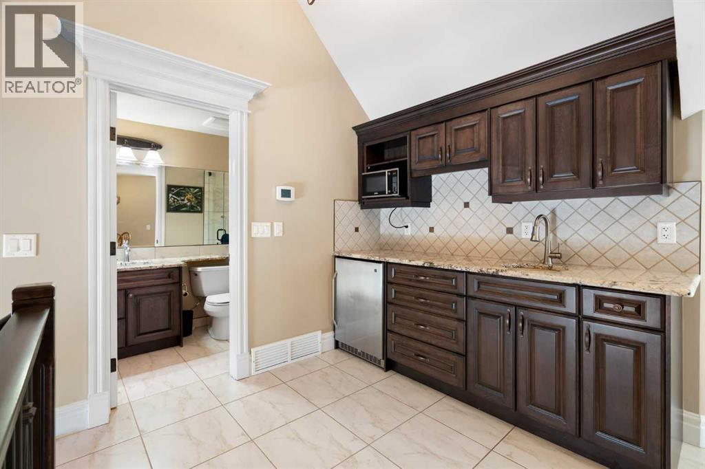 Welcome to the epitome of luxury living in Bearspaw Country Estates, where exclusivity meets unparalleled craftsmanship. Prepare to be wowed! This stunning walkout bungalow is nestled amidst peekaboo mountain views on 2.35 acres of land and offers 5 bedrooms and 6 bathrooms. Just 5 minutes from city limits and 10 minutes from Cochrane, immerse yourself in a tight-knit community centered around a picturesque pond, gazebo, and waterfall.From the moment you step inside, you'll notice the meticulous attention to detail that sets this home apart. Be captivated by the featured ceilings and the durability of solid core doors. Enjoy the luxury of slab heating in the basement, garage, and ensuite, ensuring comfort throughout. An advanced sound system boasts 18 zones, 6 sources, and 50 speakers throughout the home, as well as a comprehensive security system conveniently controlled through your phone. Experience a level of excellence that surpasses expectations at every turn. The vaulted living room sets the stage for relaxation, while the formal dining room exudes elegance. A split quartz fireplace adds warmth and style, while the amazing kitchen is a culinary haven equipped with a wall oven, double sink, gas stove, and gleaming black granite countertops. A breakfast nook surrounded by glass offers a casual dining option, with sliding doors leading to the deck, complete with a covered portion for BBQ enthusiasts. A unique walk-through pantry adds convenience, connecting seamlessly to the quad heated garage.Down the hall you will find an incredible main floor office flooded with natural light and exquisite ceiling details that seamlessly flow into the expansive and well-designed primary bedroom. Enjoy a gorgeous ensuite with a soaker tub, steam shower, double vanity, and double walk-in closet. Retreat to relaxation with private access to the covered deck. The bright and spacious lower level of this home is designed for comfort and entertainment. With three generously sized bedrooms, there's plenty of space for guests or family. Enjoy the convenience of the walkout basement, providing easy access to the outdoors. Relax by the fireplace or entertain at the stunning full bar, equipped with a dishwasher, fridge, and microwave. A nearby half bath adds to the convenience. There's also a cold storage room, perfect for a wine cellar if desired. Experience unforgettable movie nights in the top-notch theatre room, featuring impeccable soundproofing and a projector system showcasing a 110-inch screen. A quad heated garage provides ample space for vehicles and storage needs. Above the garage lies a charming and versatile living area, featuring a kitchenette, living space flooded with natural sunlight, a full bath, and a cozy bedroom.Welcome home to luxury, comfort, and tranquility in Bearspaw Country Estates! (id:58070)