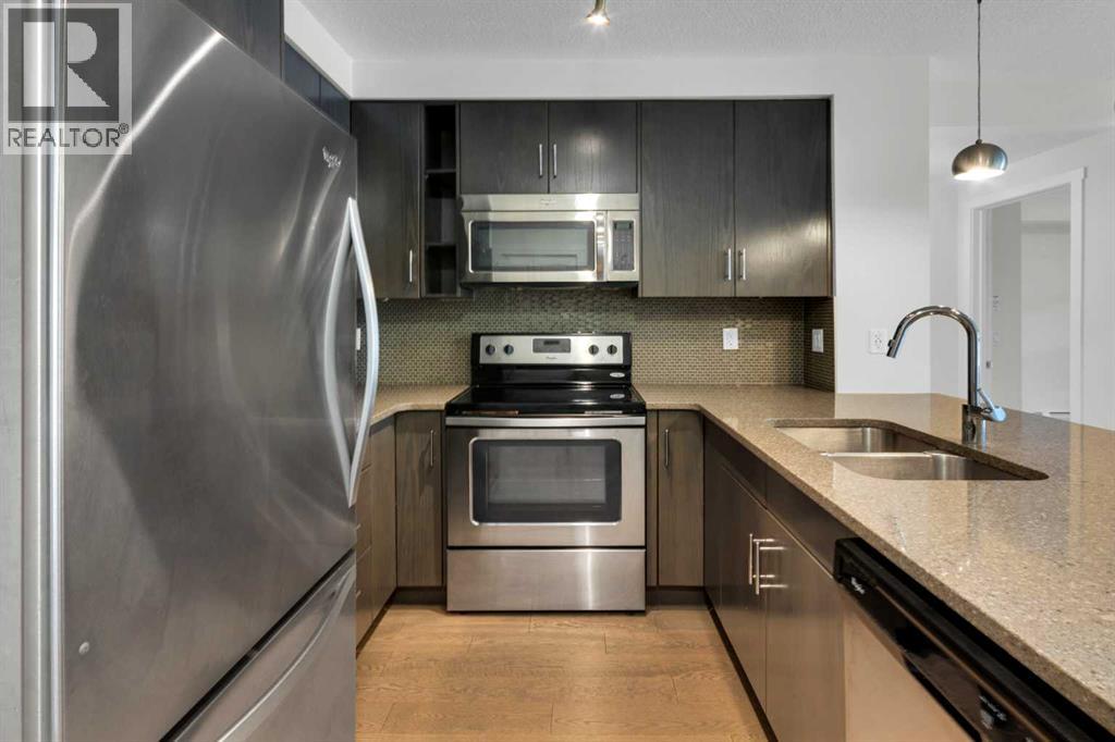 Welcome to this bright, freshly painted and well-maintained 2 bedroom, 2 bathroom condo in the sought-after Canoe complex in Auburn Bay. Offering 853 sq ft of functional living space, this ground-floor unit combines comfort, convenience, and low-maintenance living.The open-concept layout features a modern kitchen with dark cabinetry, stainless steel appliances, tile backsplash, and granite countertops, along with a spacious peninsula with seating — perfect for everyday living or entertaining. The living area is filled with natural light and flows seamlessly to your private outdoor space. Durable laminate flooring runs throughout the main living areas, creating a clean and cohesive look, while both bathrooms feature tile flooring for added durability and style. The primary bedroom includes a walk-through closet and private 4-piece ensuite. The second bedroom is thoughtfully positioned on the opposite side of the unit, ideal for guests, a roommate, or a home office. A second full bathroom and in-suite laundry complete the interior. This unit also includes one titled underground parking stall and assigned storage for added convenience. Located just steps from shopping, restaurants, transit, and with full access to Auburn Bay Lake amenities, this is an excellent opportunity for first-time buyers, investors, or those looking to downsize. (id:58070)