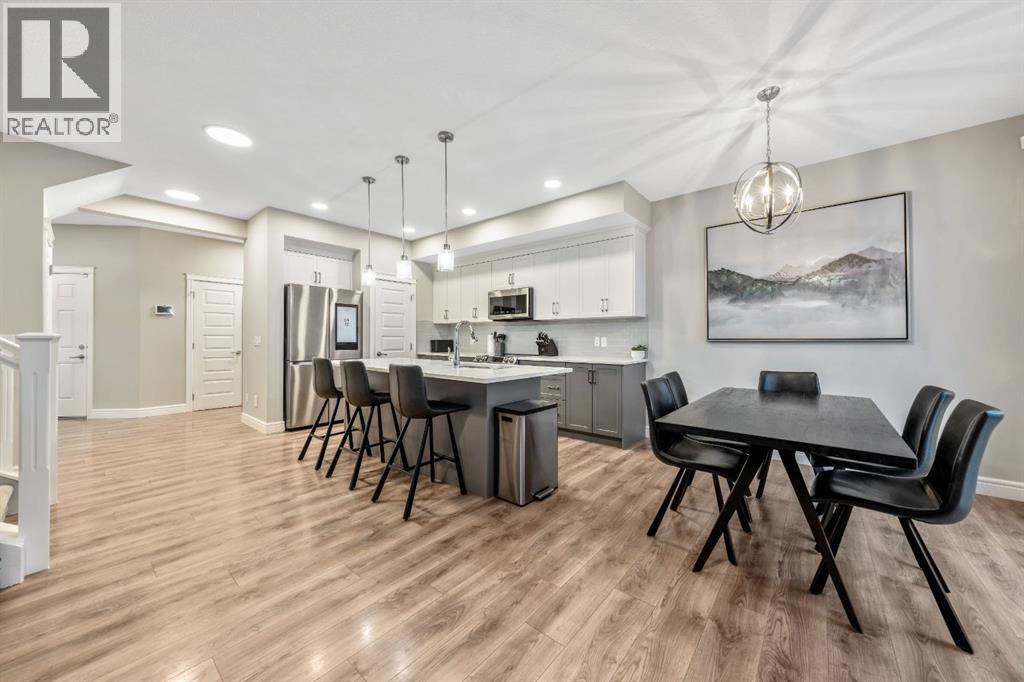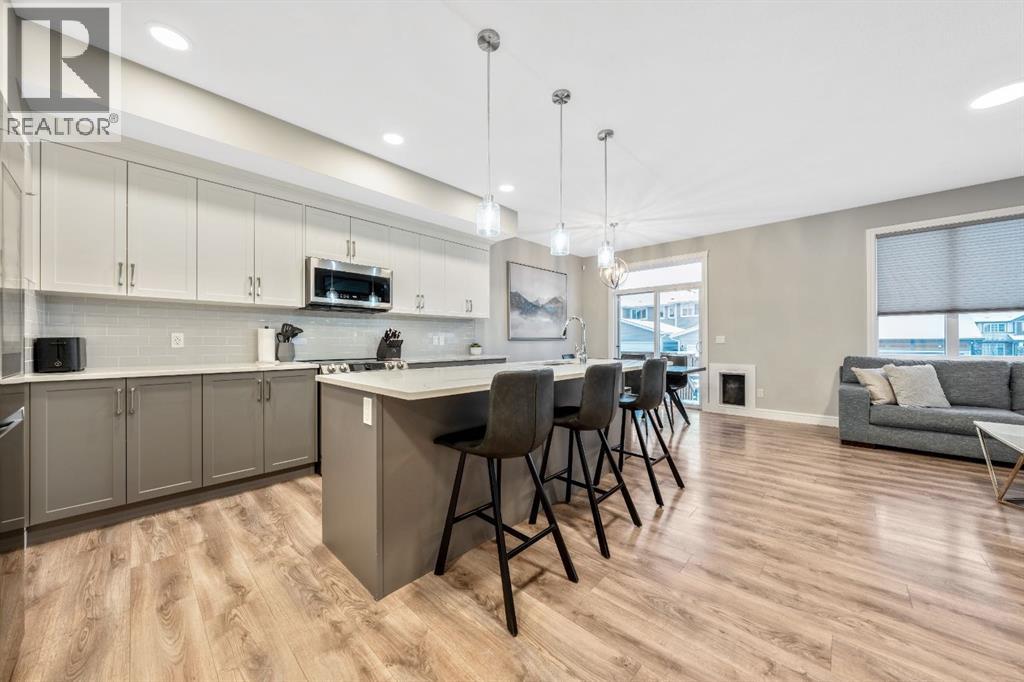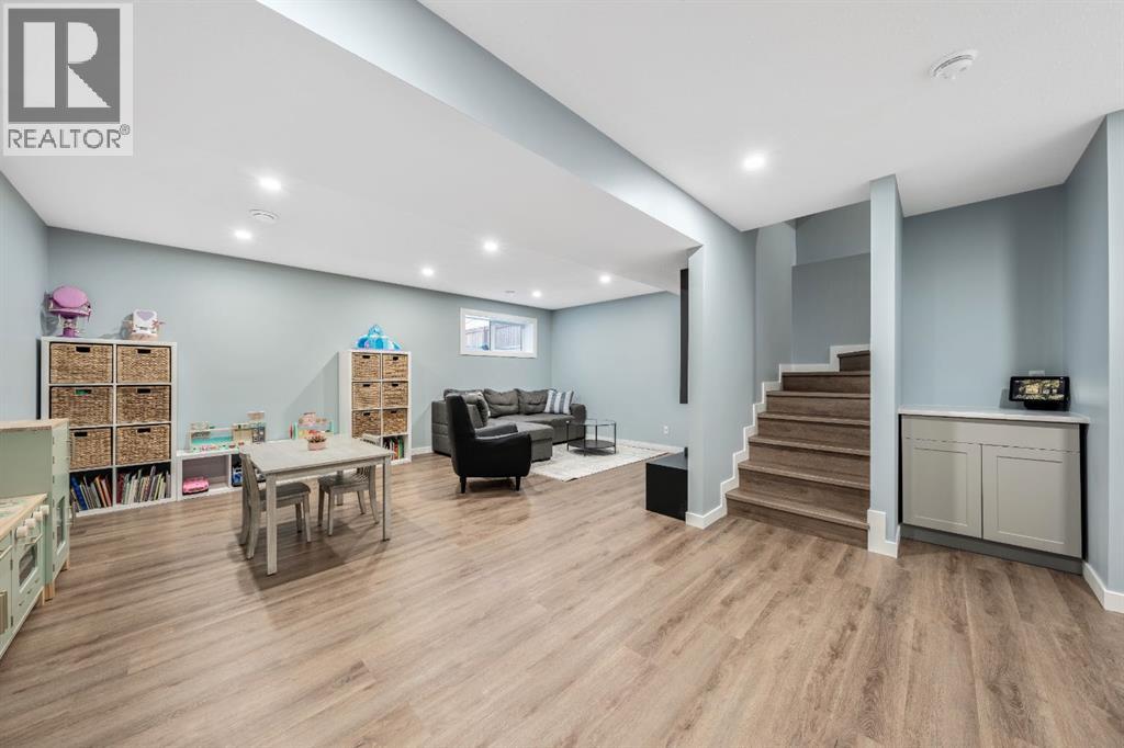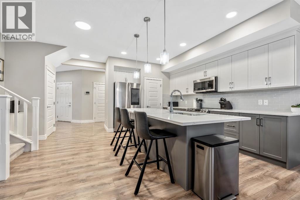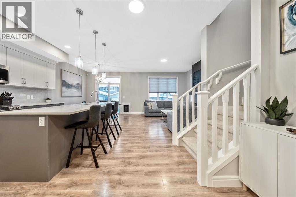 Welcome to this beautifully upgraded, FULLY FINISHED home offering modern finishes, thoughtful design, and exceptional comfort from top to bottom. Set on a fully fenced lot and complete with a HEATED DOUBLE GARAGE, this property is truly move-in ready with nothing left to do. Step inside to a bright, inviting main floor where style meets modern function. The open-concept layout features a stunning kitchen with upgraded appliances—including a smart fridge, induction stove, dishwasher, and microwave—plus a large island perfect for meal prep and gathering. The spacious living room offers a sleek electric fireplace with a custom pull-out mantel designed to discreetly house your media components. The generous dining area flows seamlessly to the private, fully fenced backyard with a storage shed and a gas line on the deck for those summer BBQ nights. Upstairs, the primary bedroom impresses with a luxurious 5-piece ensuite and a walk-in closet. Two additional well-appointed bedrooms share a beautifully finished 4-piece bathroom. The upper level also features a large laundry closet equipped with Samsung appliances, custom cabinets, and built-in shelving for added convenience. The professionally finished (permitted) basement expands your living space with a second electric fireplace, an included TV, and a full 4-piece bathroom with an extra-deep soaker tub—ideal for relaxing after a long day. The heated double attached garage is both comfortable and functional, complete with included wooden shelving for extra storage. Additional features and upgrades include: a tankless water heater, central air conditioning, central vacuum, Gemstone exterior lighting, two electric fireplaces, all window coverings (including blackout blinds), fully fenced yard, and an included storage shed. Located in Heartland, this home offers quick access to nearby amenities and an easy escape to Ghost Lake, Canmore, and the Rocky Mountains—perfect for weekend adventures and everyday convenience. (id:58070)