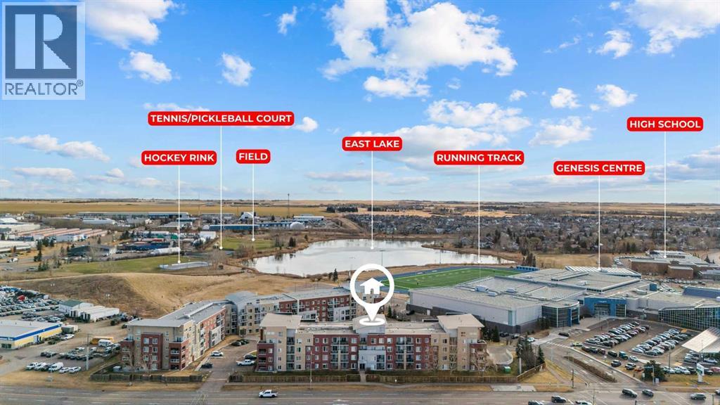 Top-floor 2 Bedroom + Den condo with 2 full bathrooms, heated underground parking, and west-facing mountain views. Enjoy a bright, open layout filled with natural light, large windows, and a private balcony surrounded by mature trees for added privacy. Sunlight pours through the west-facing windows, highlighting an open floor plan designed for comfort and everyday living. The kitchen anchors the space with a large eating bar — perfect for morning coffee or casual evenings with friends — flowing seamlessly into the inviting living area. Step out onto your private balcony and take in the unobstructed mountain views — your own peaceful escape at the end of the day.This home offers a versatile den ideal for a home office or guest room, along with two spacious bedrooms. The primary suite features a walk-through closet and private ensuite, while in-suite laundry adds everyday convenience.Additional highlights include titled heated underground parking, bike storage, a welcoming lobby, and ample visitor parking. Located steps from the Genesis Centre and East Lake, with easy access to shopping, dining, schools, transit, and Highway 2. (id:58070)