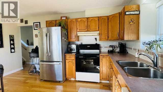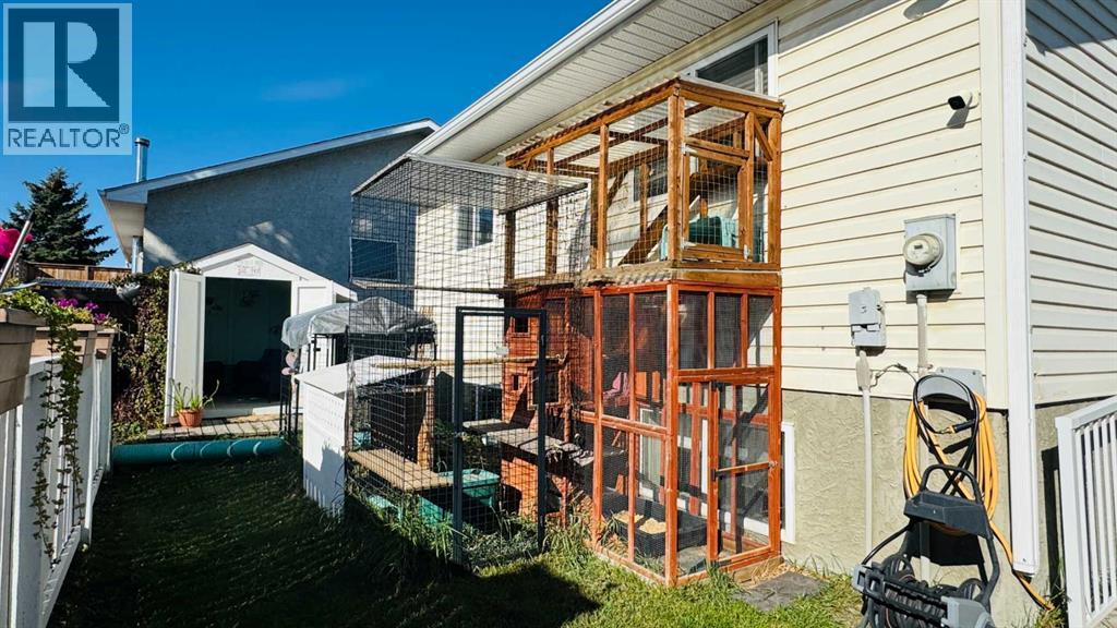 Tucked away on a quiet street, you're just a short walk to schools, shopping, Sunshine Lake, and the scenic Happy Trails pathway system—ideal for families and outdoor enthusiasts alike.Inside, you'll find 4 bedrooms and 2 full bathrooms, including a private primary ensuite. The upper level offers three generous bedrooms, while the fourth bedroom is located on the lower level—perfect for guests, teens, or a home office setup.The main floor features a bright, spacious living room with a cozy gas fireplace, a cozy dining area, and an open-concept kitchen—perfect for everyday living and entertaining. A convenient side mudroom/laundry area with direct access to the backyard helps keep the home tidy and organized.The lower level includes a comfortable family room, the fourth bedroom, and a mechanical room, with access to a full crawl space offering abundant seasonal storage. For those that love the sun - this house offers windows for sun from all directions. Enjoy the morning sun in the kitchen, afternoon / evening sun from the upper bedrooms or lower family room and all-day sun that lights up the house from the skylight that is over the stairs to the upper floor. Step outside to a beautifully landscaped and fully fenced backyard, ideal for kids, pets, or relaxing in privacy. Enjoy your morning coffee on the charming front verandah or the sunny side deck. You'll also love the newly developed "she shed", currently used as an outdoor office/sitting room—just add a few twinkle lights, and it becomes the perfect spot to unwind at the end of the day. For additional covered storage - there are 2 sheds on West side of the house. Cat lovers, take note! This home features custom “catios” at the front and back, allowing your furry friends to enjoy the outdoors safely within the yard.Additional features include: Off-street parking on an oversized concrete pad, updated shingles - replaced in 2024 and Mature trees and thoughtful landscaping including 3 established raised garden beds. This home blends space, functionality, and a great location. Don’t miss your opportunity to make it yours! (id:58070)