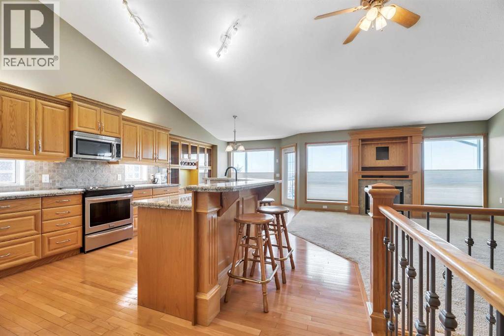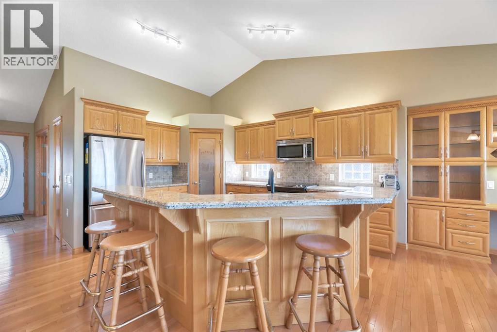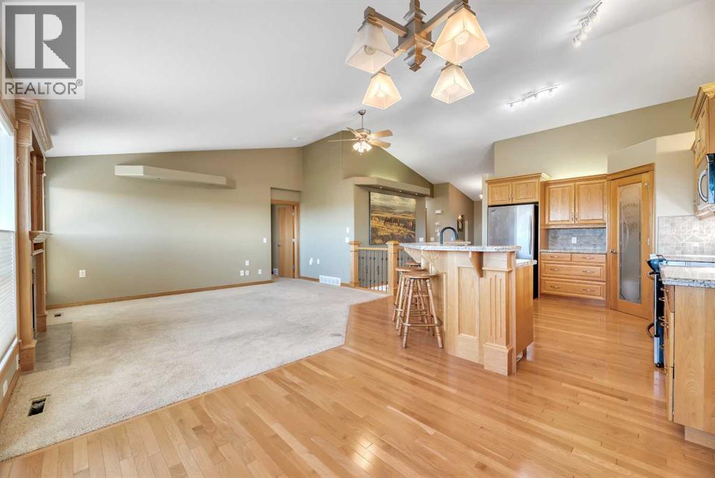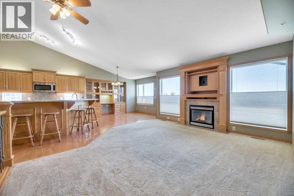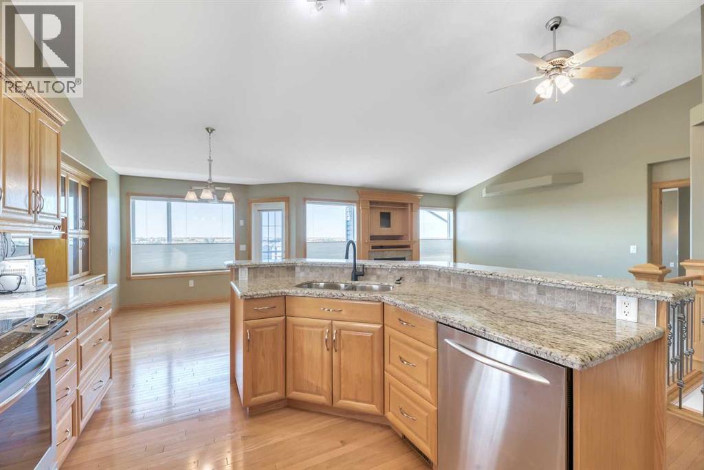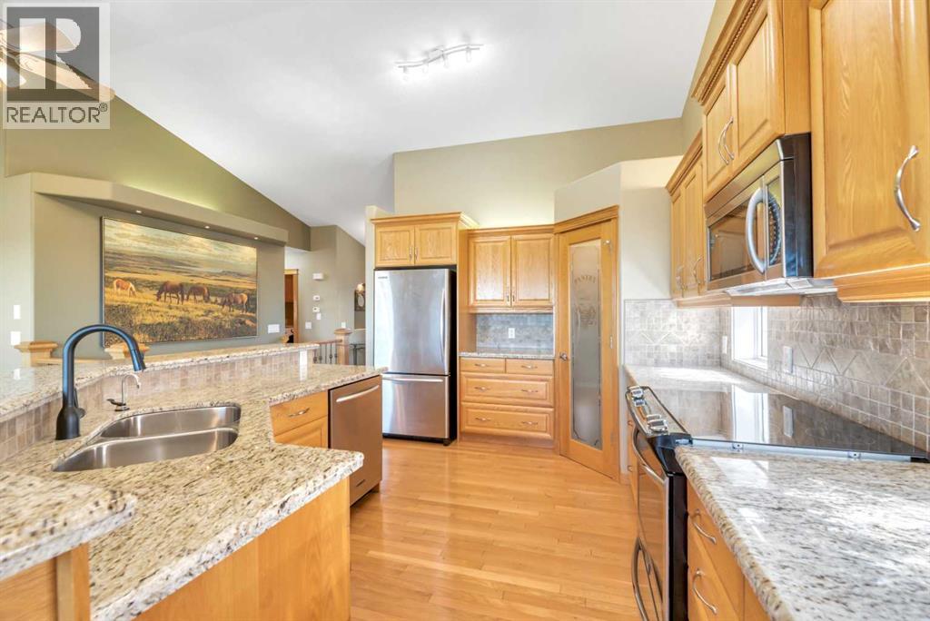 This beautifully designed walkout bungalow combines comfort, style, and an unbeatable setting. Enjoy peaceful mornings on the inviting front porch and take in the serene views of the green space behind, all with low-maintenance landscaping to keep life simple. Step inside to a spacious main floor with vaulted ceilings and gleaming hardwood floors. A French door leads to the den, perfect for a home office. The living room features a cozy gas fireplace, while the bright kitchen offers a breakfast bar, granite countertops, pantry, and flows seamlessly to the dining area with custom built-ins. The primary suite includes a walk-in closet and a spa-like ensuite with a corner soaker tub. Main floor laundry is a bonus, complete with sink and cabinets for added convenience. The fully developed walkout basement expands your living space with a wet bar, built-ins, large rec room, additional bedroom, and a 4-piece bath—ideal for entertaining or family gatherings. Stay cool year-round with air conditioning, and enjoy the practicality of a double attached garage. This home offers the perfect blend of elegance and easy living in a prime location. (id:58070)
