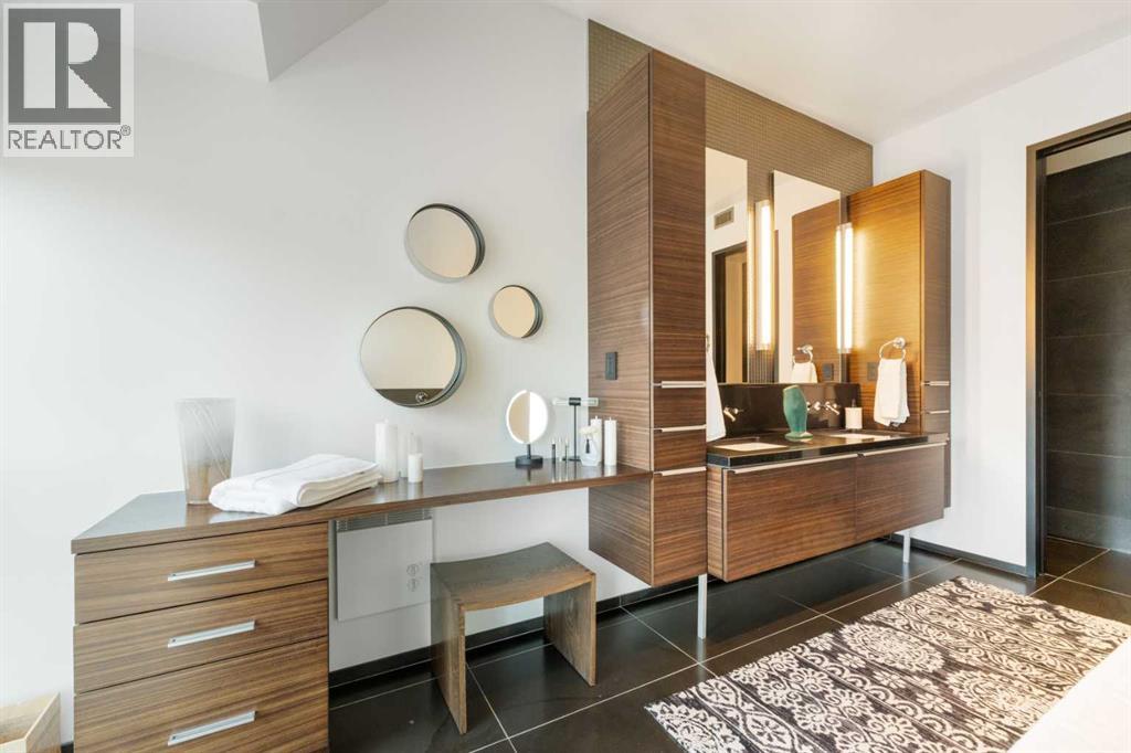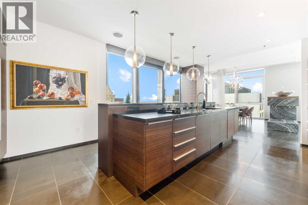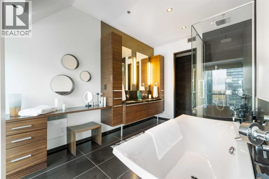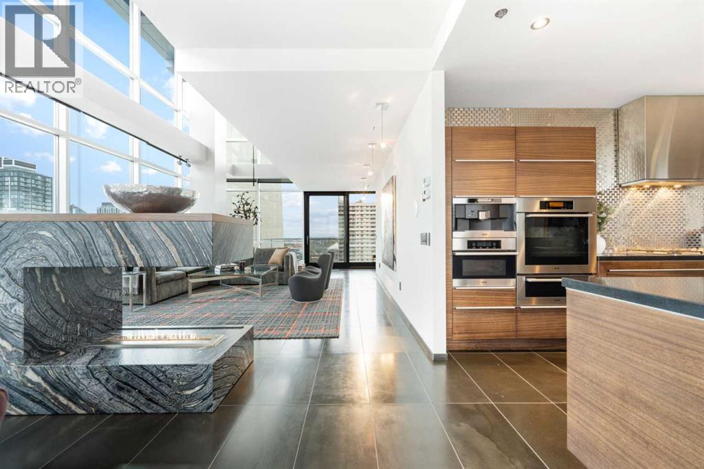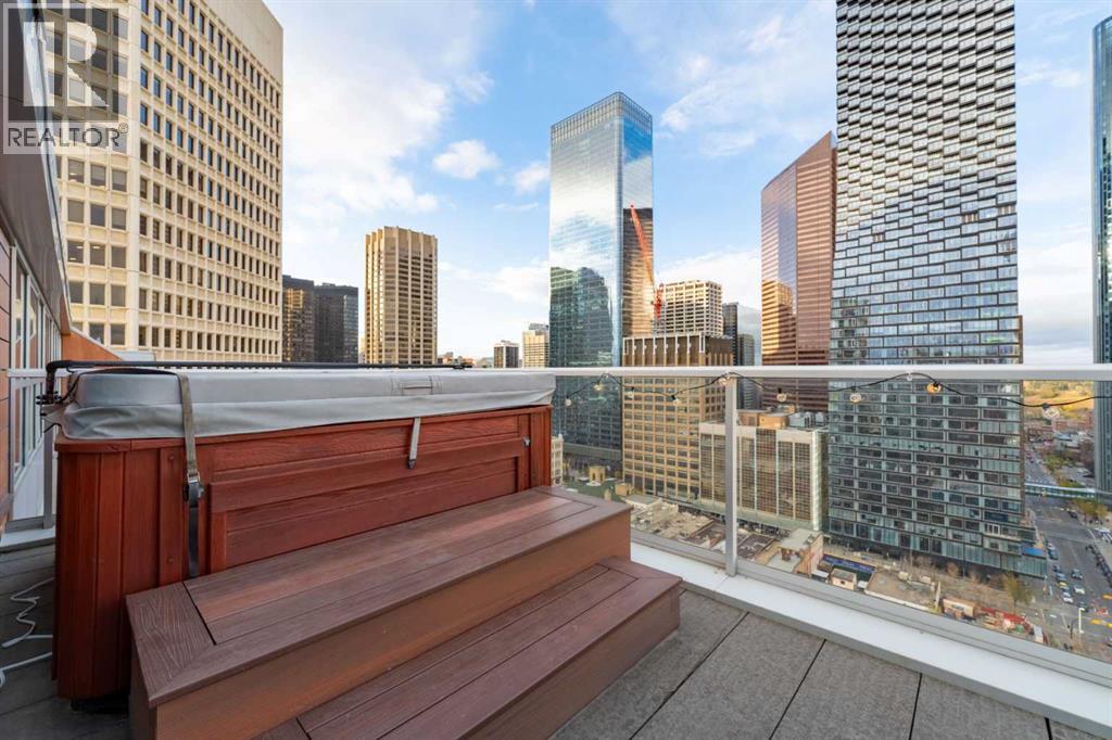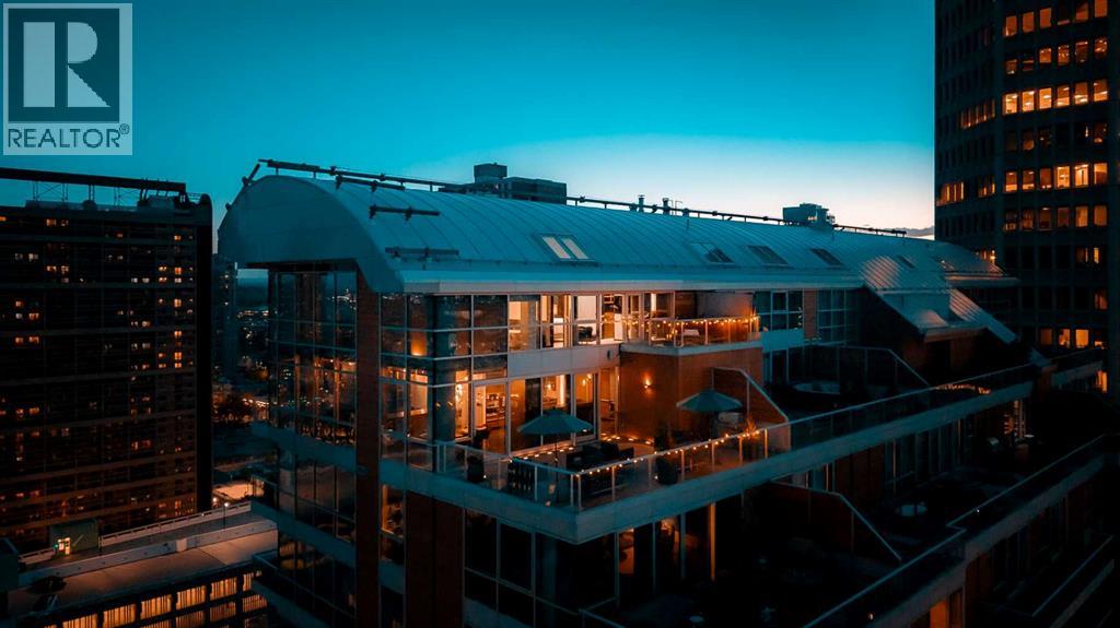 Executive Two-Story Penthouse with Expansive Downtown Views of Calgary and beyond. Showcasing breathtaking North, South and East exposure. Ideally located next to Calgary's Arts Common Building, Glenbow Museum, Calgary Tower, the historical Palliser Hotel, as well as Stephen Avenue Street Mall with its endless restaurants, cafes, shops and lounges. The residence at the Le Germain offers a true elevated lifestyle with world-class amenities such as Concierge, Spa and Gym access, housekeeping services, dry cleaning services, 24/7 building surveillance, pet wash, car wash, maintenance, as well as a hotel account privileges and in-suite dining delivered to your door from the award winning Charcut Restaurant all at your fingertips. With two elevators taking you to the 20th floor, you will enter 2,399 sq.ft. of luxury living with soaring ceilings through out including a vaulted living room, custom fireplace featuring leathered silver wave marble and Zebra Walnut built in cabinetry through out. The chef-inspired kitchen offers Miele appliances including built-in oven, 5 burner gas cook top, warming drawer, microwave/convection oven, range hood, built-in coffee machine, dishwasher and refrigerator. Also featured is the stackable Asko Washer and Dryer and Cavavin by LG wine refrigerator. With black quartz countertops adorning the cooking space as well as the expansive island. With endless built in storage along the West wall including the Concierge closet to receive your deliveries and dry cleaning. Across from the Concierge closet enjoy the separate laundry room where the custom cabinetry continues, including a convenient laundry chute from the second floor down. Under the stairwell you will find in-suite storage. Expand your living space through the nine-foot doorway leading to a 630 sq.ft. (approx.) terrace, one of three balconies enhancing the skyline views, from the second 39-ft. long (approx.) south facing balcony enjoy spectacular views of the Calgary Tower and beyon d. Upstairs, the primary suite offering stunning north facing views, a five-piece ensuite including an oversized shower, dual vanities and soaker tub. Following through with the custom Zebra walnut wood cabinetry into the walk-in closet, with built-in safe and enjoy your private deck with hot tub, overlooking the lively Stephen Avenue Street Mall. The guest suite features south-facing views providing comfort and privacy with its own three-piece ensuite. Across from the guest suite find a coinvent office or study area with a custom desk. Enjoy three separate air conditioning units, one for each level of the suite. Included are two assigned parking stalls, with use of a third and one storage unit. Owner insurance required on improvements to unit and personal contents. Truly sophisticated urban living at its finest. (id:58070)