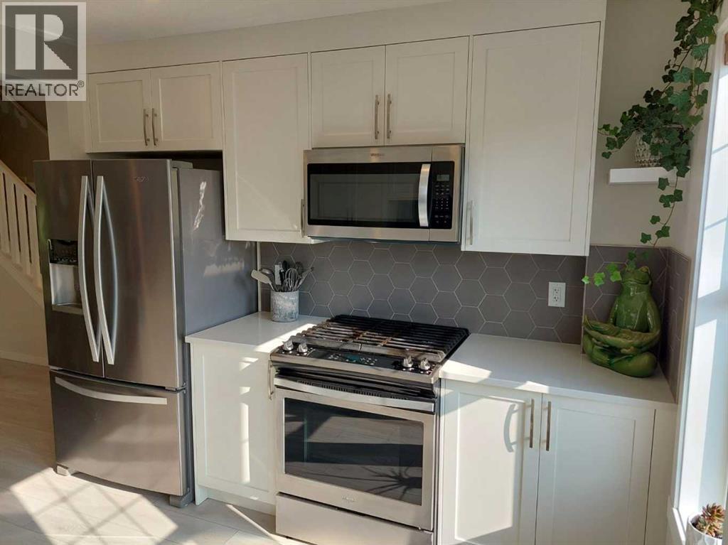 Click brochure link for more details** Gorgeous Cranston Riverstone townhome backing onto the Cranston Enscarpment. Beautiful private backyard oasis with year round views of nature. This townhome has an attached garage with numerous upgrades including tiled entrance and bathrooms, luxury vinyl flooring, lighting and custom blinds throughout, natural gas range and stainless steel appliances. Open railings throughout provide great natural lighting for all your plants year round. Central air conditioning and an additional deeded parking stall for your extra vehicle. Pet friendly community offers great access to the Bow River pathways and Cranston community amenities. Quick access to Stoney Trail, Deerfoot Trail, Seton shopping district, dining, shopping, SHC hospital and Brookfield YMCA. Unfinished basement has great storage with rough-ins for third bedroom development (pending permit approval). (id:58070)