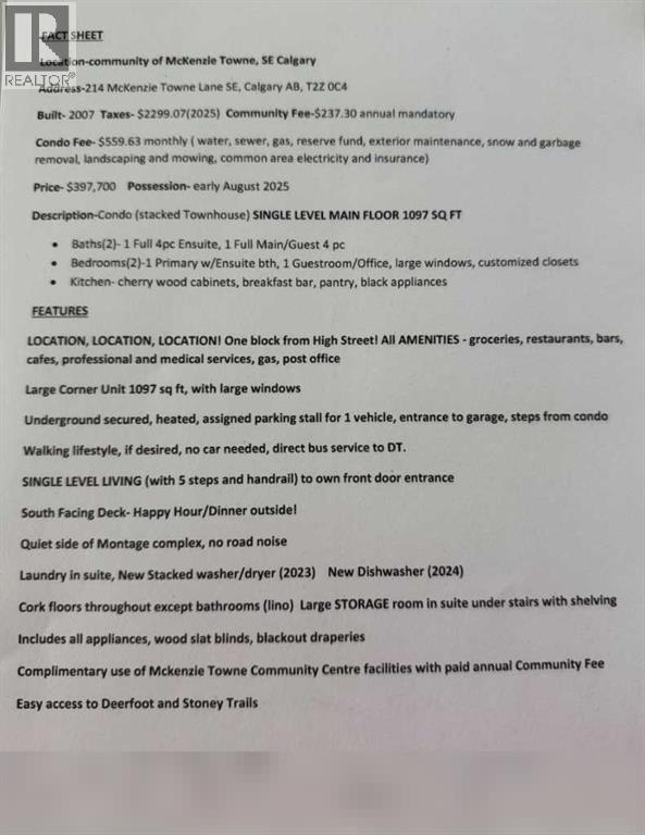 Click brochure link for more details**-FRESH NEW FLOORS!* Best Location! Desirable, walkable community of McKenzie Towne! One block from High Street and all amenities and services. Main floor, spacious corner unit with large windows and south facing deck. New 9” plank luxury vinyl upgraded FLOORING throughout entire unit (except laundry). Secure Assigned heated underground parking. New dishwasher, newer laundry pair, new ceiling fan/light in primary bedroom. Easy access to Stoney and Deerfoot Trails and direct bus to DT. Healthy Reserve Fund and well run HOA. (id:58070)