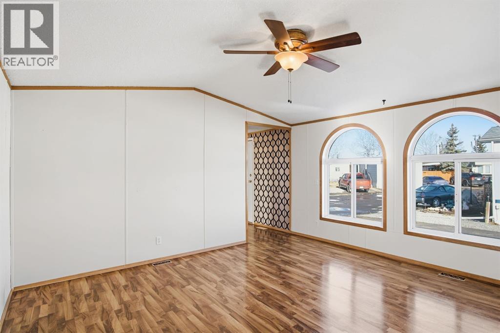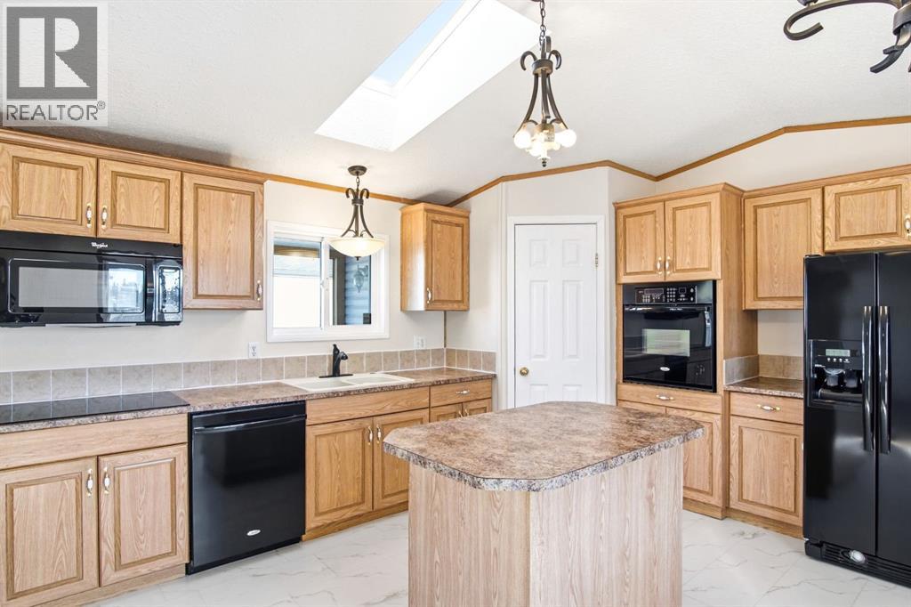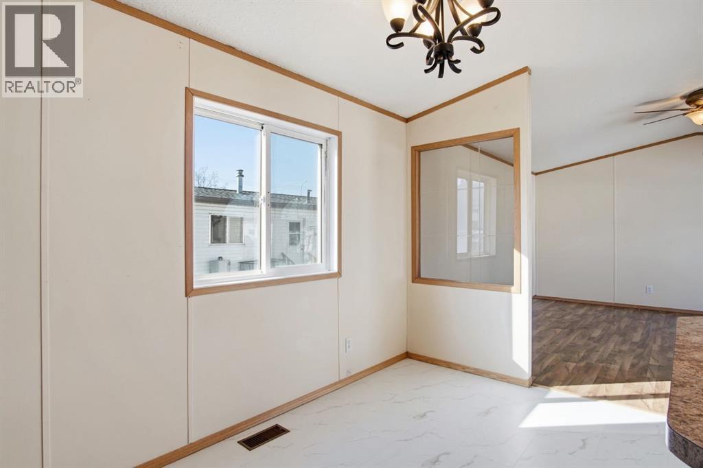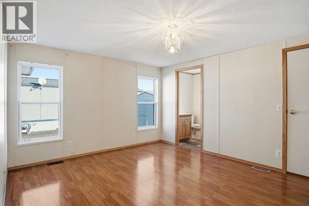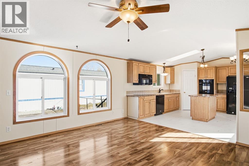 Welcome to this bright and well-maintained 3-bedroom mobile home offering over 1,190 sq ft of comfortable living space in the community of Olds. With a functional layout, great natural light, and thoughtful separation between living areas, this home is ideal for a variety of buyers. Step inside to a spacious and sun-filled living room, where large windows bring in an abundance of natural light, creating a warm and inviting atmosphere. The open-concept design flows seamlessly into the kitchen and dining area, making everyday living and entertaining effortless. The kitchen is both practical and spacious, featuring a central island, corner pantry, and plenty of cabinet and counter space to keep everything organized and within reach. Whether you're preparing meals or gathering with family, this space is designed to accommodate it all. The primary bedroom is privately situated at one end of the home, offering a quiet retreat complete with its own ensuite. On the opposite end, you’ll find two additional bedrooms and a full bathroom, providing great separation and flexibility for family, guests, or a home office setup. Additional highlights include a dedicated laundry area, durable laminate and linoleum flooring throughout, and an abundance of natural light that enhances the home’s bright and airy feel. Step outside to enjoy the rear deck perfect for relaxing or summer BBQs—along with a generously-sized yard and a convenient parking pad. Affordable, functional, and move-in ready, this is a fantastic opportunity to get into homeownership or downsize without compromise. (id:58070)