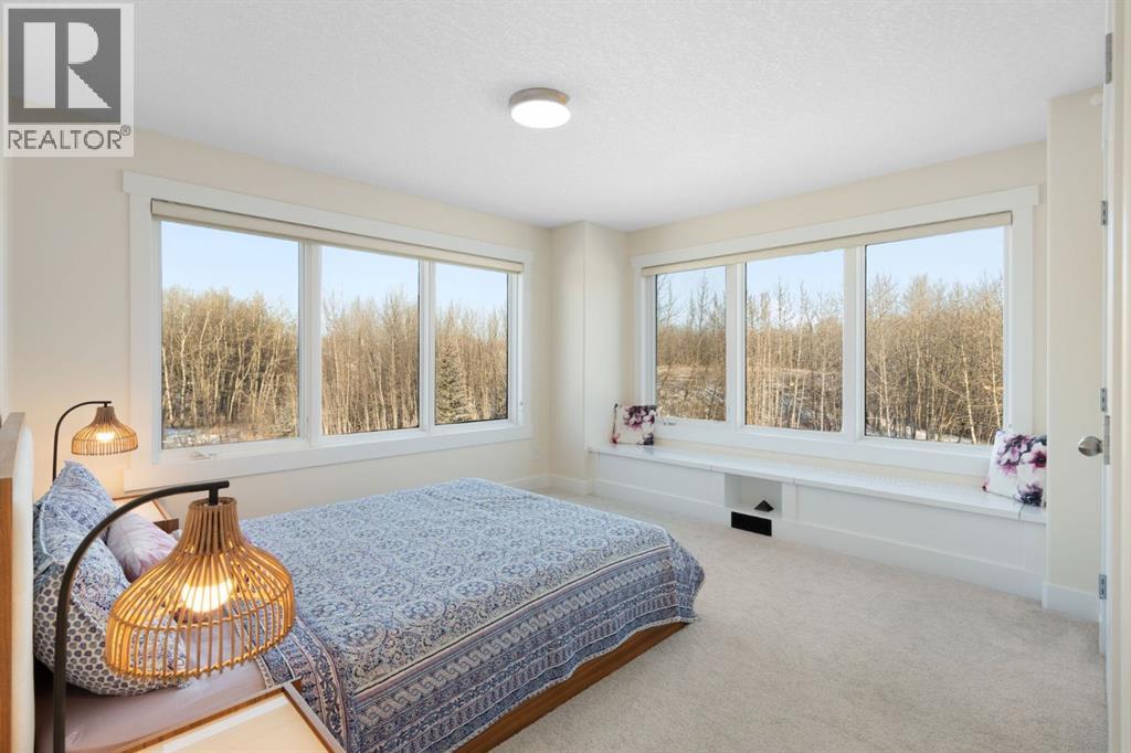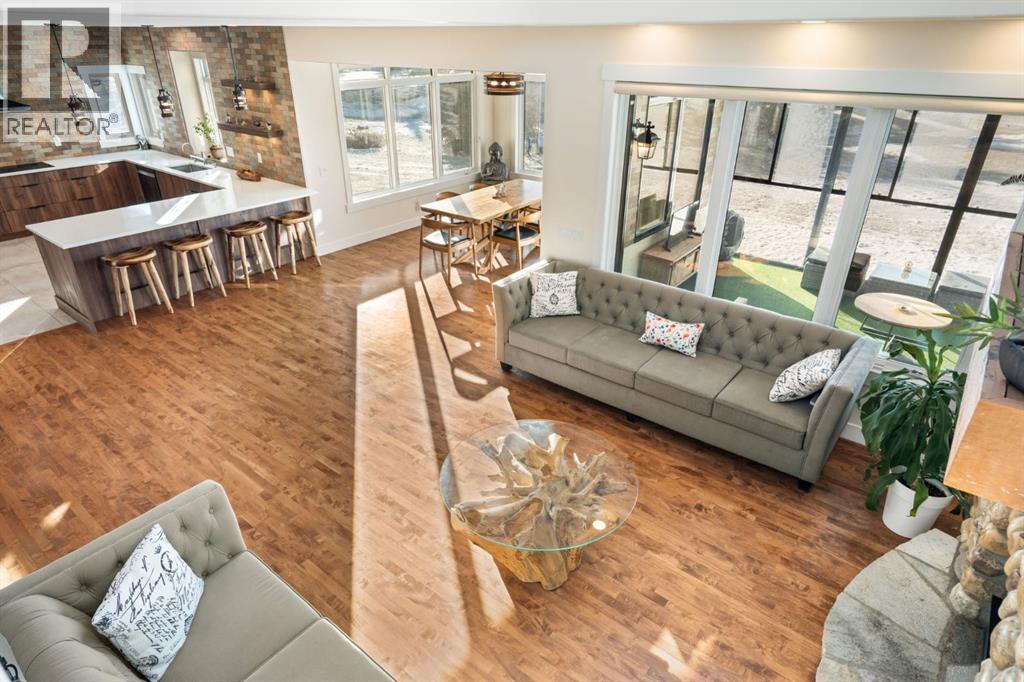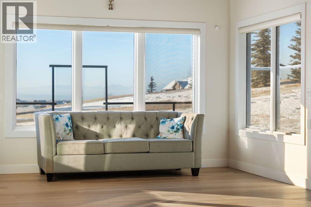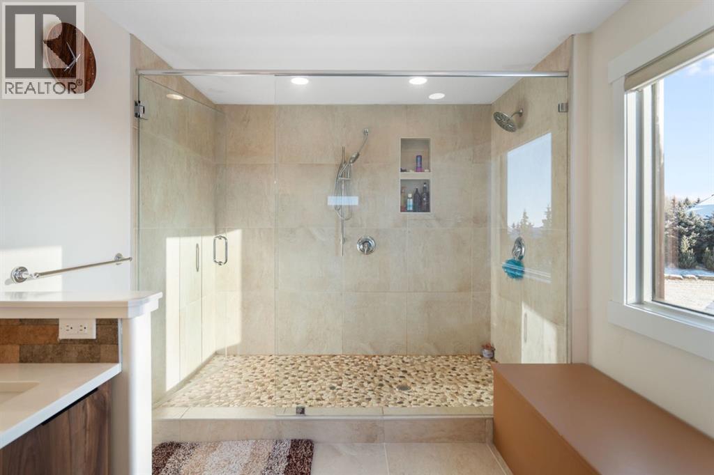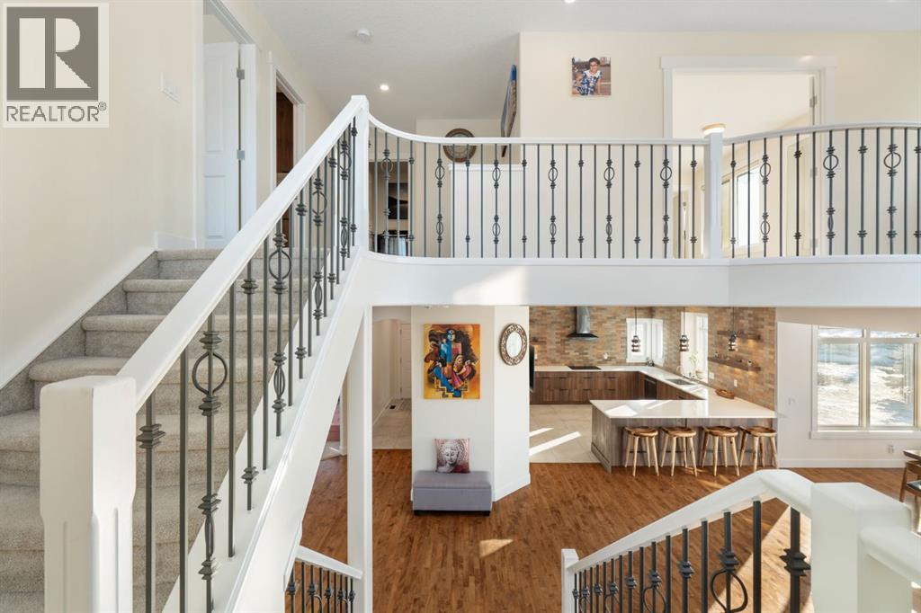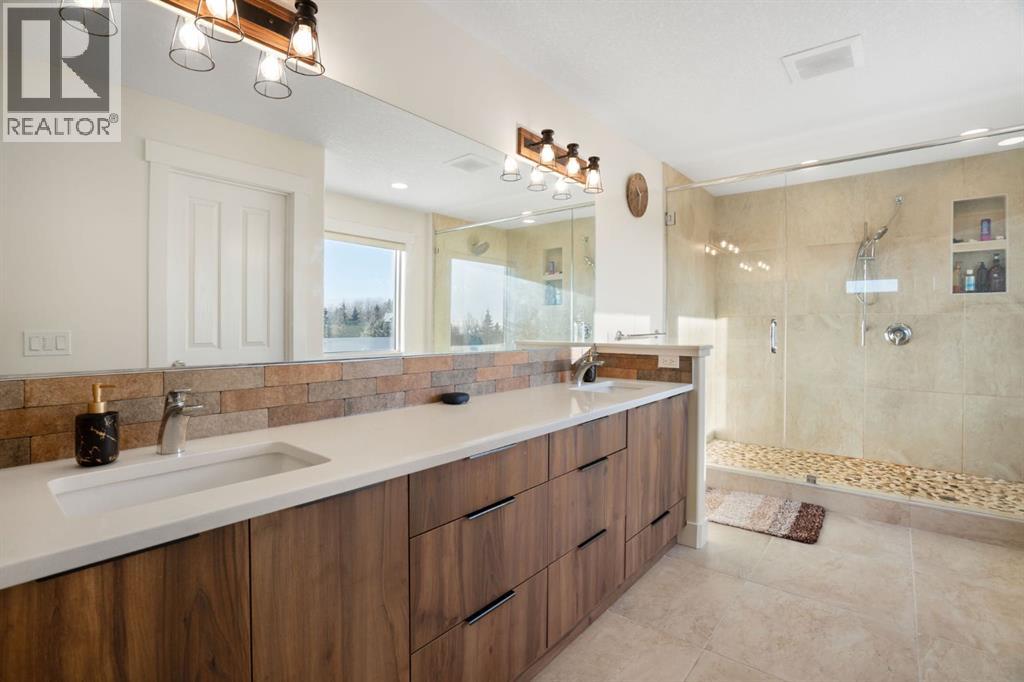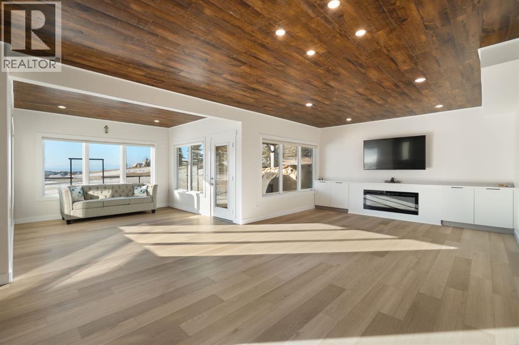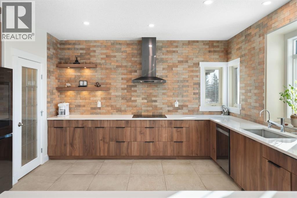 MOUNTAIN VIEWS! Set on 2-acres in prestigious Bearspaw Summit Estates, this remarkable 4659sqft home is refined country living with effortless access to the city. The property is moments from top schools, everyday conveniences, and just a 9-minute drive to Rocky View Co-Op. At the heart of the home, the living room makes a striking first impression with soaring ceilings, expansive picture windows, and a dramatic floor-to-ceiling stone wood-burning fireplace that anchors the space while framing breathtaking natural vistas beyond. The custom-designed kitchen is elegance and function in one, featuring quartz countertops, a generous wrap-around island, new (2024) Samsung stainless steel appliances, and a walk-through pantry. It flows seamlessly into the spacious dining area and the southwest-facing sunroom designed as a four-season retreat—glass walls capture uninterrupted mountain views and golden evening light year-round. The upper level is thoughtfully designed for comfort and family living. The serene primary retreat offers sweeping mountain views, a private sunroom, and a bright, spa-inspired 5-piece ensuite. 2 additional oversized bedrooms, a 3-piece bathroom, a full laundry room, and a flexible workspace complete this level for exceptional versatility. The fully finished walkout lower level offers an adaptable studio space—ideal for fitness, creativity, or quiet reflection—enhanced by a cozy gas fireplace and a 3-piece bathroom. Walk out to a concrete patio with new railings, effortlessly extending the living space into the outdoors.The fully heated 3-car attached garage mirrors the home’s elevated standard, complete with custom maple cabinetry, granite countertops, tiled flooring, and an additional refrigerator—ideal for entertaining, storage, or a secondary prep space. Mature trees provide natural seclusion, while thoughtful enhancements elevate both beauty and function: a custom firepit (2024), an upgraded children’s playhouse with solar lighting (2024), and a fully wired 3-season retreat structure built on poured concrete (2023), perfect for recreation or peaceful escape. Recently added: a Buddha waterfall feature, solar landscape lighting, 6 large planters, and gated entry pillars create a sense of tranquility and arrival. Extensive upgrades completed in 2024 ensure modern comfort: updated mechanical room; 2 new furnaces with humidifiers, a tankless hot water heater, sump pump, water softener, reverse osmosis drinking water system, and a smart security/automation system. New flooring upstairs and in the basement, fresh paint throughout, and fully renovated kitchen, bathrooms, and laundry room with new cabinetry, quartz countertops, designer lighting, modern fixtures, and backsplashes. Additional recent upgrades include closet organizers, enhanced sunrooms, and upgraded balconies. This is an exceptional Bearspaw offering, where light, landscape, and craftsmanship exist in quiet harmony—a home that invites you to slow down, breathe deeply, and truly arrive. (id:58070)