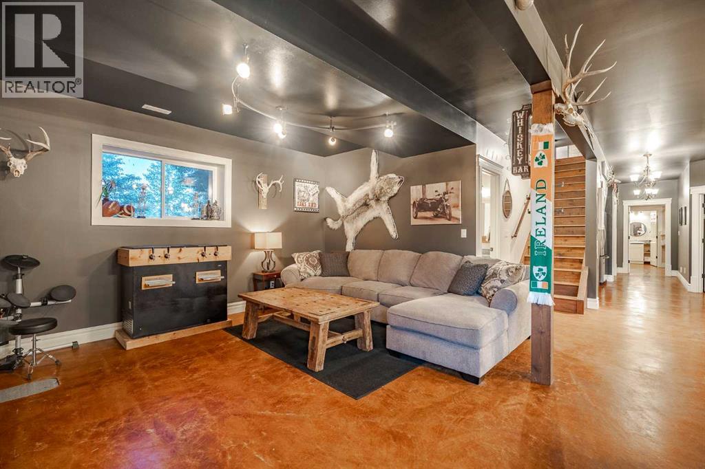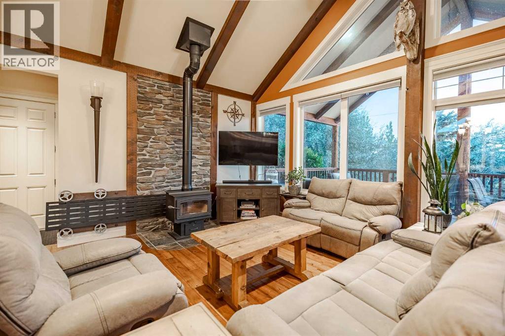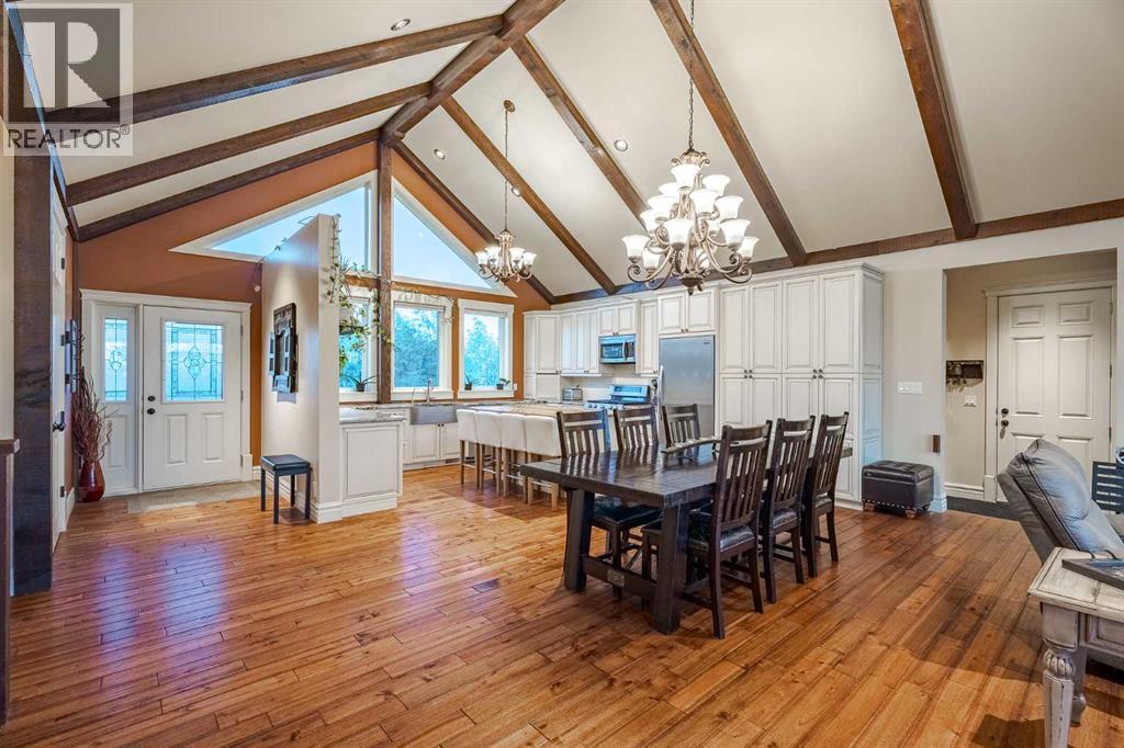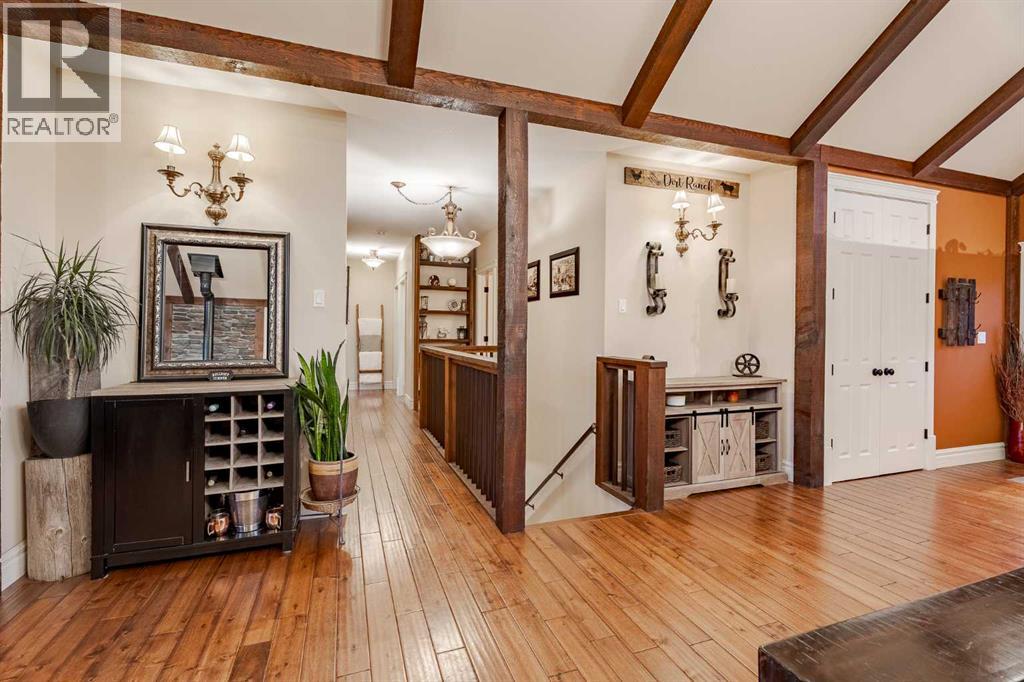 Welcome to this extraordinary walkout bungalow offering over 4,000 sq ft of thoughtfully designed living space with 6 bedrooms, 5 bathrooms, a heated oversized quad garage, a massive 40’ x 60’ insulated shop, and nearly 20 acres of endless possibility just minutes from Calgary. From the moment you arrive, the striking A-frame architecture stretches from the front elevation all the way to the covered back porch, perfectly framing panoramic mountain views. Step into the grand main level, where soaring vaulted ceilings with exposed beams and expansive west-facing windows fill the space with natural light and unforgettable views. The gourmet kitchen features upgraded cabinetry, a large center island, granite countertops, and premium stainless appliances designed for effortless entertaining. The spacious dining area easily accommodates large gatherings, while the open-concept living room is anchored by a cozy gas fireplace.Just down the hall, the generous primary retreat offers an open 4-piece ensuite and a spacious walk-in closet. Two additional bedrooms provide comfortable spaces for family or guests and share access to a well-appointed main bathroom. A versatile office or den is tucked away near the front entry. Downstairs, the walkout basement extends the living space with a massive recreation room, wet bar, three additional bedrooms, and two full bathrooms, including one ensuite – perfect for multi-generational living or hosting guests.Outside, the property continues to impress with an attached heated oversized quad garage and a 40’ x 60’ powered shop ready for your next project, hobby, or home-based business. The multiple livestock areas are thoughtfully arranged and include 3 automatic waterers to support a wide range of agricultural uses. Whether you're envisioning a private rural retreat, a hobby farm, or a future development opportunity, this nearly 20-acre parcel offers it all – and with potential for subdivision pending municipal approval, the possibiliti es are truly endless.All this just 10 minutes to Stoney Trail and 15 minutes to shopping, dining, and amenities in Seton and Mahogany. This is more than a home – it’s your gateway to rural luxury, convenience, and future opportunity. Don’t miss your chance to experience it. (id:58070)