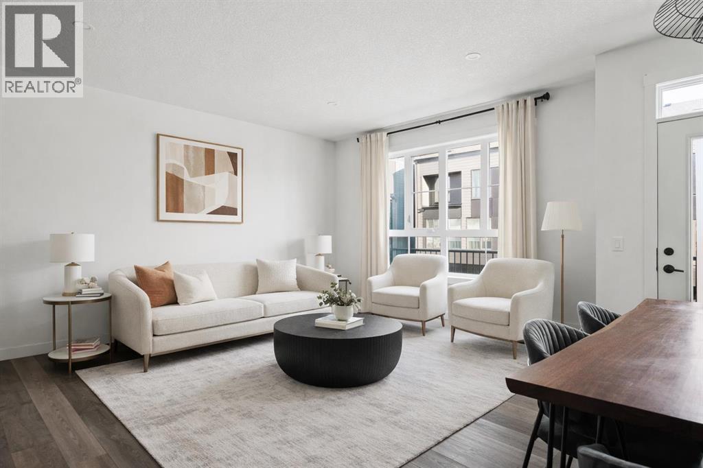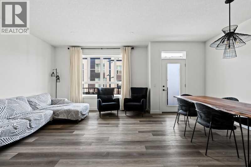 Welcome home to this beautifully maintained townhome in Crown Park, Calgary’s newest inner-city community. Offering over 1,300 sq. ft. of thoughtfully designed living space, this home features 2 bedrooms, 2.5 bathrooms, a private single attached garage, and a convenient driveway for additional parking. This well-appointed 3-storey townhome showcases an open-concept floor plan designed for both everyday living and entertaining. The layout places the kitchen between the living room and dining area, creating a seamless flow throughout the main level, ideal for entertaining or for families with children. The kitchen is finished with full-height soft-close cabinetry, quartz countertops, a large pantry, and a stainless-steel appliance package that includes an electric range, chimney hood fan, and built-in microwave. Just off the dining area is access to a spacious private balcony spanning the entire width of the home, perfect for outdoor relaxation or hosting guests. Luxury vinyl plank flooring runs throughout the main level, while large windows and 9-foot ceilings enhance the bright, inviting atmosphere. The same luxury vinyl plank flooring continues up the stairs and throughout the upper level, offering a carpet-free interior that is both pet-friendly and easy to maintain. Upstairs, the primary bedroom features a walk-through wardrobe and private ensuite complete with a walk-in shower. A second generously sized bedroom, an additional full bathroom, and convenient upper-level laundry complete the upper floor. The main entry level includes a welcoming foyer with a coat closet and access to a discreetly located 2-piece powder room for guests. Situated in the highly desirable Crown Park community, this home offers an exceptional location near Shaganappi Golf Course, walking trails along the Bow River, transit access, and a wide array of nearby dining, shopping, and entertainment amenities. Perfect for professionals, couples, or downsizers seeking low-maintenance living in a prime inner-city setting. (id:58070)