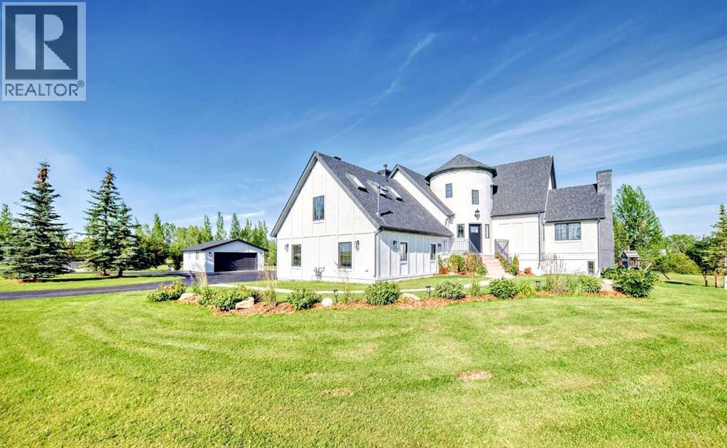 Experience the best of both worlds with this breathtaking 4-acre estate, where idyllic country living meets exceptional comfort and style. This impeccably maintained 2-storey walkout residence with 4782 sq ft of total living space blends timeless European charm with luxurious finishes, featuring rich oil-stained hardwood, elegant brick wood-burning fireplaces, and a grand tower foyer with a curved staircase. The main level offers a spacious living room, formal dining area, and an open gourmet kitchen with modern shaker cabinetry, granite countertops, and an eating bar—ideal for entertaining. A large family room gives you tons of extra space for the family. Upstairs, you’ll find three generous bedrooms, including a stunning primary suite with a spa-like ensuite. The fully developed walkout level—currently set up as a full illegal in law suite—includes an additional bedroom, den, large family room, kitchen, and separate access. The home showcases tile, hardwood, and carpet flooring, and is complemented by a detached 2-car garage, paved circular driveway with RV parking potential, expansive fenced garden, firepit, storage area with a unique wood-burning sauna and games room, plus a garden shed, mature trees, and landscaped grounds. Zoned for horses and close to both private and public schools. This property offers the tranquil living just minutes from Calgary and located close to the future Bingham crossing shopping centre featuring Costco! You will love the quick access to Highway 1 for heading out of town and other destinations. It will be a pleasure to move when this is your destination! (id:58070)