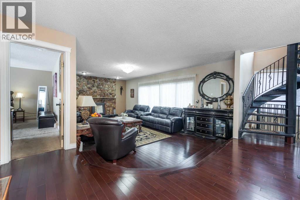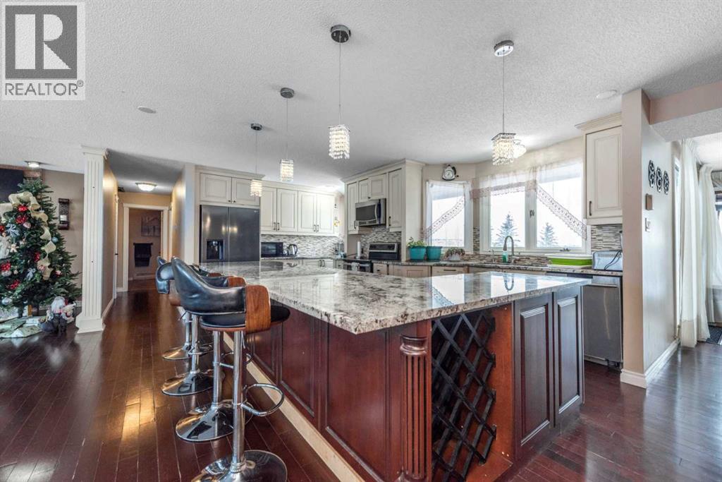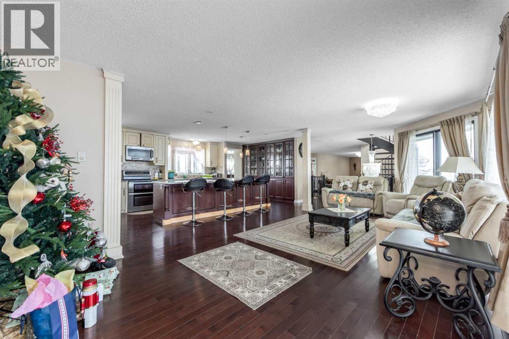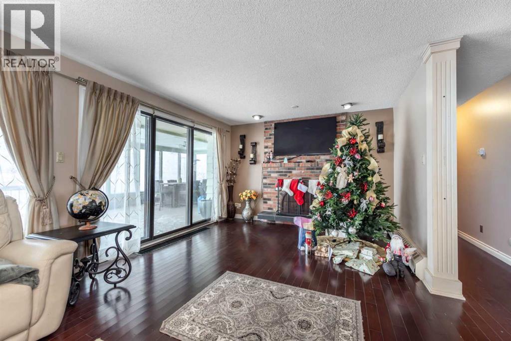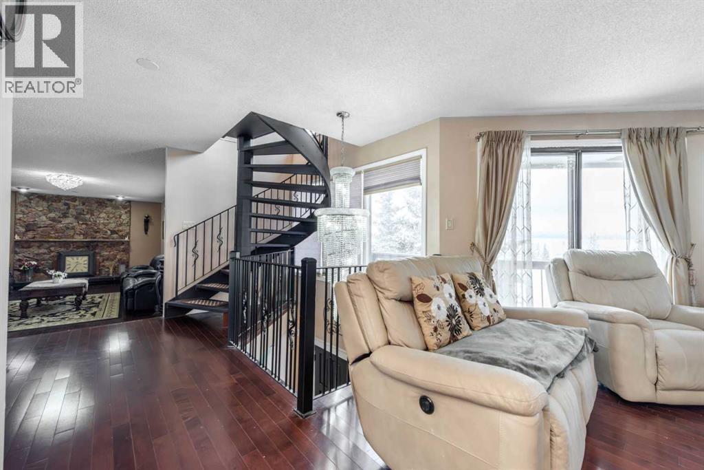 Rare opportunity in sought-after North Springbank! Nearly 4 acres perched on a picturesque knoll with 360° mountain, valley, and city views. This peaceful, private acreage offers gently rolling, fenced land—ideal for families, hobbyists, anyone seeking space, or the perfect lot to build your dream home—all just minutes from the upcoming Bingham Crossing Mall, new Costco, top schools, Springbank Airport, and Springbank Links Golf Course. This reversed walkout, lofted hillside bungalow features a bright open layout, a sunken living room with brick fireplace, formal dining room, spacious kitchen with island, large family room with second fireplace, and 3 bedrooms on the main level. A unique upper office loft accessed by a circular staircase adds extra versatility. Enjoy the massive partially covered west-facing deck plus an additional east deck and balcony. A 3-car heated attached garage with covered carports provides ample parking, along with room for RVs and equipment. The 40’x47’ metal Quonset, offers excellent workshop, storage, or hobby use. This is a prime Springbank location offering quiet country living with outstanding convenience and exceptional long-term potential. (id:58070)