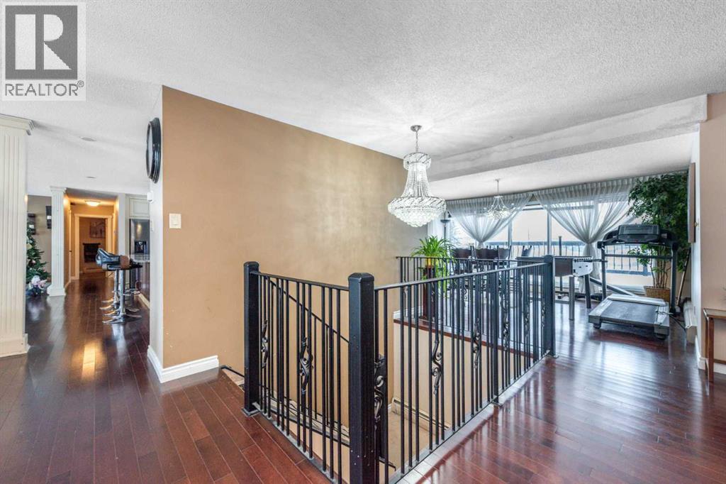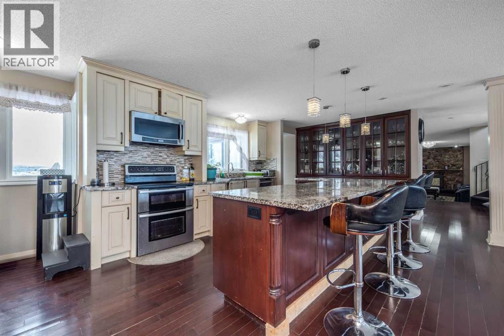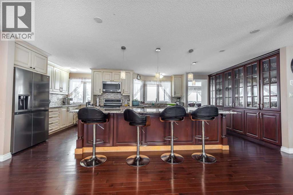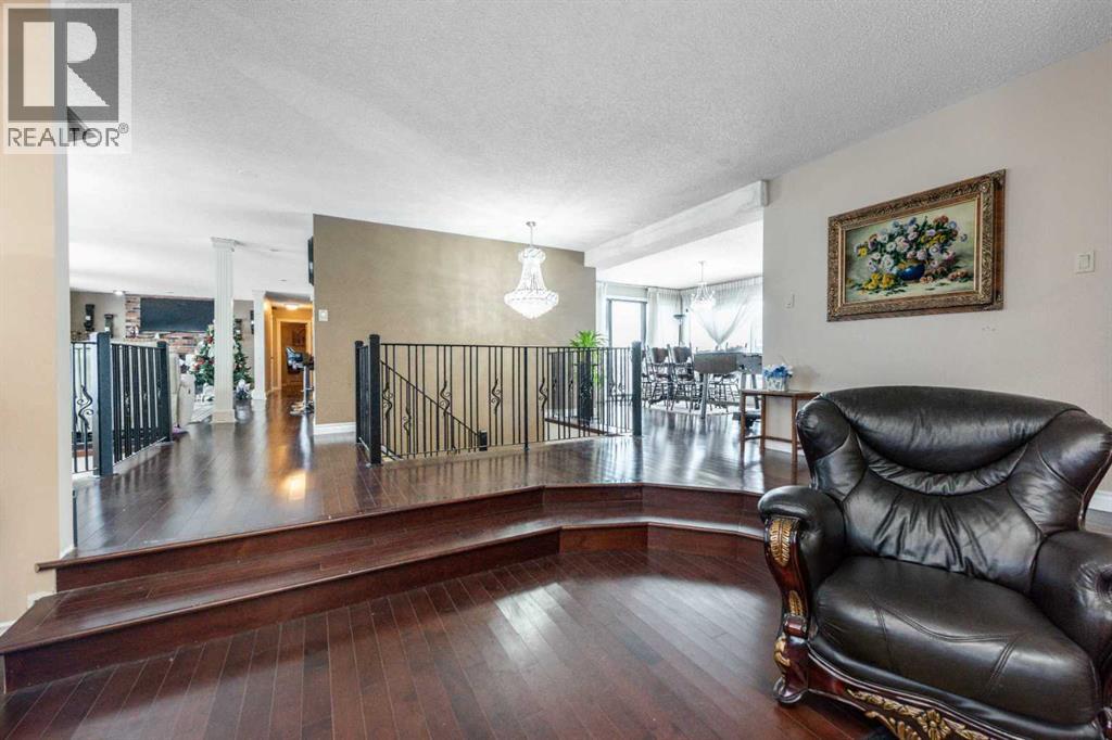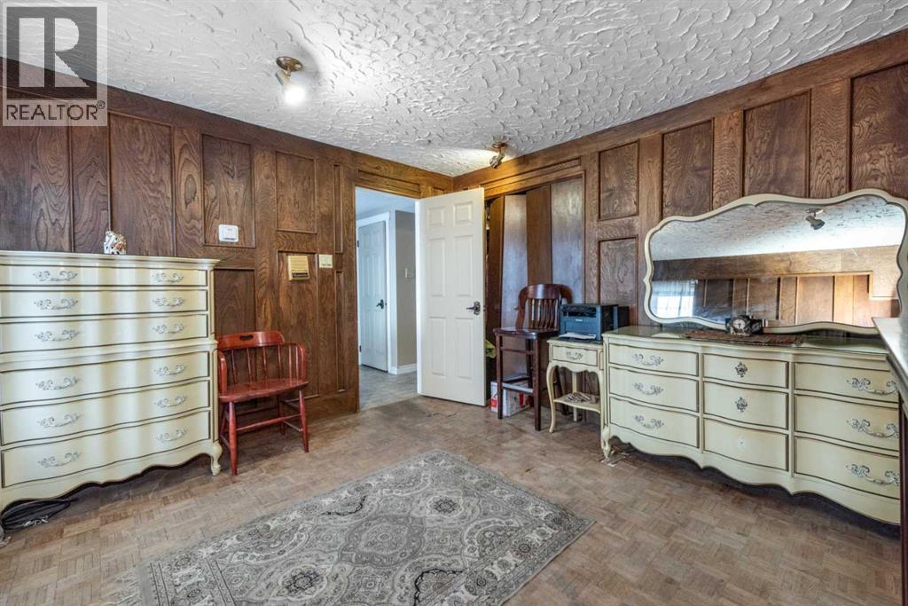 Rare opportunity in sought-after North Springbank! Nearly 4 acres perched on a picturesque knoll with 360° mountain, valley, and city views. This peaceful, private acreage offers gently rolling, fenced land—ideal for families, hobbyists, anyone seeking space, or the perfect lot to build your dream home—all just minutes from the upcoming Bingham Crossing Mall, new Costco, top schools, Springbank Airport, and Springbank Links Golf Course. This reversed walkout, lofted hillside bungalow features a bright open layout, a sunken living room with brick fireplace, formal dining room, spacious kitchen with island, large family room with second fireplace, and 3 bedrooms on the main level. A unique upper office loft accessed by a circular staircase adds extra versatility. Enjoy the massive partially covered west-facing deck plus an additional east deck and balcony. A 3-car heated attached garage with covered carports provides ample parking, along with room for RVs and equipment. The 40’x47’ metal Quonset, offers excellent workshop, storage, or hobby use. This is a prime Springbank location offering quiet country living with outstanding convenience and exceptional long-term potential. (id:58070)