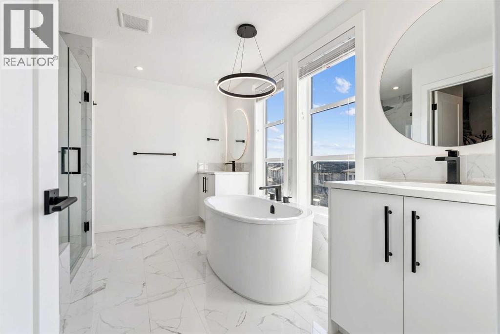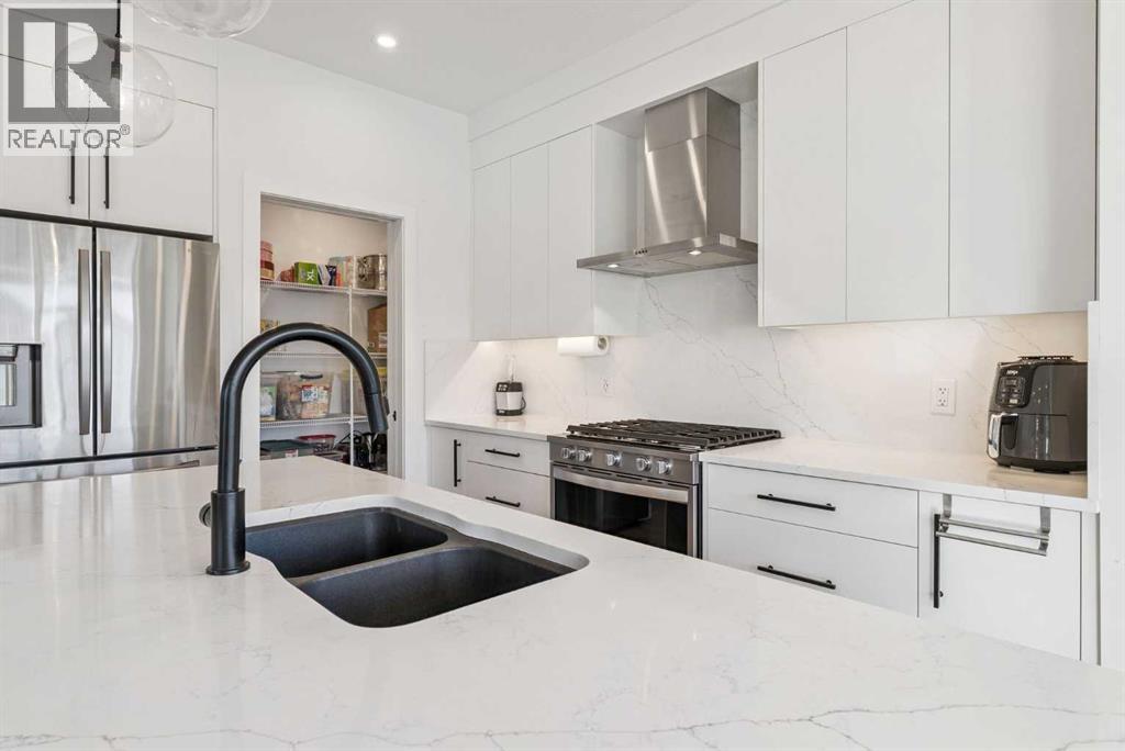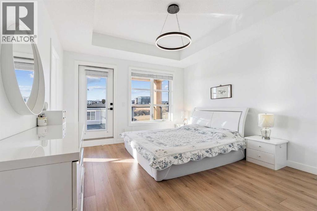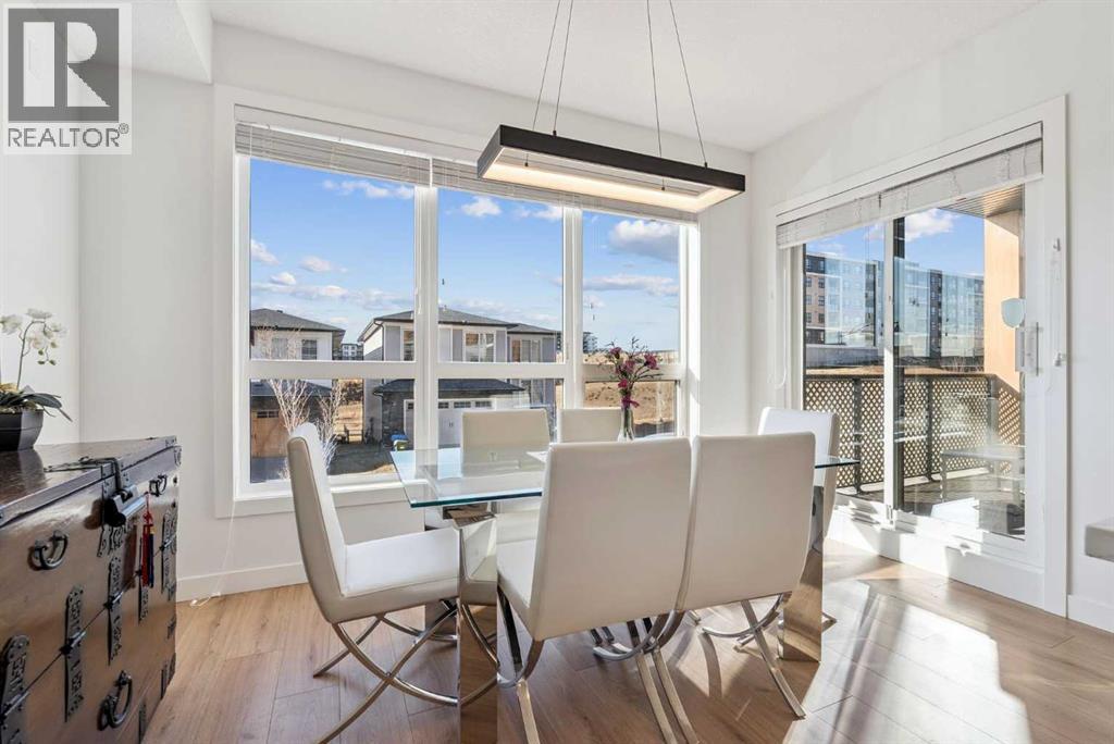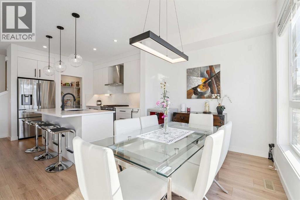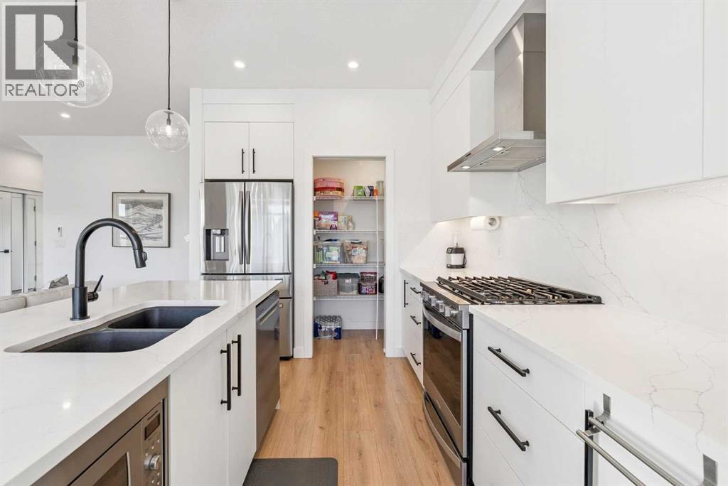 Experience elevated living in ARCOLA by Truman, a contemporary townhome community. It’s not just a townhouse, but it is more likely a luxury downsizing home where you can enjoy lifestyle with convenience and style. This END-UNIT home is perfectly positioned in a quiet neighbor providing more privacy and bit more space. It offers 2 balconies, 1 patio, over 2,400 sqft of living space including fully developed WALK-OUT basement, featuring 4 bedrooms (3+1) and 3.5 bathrooms. From the moment you step inside and greeted by gorgeous tiled foyer and 9ft ceiling, you’ll be wowed and appreciate the designer’s touch and bright, open-concept layout. Luxury vinyl prank flooring throughout in all three levels, and no more ugly carpet in this home. 9ft ceilings in main level and the basement. The spacious living area is filled with natural light and provides ample space for relaxing and entertaining. The kitchen is showcasing premium quartz countertop, stainless steel appliances, including T-shaped chimney and gas stove, generous cabinetry, spacious corner pantry, and a large central island with seating, plus there are dedicated dining area and convenient powder room to complete the main floor. Off to the balcony for alfresco lunch or evening wines or sunbathing. Upstairs, retreat to a spacious primary suite featuring a walk-in closet and a spa-inspired 5-piece ensuite with dual sinks and a deep soaker tub on gorgeous tiled floor. Step out to a dedicated balcony from your bedroom to enjoy a cup of coffee and mountain view. Two additional well-sized bedrooms, each with its own walk-in closet, and there is a full bathroom and upper-level laundry room. The fully developed WALK-OUT basement expands your living space with a cozy family room ideal for movie nights or home office or gym, a fourth bedroom, and an additional full bathroom make a perfect living space for over night guests and teen ager children or rent it out for additional income. The heated double garage can fit two cars and still providing additional storage space for all your seasonal gears. Additional upgrades are garburator, ceiling fan and air conditioner for comfortable living. The layout of this townhouse was one of the top seller and is not coming to the market very often. Not to mention just minutes from top-rated schools, Westside Rec Centre, parks, playgrounds, shops, restaurants, cafes, major roads, and public transit to have ultimate balance of lifestyle and accessibility. Don't miss this golden opportunity. Book your showing today! (id:58070)