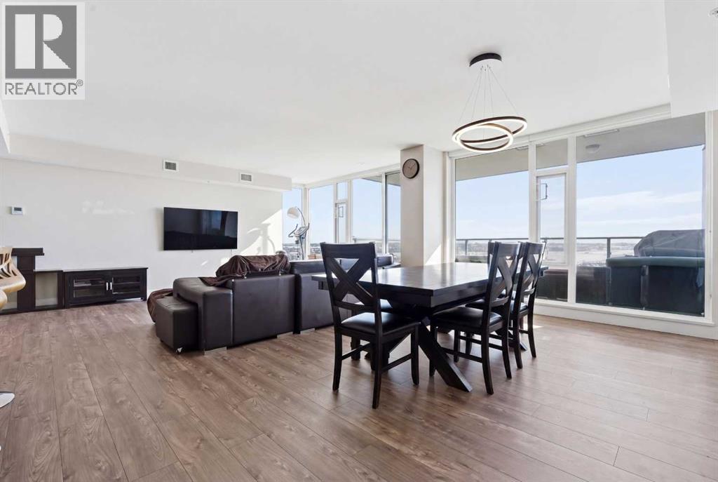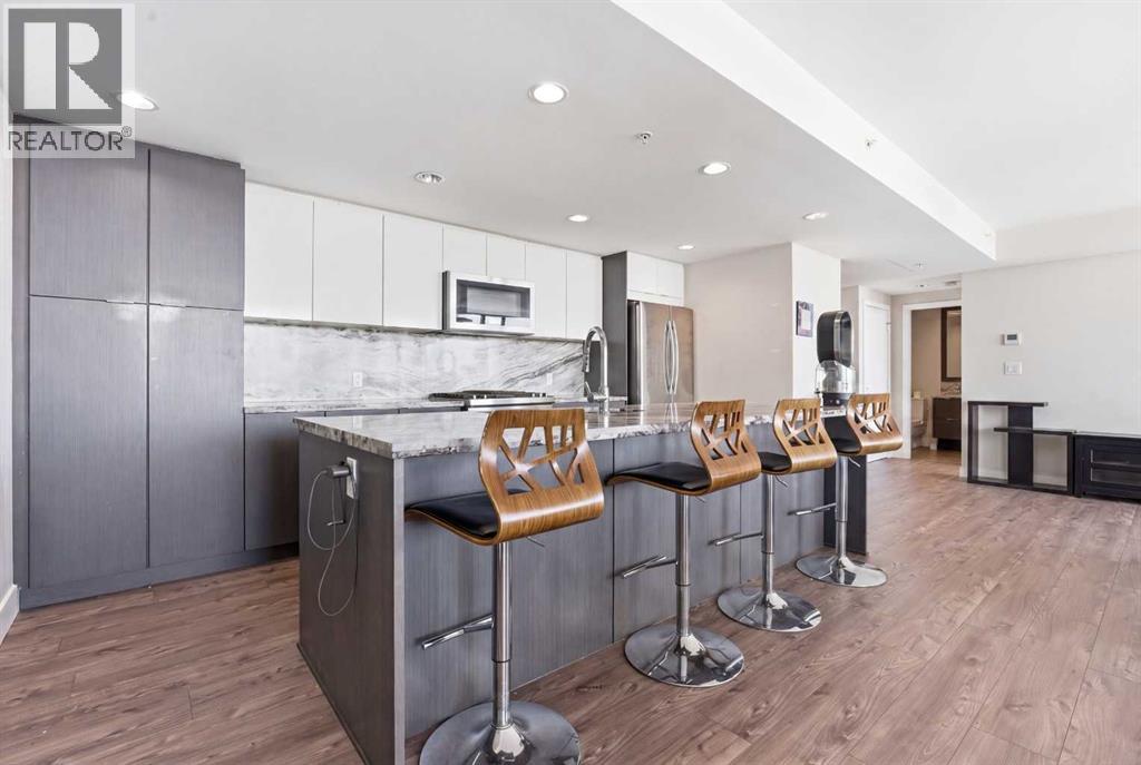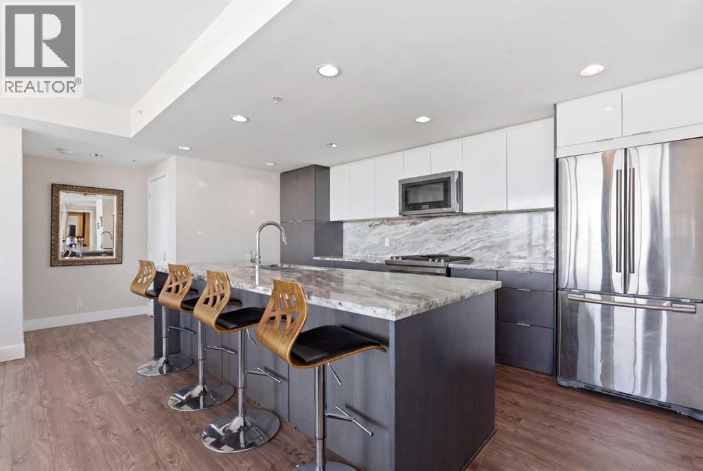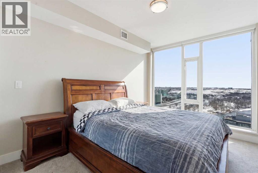 Exceptional and stunning three-view panorama from the 27th floor, showcasing the Mountain, Bow River, and Downtown skyline. This luxurious, generously proportioned two-bedroom, two-bath residence offers an open-concept 1,200+ SF of living space with floor-to-ceiling glass that reveals dramatic vistas throughout the day. The morning sun pours through the east-facing, air-conditioned suite, waking a generous living-dining space that flows into a gourmet kitchen—granite island and backsplash gleaming beside a pantry and top-tier stainless steel appliances, including a five-burner gas stove and under-cabinet lighting. A master retreat awaits with a walk-in closet and a five-piece ensuite warmed by in-floor heating, while a second bedroom offers in-floor heating and convenient laundry with a second bath. This is one of the tower’s largest units, with tandem underground parking for two and extra storage. Beyond the walls, the building invites: a gym, steam room, sauna, and a social lounge with a kitchen; a second-level terrace and rooftop garden for al fresco gatherings; 24-hour concierge and ample visitor parking. Step outside to riverfront strolls, parks, C-Train access, a library, Superstore, and a chef’s lineup of dining options. An expansive 140+ SF east-facing balcony frames panoramic views, redefining downtown luxury living at its finest. A Schedule "A" must accompany all offers to purchase. (id:58070)