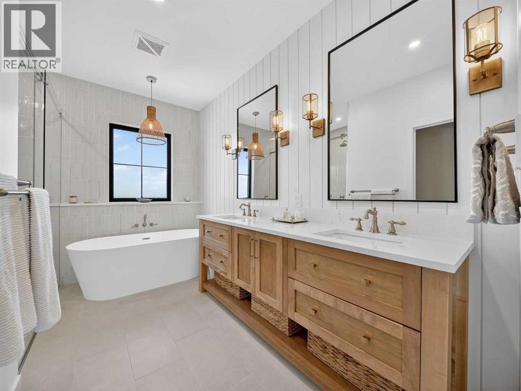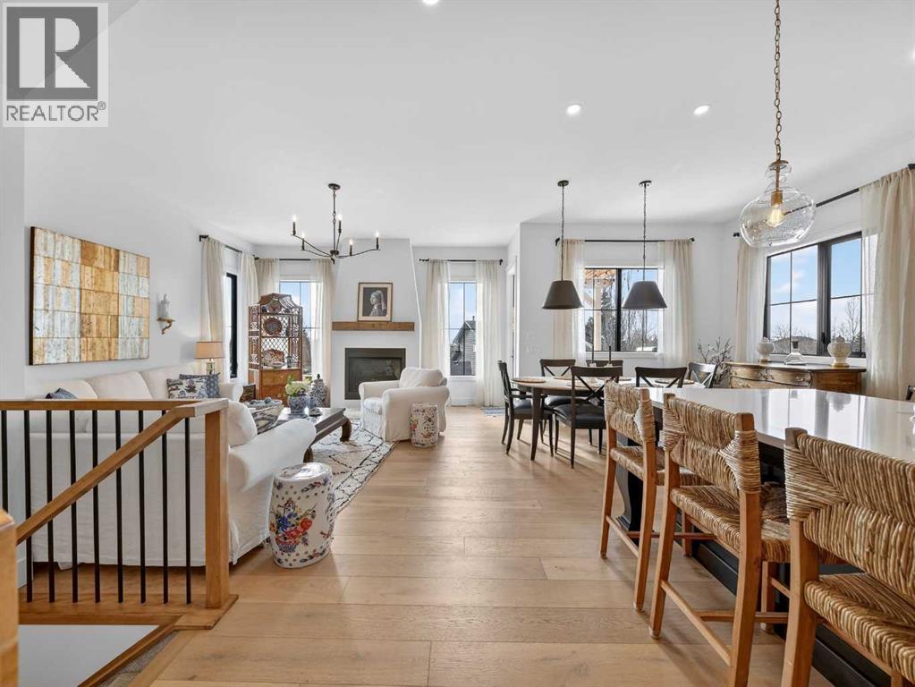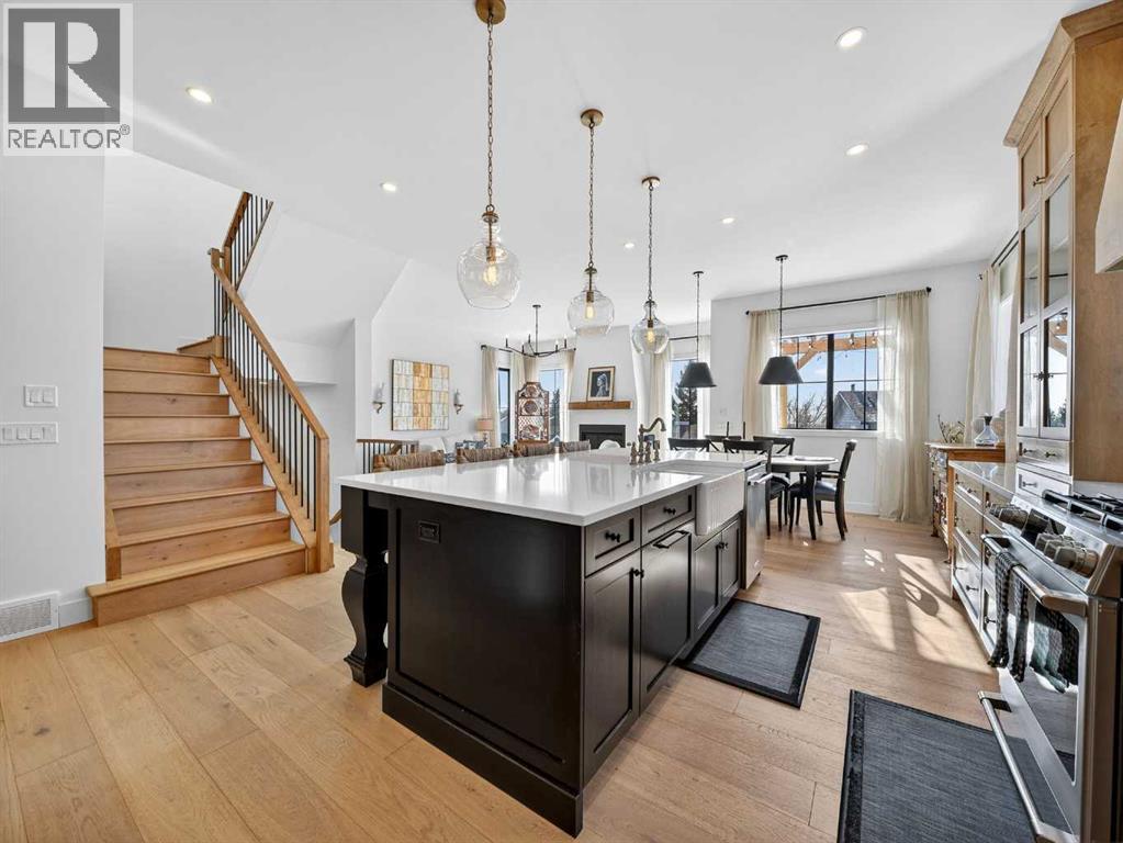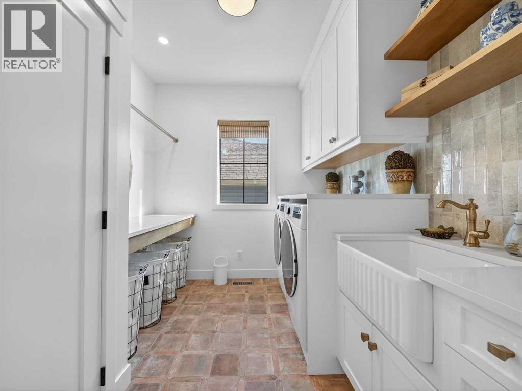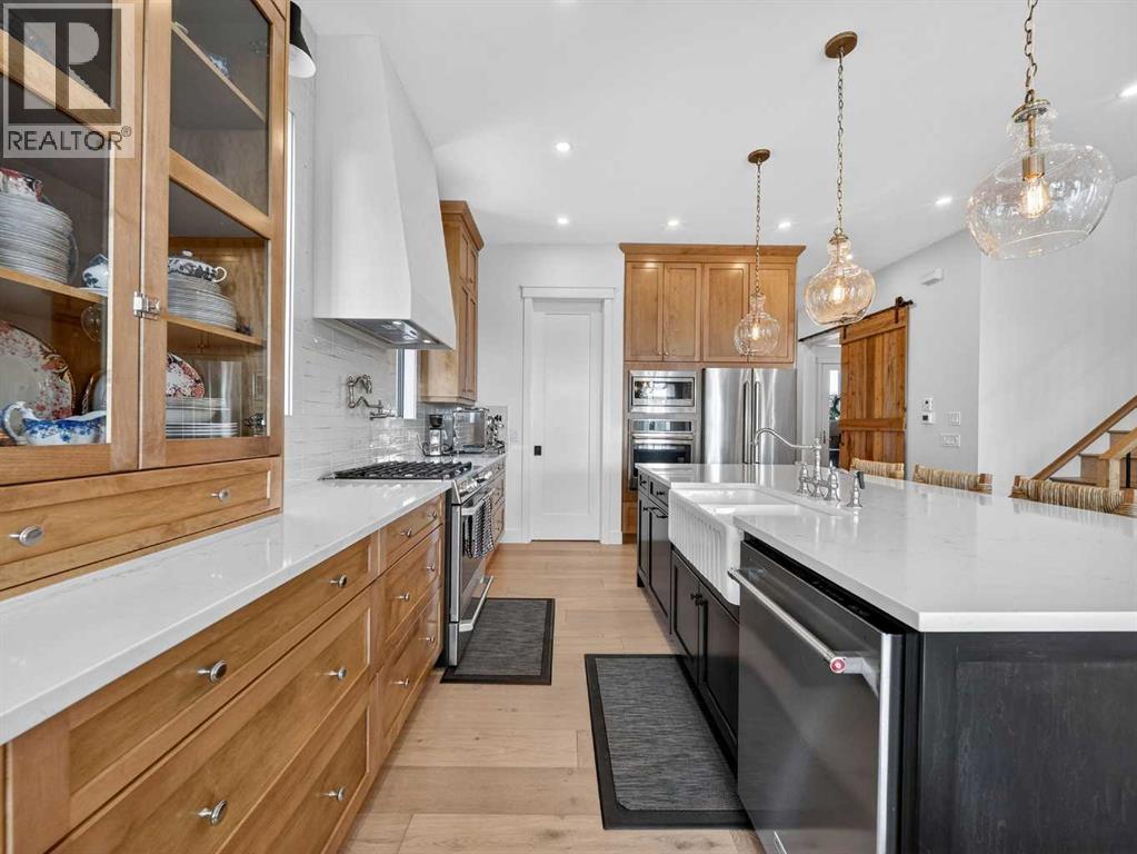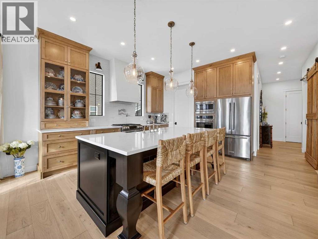 Welcome to an extraordinary custom-built farmhouse in the prestigious community of Wedderburn in Okotoks — a residence where refined craftsmanship meets timeless country elegance. From the moment you arrive, the home’s striking curb appeal, architectural charm, and warm, inviting presence create an unforgettable first impression. A gracious and spacious foyer welcomes you inside, immediately setting the tone for the thoughtful design carried throughout. Just off the entry, a beautifully appointed office offers both functionality and sophistication, complete with bespoke built-in cabinetry and a custom desk. As you continue into the heart of the home, the breathtaking kitchen unfolds in true European Tuscan farmhouse style. Floor-to-ceiling custom maple cabinetry, rich in detail and warmth, is perfectly complemented by white oak flooring that flows seamlessly throughout the main level. A generous central island anchors the space, while a statement custom hood fan, built-in appliances, and exquisite imported tile elevate the design. Expansive windows capture sweeping west-facing mountain views and southern vistas overlooking Okotoks. The adjoining dining and living areas are designed for both intimate evenings and elegant entertaining. A custom gas fireplace provides warmth and ambiance, while an abundance of windows invites natural light and frames the stunning landscape beyond. Completing the main floor is a thoughtfully designed mudroom featuring custom cabinetry and a pristine dog bath. Ascending to the upper level, you are welcomed by a stunning bonus room perfectly positioned to take full advantage of the south-facing views over Okotoks and the majestic Rocky Mountains to the west. Three spacious bedrooms offer comfort and refinement. The primary retreat is a sanctuary unto itself, showcasing a spa-inspired ensuite with dual vanities, a freestanding soaking tub, and an oversized custom walk-in shower. Two additional bedrooms share a beautifully appointed bath room. The laundry room is exceptional — custom cabinetry and farmhouse sink create a space as beautiful as it is functional. The fully developed lower level elevates this home even further. In addition to a completely separate legal basement suite with its own private entrance, quartz countertops, stainless steel appliances, and stacking washer and dryer — the lower level also features an additional bedroom or multifunction room with a full private ensuite. Bright, airy, and finished to the same uncompromising standards as the upper levels, nothing has been overlooked. Outdoors, the property truly shines. Situated on one of the largest lots in Wedderburn, the expansive south-facing backyard offers endless opportunity for relaxation and recreation. A two-tiered deck with pergola creates the perfect setting for summer evenings, entertaining, and enjoying the open skies. Every detail of this residence has been meticulously curated, the epitome of luxury farmhouse living. (id:58070)