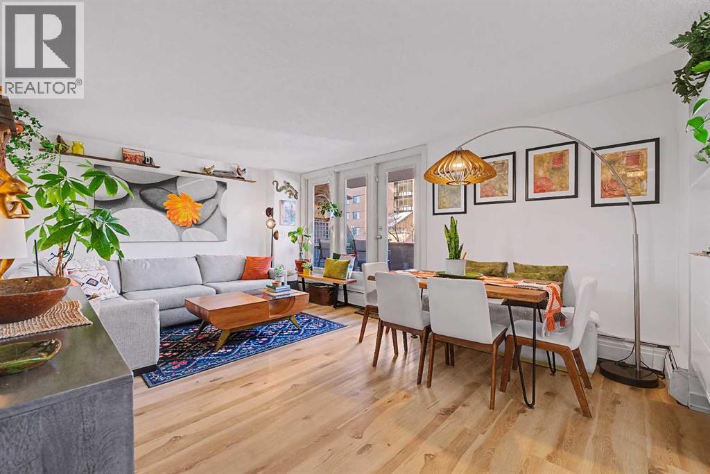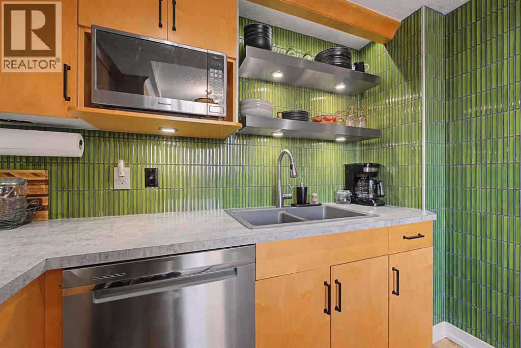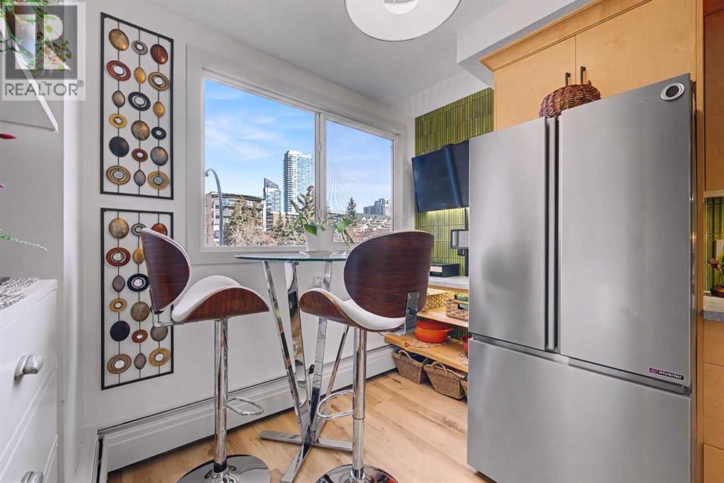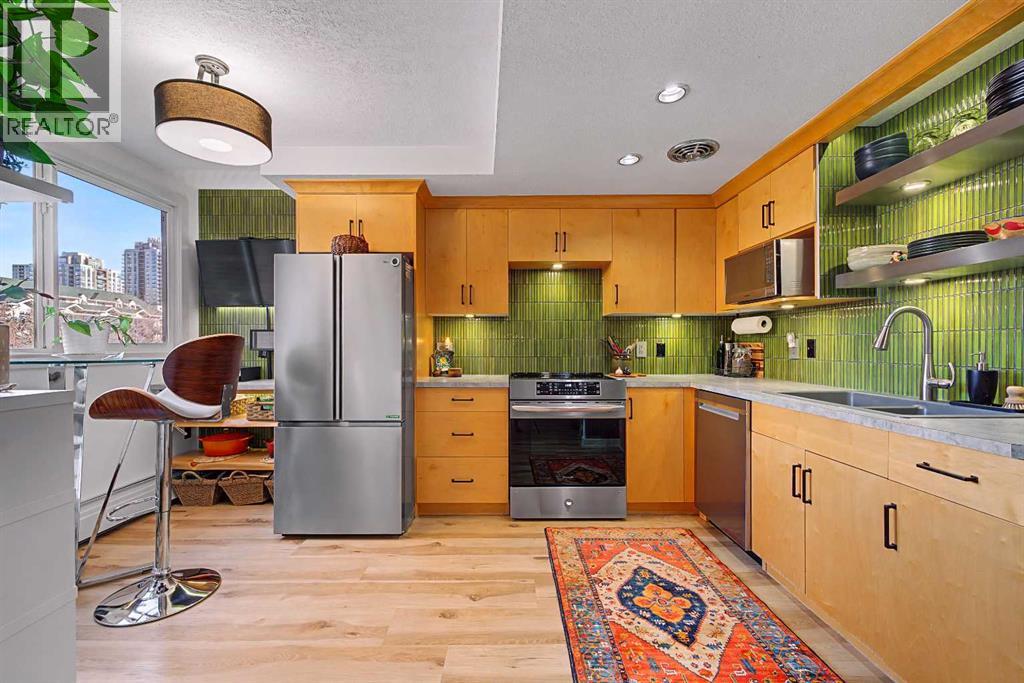 STUNNING 2 BED CORNER UNIT | SOPHISTICATED RENOS | MOVE IN READY: Elevate your lifestyle in this BRIGHT, BEAUTIFUL, 800+ sq ft sanctuary at Monticello Estates. Located just steps from the best RESTAURANTS, and SHOPS on 17th Ave, this move-in-ready home blends URBAN energy with total peace. This isn’t just a condo; it’s a VIBE. Flooded with natural light, this home features a masterfully REDESIGNED kitchen with CUSTOM light-maple cabinetry, sleek matte-black hardware, and a vertical tile backsplash in AVOCADO GREEN; cooking enthusiasts will love the premium full suite of professional-grade stainless steel appliances. You’ll love the STYLISH bathroom, finished with classic white subway tiles for a modern and eclectic feel. Both bedrooms are brimming with light and generously sized to fit a king size bed with room to spare plus the wide-plank floors throughout keep the whole space feeling FRESH AND LIGHT. Follow the OPEN-CONCEPT layout to the spacious living area with a LARGE covered balcony that brings in a ton of light during the day and the sparkling city views at night. Complete with secured parking, a storage locker, Bike storage and in-suite laundry, this upgraded residence offers an UNPARALLELED LIFESTYLE in the heart of the Beltline. (id:58070)
