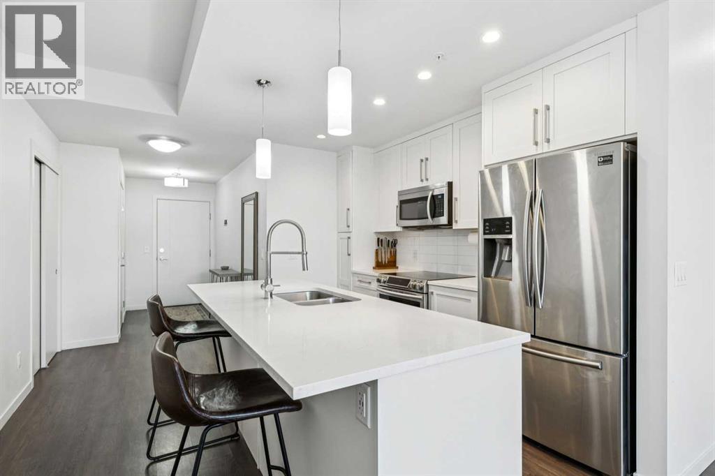 Welcome to this exceptional 2 bedroom, 2 bathroom corner unit in the sought-after Tela Building, ideally located on arguably Mission’s best street 22nd Avenue SW. Just steps from the area’s top inner-city amenities, this street-facing condo is tucked on a quiet, tree-lined block and offers the perfect blend of privacy, light, and location. Situated in the northwest corner of the third floor, this bright and airy home features 9-foot ceilings, central air-conditioning, a thoughtfully designed 870 sq ft floorplan, and two titled underground parking stalls plus a storage locker. Large windows throughout flood the space with natural light, while downtown views can be enjoyed from both the primary bedroom and the private balcony. The open-concept kitchen is designed for both everyday living and entertaining, complete with a central island with quartz countertops, stainless steel appliances, and seamless flow into the dining and living areas. Step outside to the balcony overlooking mature trees, with sightlines north to downtown and west toward 4th Street, and a gas line for BBQ. The spacious primary bedroom offers a peaceful retreat, overlooking a beautiful mature tree that creates a canopy of greenery in the spring. The attached ensuite features double quartz vanities, tile flooring, and a large walk-in shower. The second bedroom is generously sized with west-facing windows for warm afternoon light and is conveniently located near the full second bathroom ideal for guests. Additional highlights include pet-friendly living, secure underground parking with side by side stalls, secure bike storage and unbeatable access to Mission’s vibrant shops, restaurants, grocery stores, banks, transit, and professional services along 4th Street. Enjoy walking or cycling the Elbow River pathways, located less than five minutes from your door. This is a fantastic opportunity to enjoy quiet, inner-city living in one of Calgary’s most desirable neighbourhoods. (id:58070)