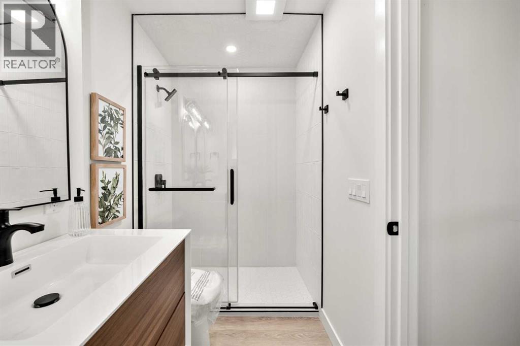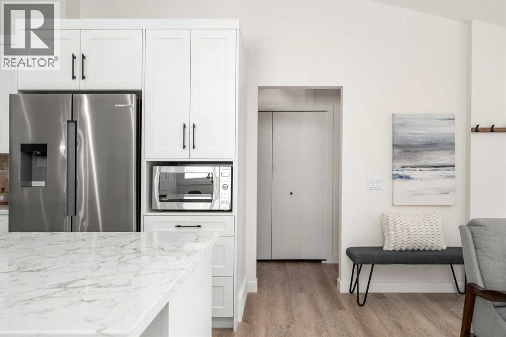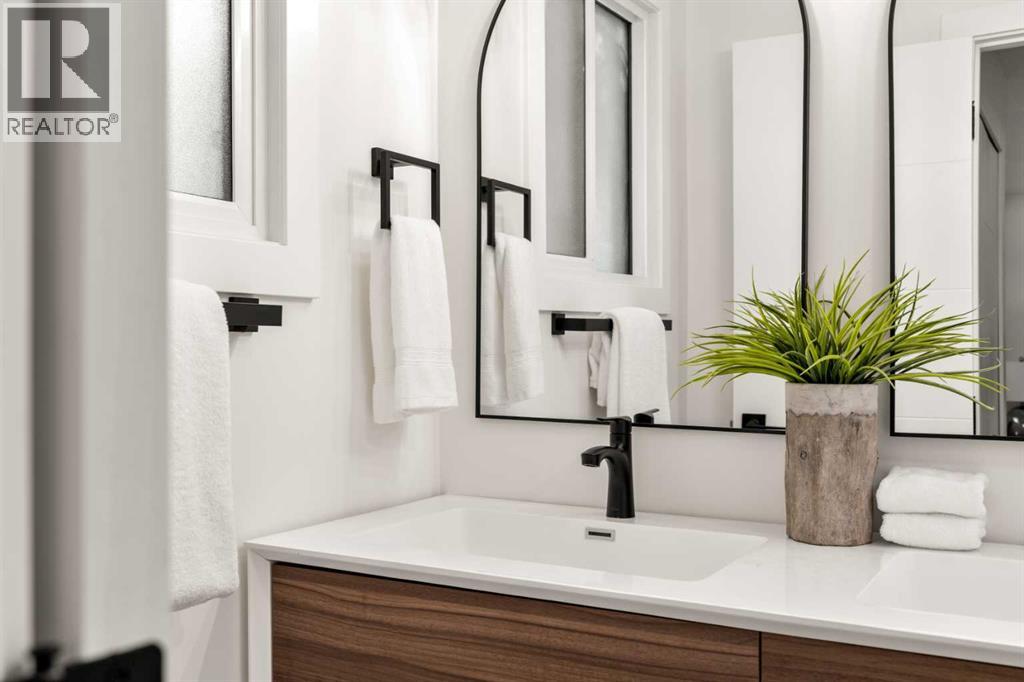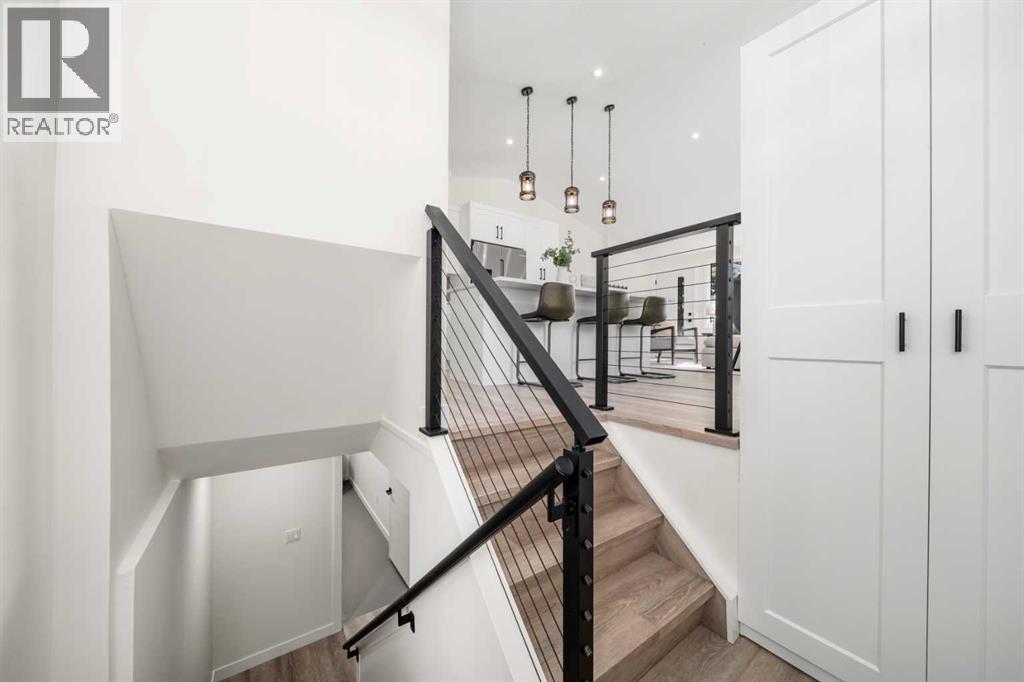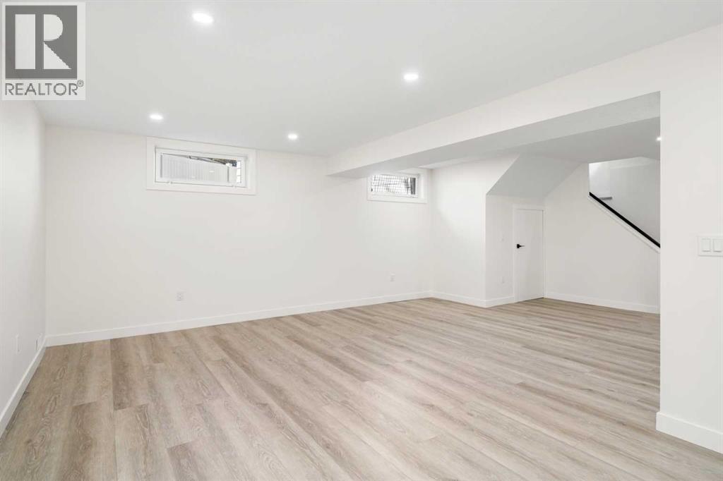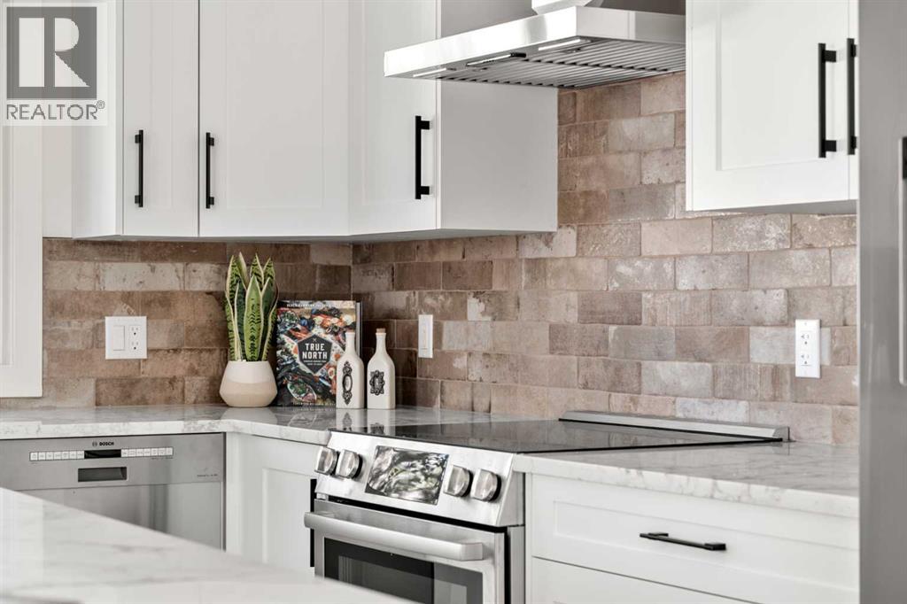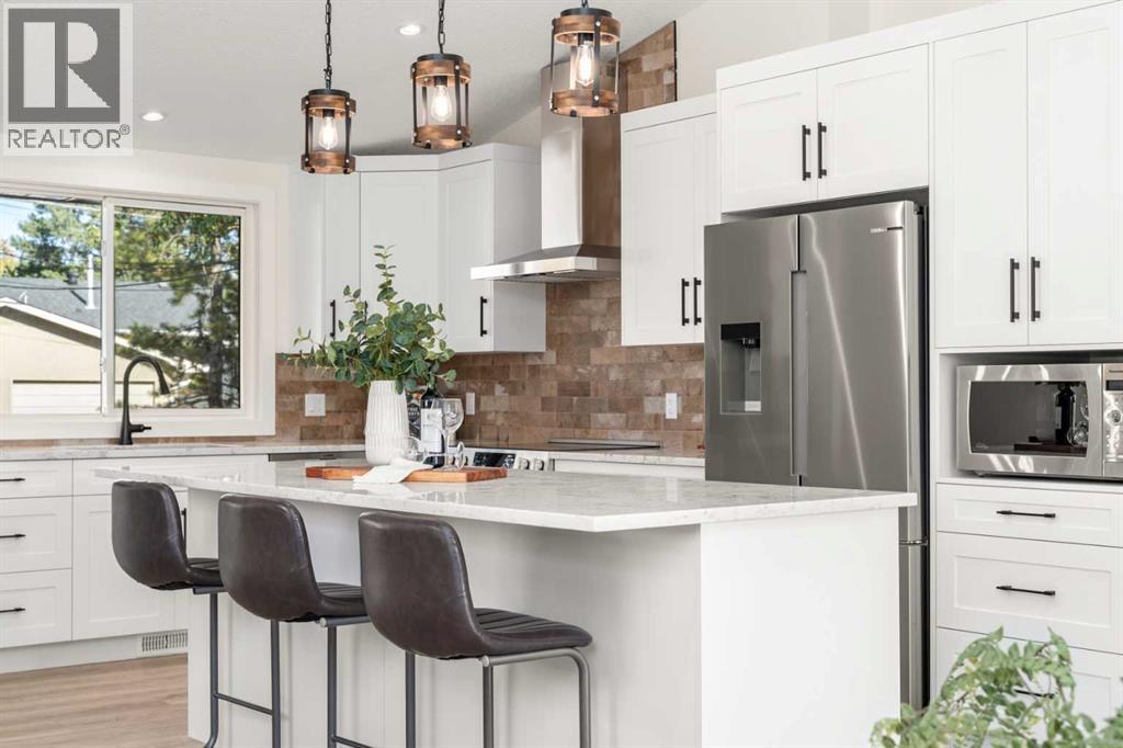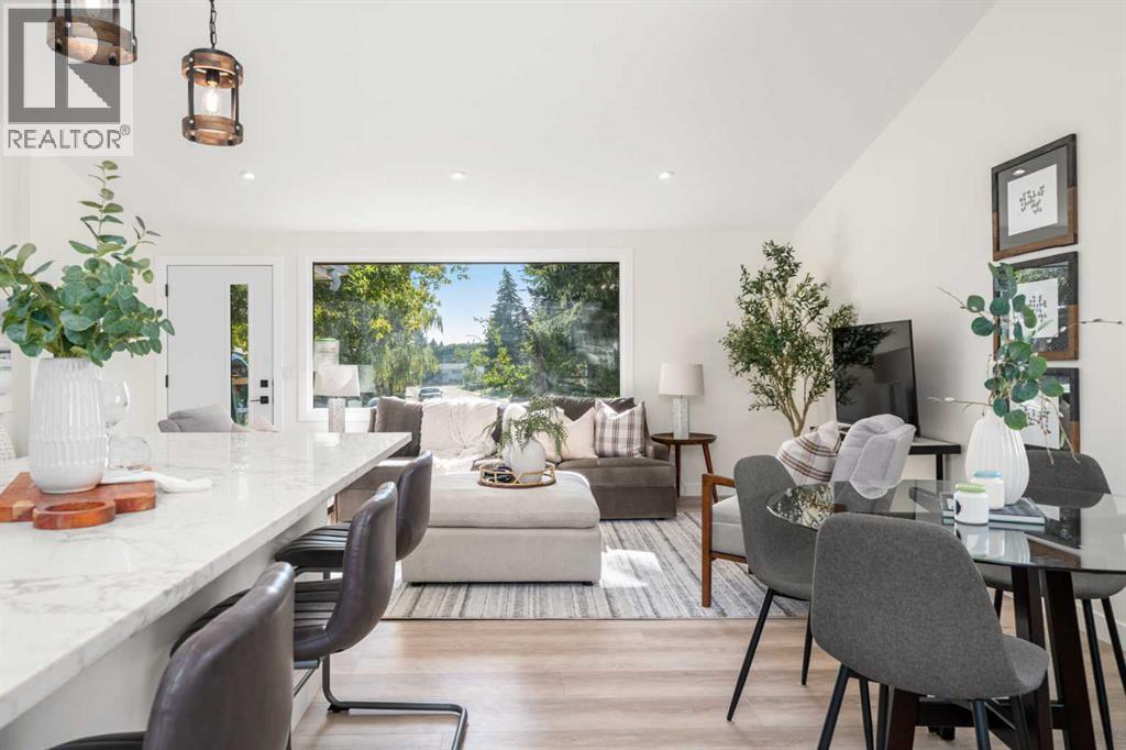 Welcome to BRENTWOOD, one of Calgary’s most beloved family communities, where this PERMITTED RENOVATION transforms a classic bungalow into a modern retreat. Set on a MASSIVE PIE LOT surrounded by mature trees, this residence combines mid-century character with today’s luxury upgrades for a lifestyle that is both stylish and functional. The main floor opens under soaring CATHEDRAL CEILINGS, where a bright front living room looks onto a quiet street through oversized windows. Wide-plank LVP FLOORING runs throughout, enhancing the clean lines of the OPEN CONCEPT LAYOUT. The chef-inspired kitchen is anchored by a large island with flush eating bar, STAINLESS STEEL APPLIANCES with a chimney hood fan, full-height cabinetry, and a BRICK CERAMIC BACKSPLASH. A defined DINING AREA comfortably fits a family table, creating a natural gathering hub for everyday life. The separate sleeping quarters offers three bedrooms, including a spacious PRIMARY SUITE with dual closets and a SPA-LIKE ENSUITE featuring a floating dual vanity and stand-up shower. Two additional bedrooms and a 4pc main bath with soaker tub complete this level, while a handy laundry chute adds convenience for busy families. Downstairs, the FULLY DEVELOPED BASEMENT offers incredible versatility with a large rec room designed for movie nights and games, plus the flexibility to convert part of the space into a 5th bedroom thanks to an existing egress window. this level also includes a 4th bedroom with walk-in closet, a modern 3pc bath with stand-up shower, dedicated laundry room, and abundant storage. Outdoors, the landscaped yard is a true retreat. An EXTERIOR BRICK FIREPLACE adds timeless charm for evenings under the trees, while a COVERED PATIO offers space to barbeque and unwind in every season. With room for a vegetable garden, a shed for storage, and plenty of green space for kids to play, this lot is both beautiful and functional. The DOUBLE DETACHED GARAGE IS INSULATED, HEATED, and features a new door and op ener, offering winter comfort and year-round utility. Families will love the walkable proximity to MULTIPLE LEVELS OF SCHOOLING, the UNIVERSITY OF CALGARY, BRENTWOOD LRT STATION, the public library, shopping centres, and community recreation. Nature enthusiasts will appreciate being just minutes from NOSE HILL PARK, one of Calgary’s largest green spaces. This renovated bungalow delivers the design quality of a modern luxury home while preserving the warmth of a family-friendly Brentwood location! (id:58070)