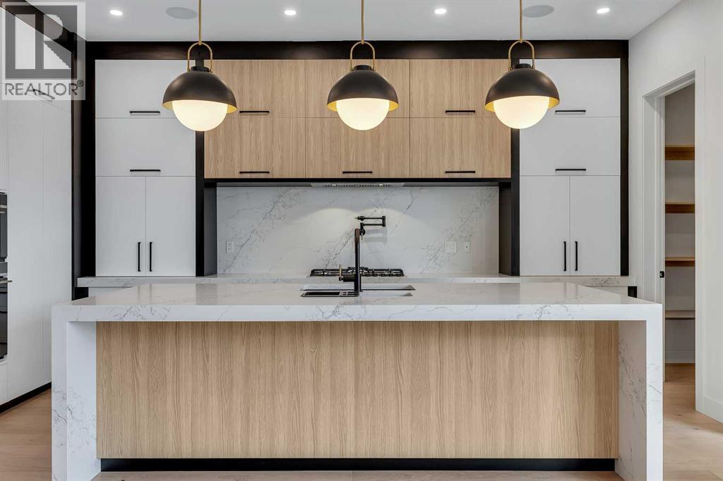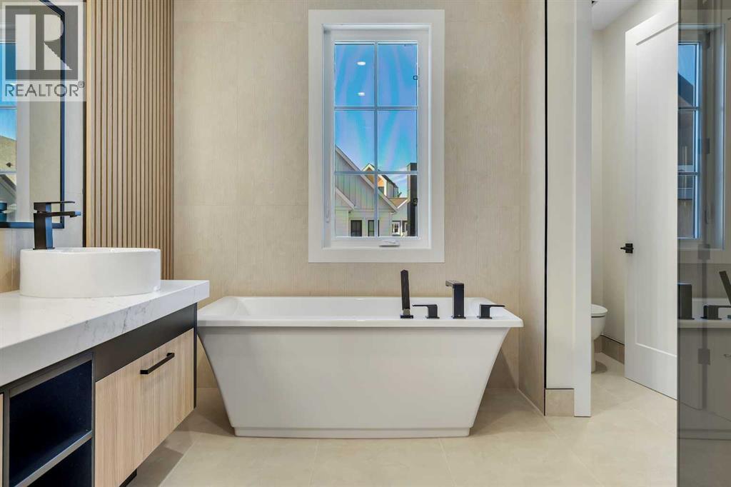 Welcome to HARMONY HAVEN — a stunning modern farmhouse that embodies the essence of contemporary living while embracing the warmth of rustic charm. Designed by PHASE ONE DESIGN and expertly built by DOMINIUM RESIDENTIAL, this home is perfectly situated in the desirable community of Currie, just 7 minutes from Downtown Calgary. With 3,256 square feet above grade and over 4,300 square feet of developed living area, HARMONY HAVEN offers ample space for both relaxation and entertaining. As you approach, the sleek, modern façade draws you in, promising the elegance that awaits within.The heart of this home is the exquisite kitchen, featuring a striking waterfall island, a through sink, and top-of-the-line Fisher & Paykel built-in panel-covered fridge and freezer. Cooking enthusiasts will appreciate the natural gas stove with pot filler, convection oven, and speed oven/microwave, all complemented by stylish three-tone custom cabinetry illuminated by under-cabinet lighting.The spacious living room is designed for comfort, showcasing built-in shelving, a cozy fireplace, and a stunning lighting fixture that adds a touch of sophistication. This inviting space offers beautiful views of the picturesque streetscape, creating a serene atmosphere.Safety is prioritized with stairway lighting, guiding you throughout the home. The double car garage is fully finished with paint and epoxy flooring, featuring a charging point for your electric vehicle—perfect for the eco-conscious homeowner.HARMONY HAVEN is equipped with advanced technology, including rough ins for voice commands, wiring for cameras, four two-speaker zones, indoor ceiling speakers with woofers, outdoor speakers for the deck, and myQ garage door openers for remote access. The fully landscaped yard is enclosed with premium vinyl fencing, providing both privacy and style.Retreat to the elegant ensuite, where you'll find heated floors, a spacious double vanity with custom mirrors, and a luxurious freestanding tu b. The second floor includes the luxurious primary bedroom and two large secondary bedrooms and bathroom plus a laundry room, storage close all perfect for family or guests.The loft floor consists of a bonus room, a large home office and an additional bedroom/flex room with a full bathroomThe breathtaking lower level is an entertainer's dream, featuring custom built-ins, a grand wet bar, and generous natural light. This versatile space also includes a large flex room and an additional bedroom.Located in one of Calgary’s premier inner-city communities, HARMONY HAVEN offers easy access to parks, dog parks, walking and biking trails, and over 12 schools catering to all age groups. This exceptional home seamlessly blends elegant design with modern conveniences, making it a must-see for any discerning buyer. Don’t miss your opportunity to claim this luxurious residence as your own! (id:58070)