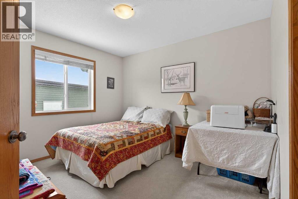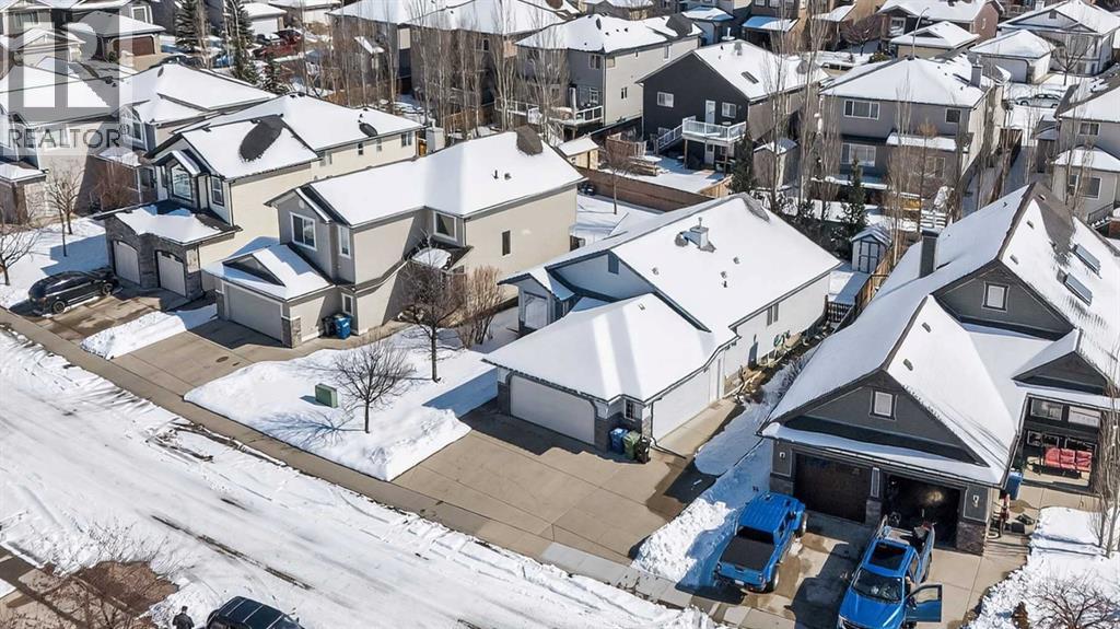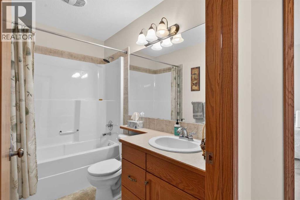 Welcome home! It’s rare to find an original owner bungalow of this size and value in Airdrie. From the moment you step into the spacious front entry, you’ll appreciate the thoughtful layout and inviting feel of this home. French doors lead you into a versatile front flex room, perfect for a home office, sitting area, or playroom, before opening into the bright, open concept main living space. The kitchen is truly the heart of the home, featuring a large eat up island, gleaming oak cabinetry with under mount lighting, select stainless steel appliances, a convenient corner pantry, and a skylight that fills the space with natural light. Just steps away, the generous family room offers a cozy gas fireplace, ideal for relaxing evenings, and large windows that overlook the backyard. The dining area flows seamlessly from the kitchen and provides direct access to the rear yard, making it perfect for entertaining. Outside, you’ll find a large deck with a natural gas BBQ hookup, a storage shed, and plenty of green space for kids and pets to enjoy. Down the hallway, you’ll find a conveniently located laundry room complete with a sink and direct access to the oversized, insulated double garage. The main floor also features a well sized second bedroom, a full four piece bathroom, and a spacious primary suite that easily accommodates a king sized bed. The primary retreat is complete with a walk in closet and a private four piece ensuite featuring a relaxing jetted tub. The fully finished lower level expands your living space with a massive recreation room, perfect for movie nights, games, or gatherings, along with two additional generously sized bedrooms, another full bathroom, and a dedicated storage area with a small workshop. Situated on a desirable, gently pie shaped lot, this home also offers a large driveway with room for two vehicles plus RV parking. Additional highlights include a high efficiency furnace and an unbeatable location, just steps from scenic walking and bike paths around the lake, within walking distance to schools, and close to shopping and everyday amenities.Don’t miss your opportunity to make this exceptional home yours. Book your private showing today! (id:58070)