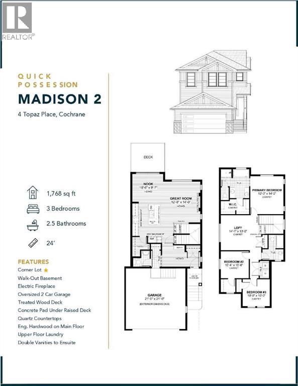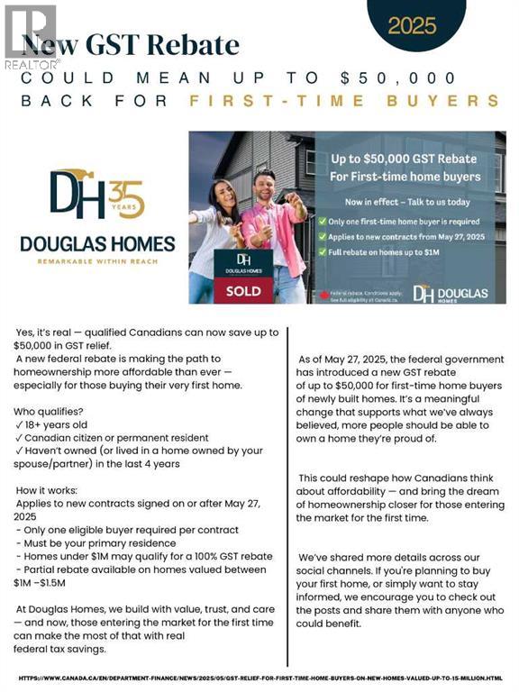 BRAND NEW HOME by Douglas Homes, Master Builder in central Greystone, short walking distance to parks, the Bow River, major shopping & interconnected pathway system. Featuring the Madison 2 on a corner lot, south facing back yard, walkout basement, deck off the main floor accented by built out columns on an R-MX zoned lot for POTENTIAL future lower level suite. NOTE: a secondary suite would be subject to approval and permitting by the city/municipality. Located on a quiet street, very close two Children's Play Parks & paved back lane. This gorgeous 3 bedroom, 2 & 1/2 half bath home offers over 1760 sq ft of living space. Loads of upgraded features in this beautiful, open floor plan. The main floor greets you with a grand glazed 8' front door, soaring 9' ceilings, oversized windows , & 8' 0" passage doors. Distinctive Engineered Hardwood floors flow through the Foyer, Hall, Great Room, Kitchen & Nook adding a feeling of warmth & style. The Kitchen is completed with an oversized entertainment island (7'0" single level island) & breakfast bar, roomy closet pantry with 8'0" French Door , Quartz Countertops, 42" Cabinet Uppers accented drop bulkhead, Pots & Pans Drawers, soft close doors & drawers throughout, new stainless appliance package including Side by Side Fridge with Ice and Water, Gas Range, Chimney Hood Fan, Built-In Microwave in the island & Built-In Dishwasher. The main floor is completed with an expansive, open Great Room & Nook finished with over height windows & Napoleon "Entice" fireplace. Ascending the second floor there is a large "U" shaped staircase complimented by black metal spindle railing naturally light by a large window. Upstairs you'll find a generous Primary Bedroom with 5 piece Ensuite including dual, separate, Quartz vanities with undermounted sinks, oversized 4'0" x 3'0" shower, 6'0" soaker tub with large window above, private water closet, & ceramic tile flooring. There is also a generous sized walk-in closet accessed from the Ensuite. T he 2nd floor is completed by a spacious, centralized Family Loft & two additional, good size bedrooms, one with WIC. The 2nd & 3rd bedrooms have the convenient access to the main bath with Quartz countertop, undermounted sink & tile flooring. You're certain to love the convenience of the 2nd Laundry completed with large access doors, light & tile flooring. This is a very popular plan, great for young families or for the upsizing crowd. Spacious, Beautiful and Elegant! The perfect place for your perfect home. Call today! Photos are from prior build & are reflective of fit, finish & included features. Note: Front elevation of home & interior photos are for illustration purposes only. Actual elevation style, interior colors/finishes, & upgrades may be different than shown & the Seller is under no obligation to provide them as such. Directions: Come to the Show Home first at 500 River Avenue. THIS HOME IS UNDER CONSTRUCTION. (id:58070)