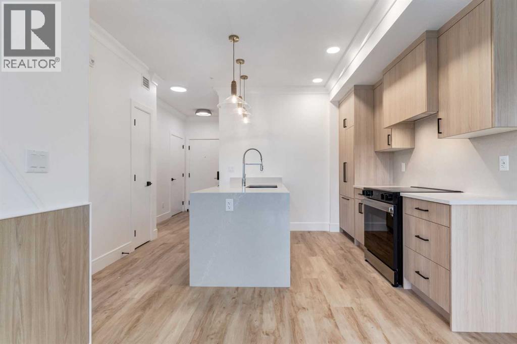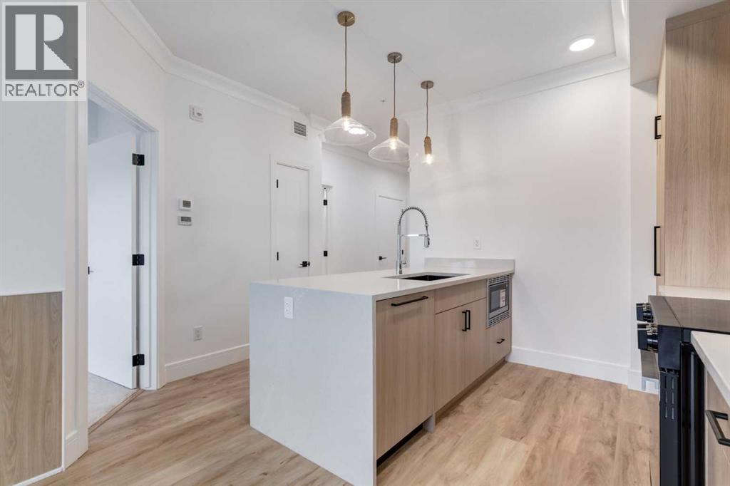 Experience boutique luxury with the Ambra model, a meticulously crafted 643 sq. ft. residence featuring 1 bedroom plus a versatile den. Designed with the serene Ethereal Zen palette, this home combines soft, calming tones with natural textures, creating a tranquil, elevated living environment.An open-concept layout is framed by a striking transient window, flooding the space with natural light and showcasing breathtaking downtown views. The chef-inspired kitchen features sleek, full-height cabinetry, quartz countertops, and premium finishes, blending elegance and functionality in every detail.The primary bedroom serves as a serene retreat, while the flexible den is ideal as a home office, private reading space, or guest room. A spa-inspired 4-piece bathroom completes the home, offering a refined touch to daily living.Perfect for those seeking a sophisticated home with panoramic city vistas, the Ambra model delivers a boutique lifestyle where luxury and design meet in perfect harmony.This pet-friendly and AIRBNB-friendly building offers titled heated underground parking and plenty of visitor spaces. Ideally located minutes from downtown, Mount Royal University, and the vibrant amenities of 17th Ave and Marda Loop, the Argento floorplan is a rare gem. Limited units are available—secure your slice of modern living today! **Photos are taken from existing building of the same models. Not of the exact unit ** (id:58070)
