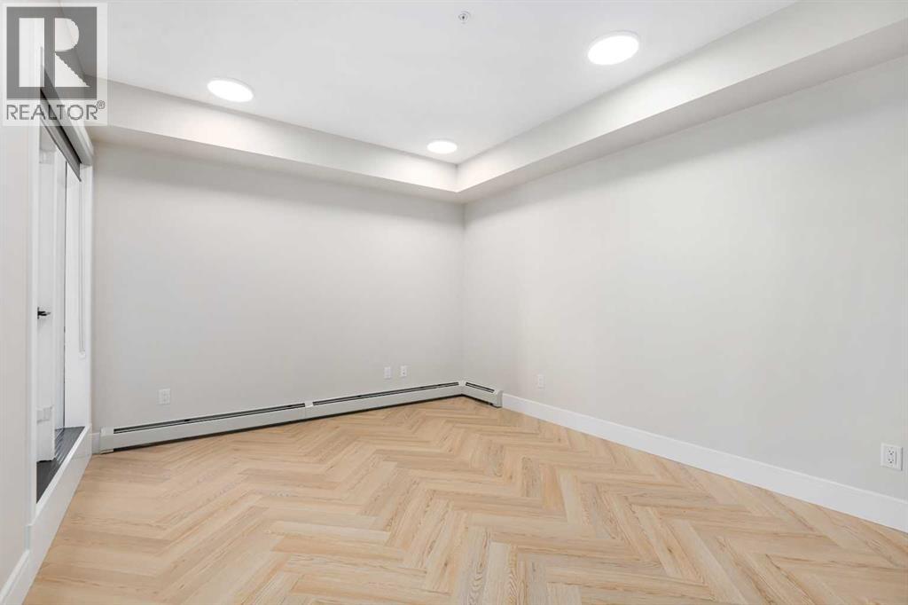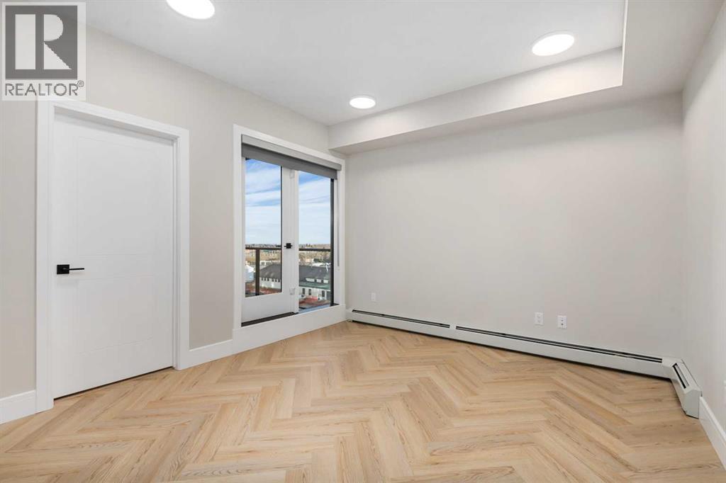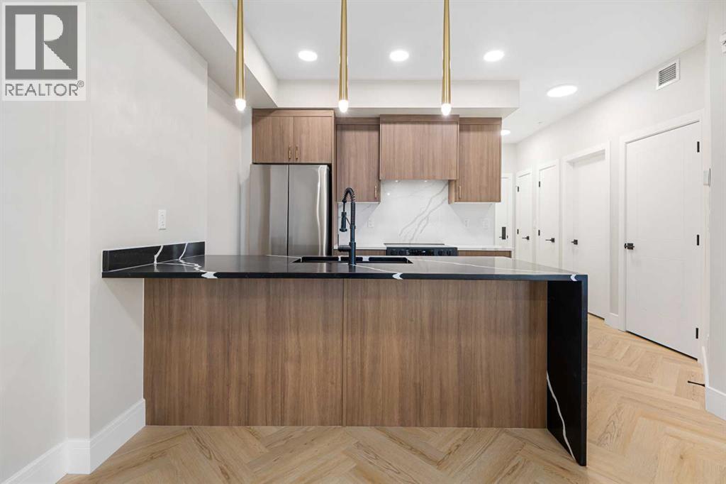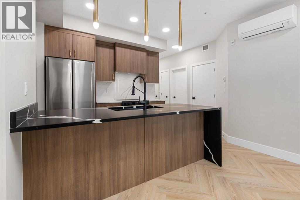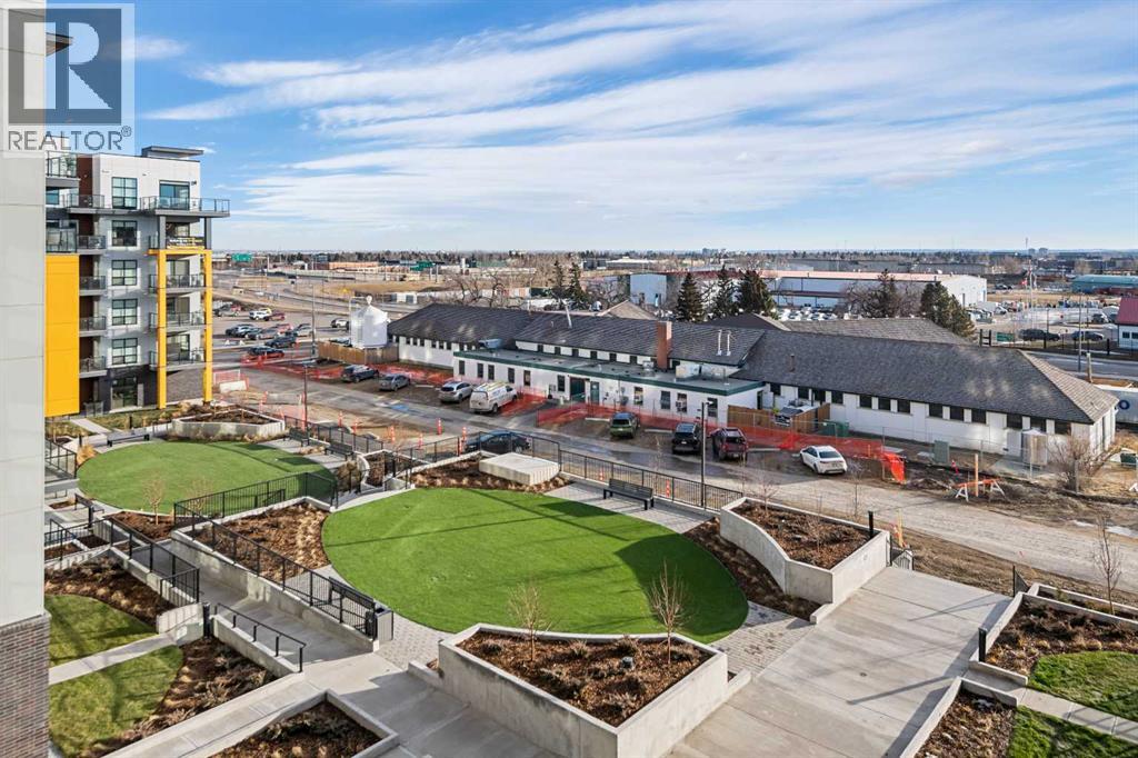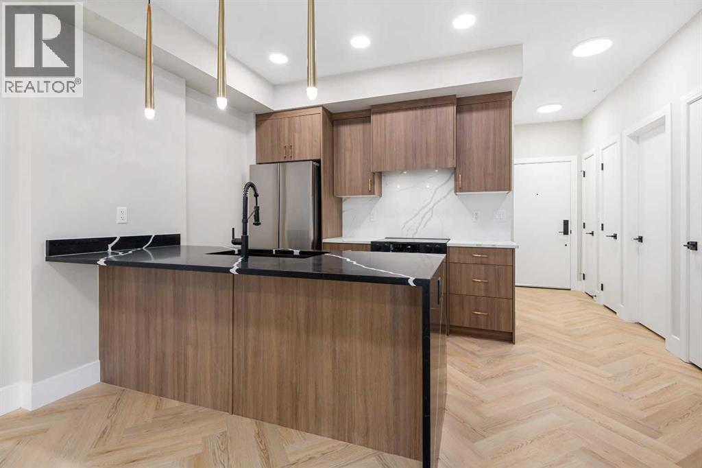 Welcome to the “Azzuro” floorplan by Rohit Homes Calgary, a thoughtfully designed 1-bedroom + den, 1-bathroom residence that blends timeless style with modern functionality. Located on the 4th floor of the highly sought-after Quesnay at Currie Barracks, this south-facing unit enjoys excellent natural light throughout the day and offers the added convenience of being situated near the elevator—ideal for everyday ease and accessibility.Finished in the elegant Neoclassical design palette, the Azzuro delivers a refined aesthetic with warm tones, clean lines, and elevated detailing. This smart layout features 9’ ceilings, quartz countertops with a waterfall edge, a coordinating quartz backsplash, full-height cabinetry, stainless steel appliances, designer lighting, and window coverings. The open-concept kitchen, dining, and living areas flow seamlessly together, creating a welcoming and efficient space for both relaxing and entertaining.The primary bedroom provides a comfortable retreat, while the versatile den is perfect for a home office, study, or additional storage—one of the most sought-after features of this floorplan. The spa-inspired bathroom includes fully tiled walls, polished finishes, and a tub/shower combination for a hotel-like feel. Step out onto your private south-facing balcony to enjoy sunshine and courtyard views.This pet-friendly and AIRBNB-friendly building includes titled heated underground parking and ample visitor parking. Ideally located just minutes from downtown Calgary, Mount Royal University, and the vibrant shops and restaurants of 17th Ave and Marda Loop, this home offers both convenience and lifestyle.The Azzuro is a popular and well-loved floorplan - Don’t miss your opportunity to own in one of Calgary’s most exciting inner-city communities. (id:58070)