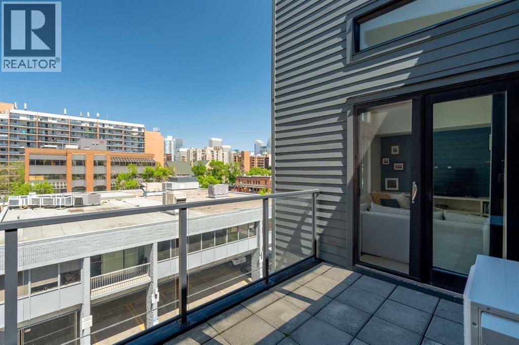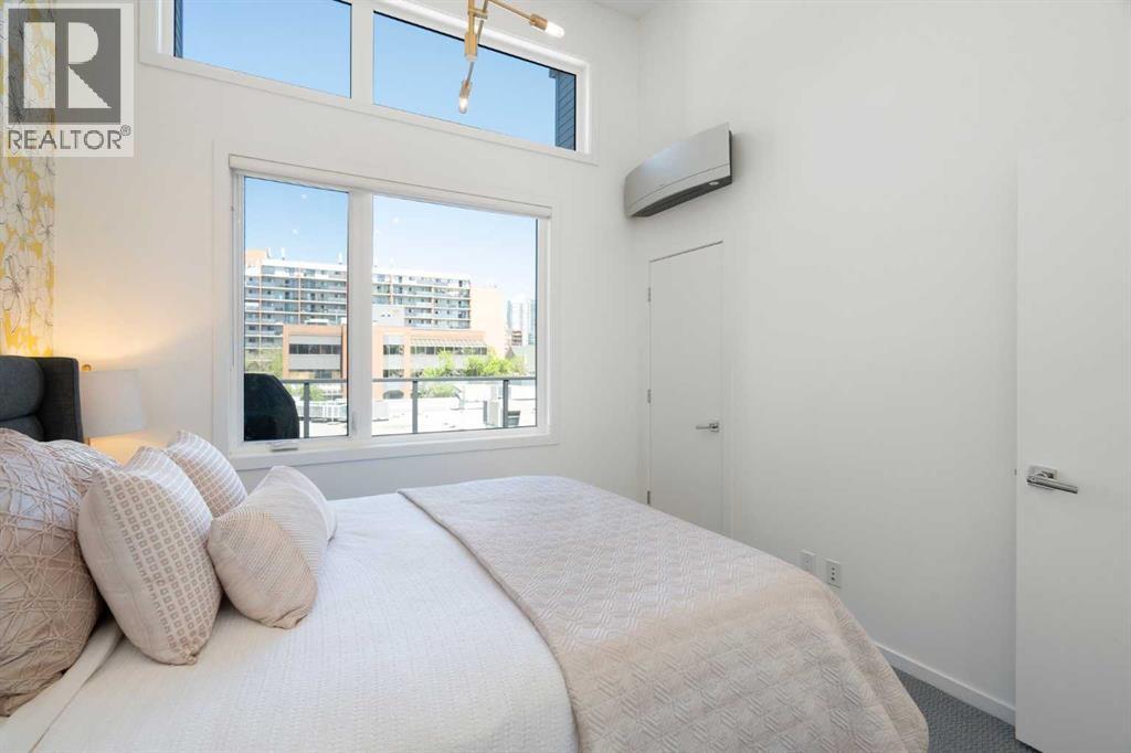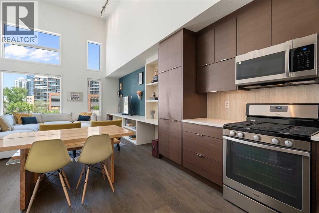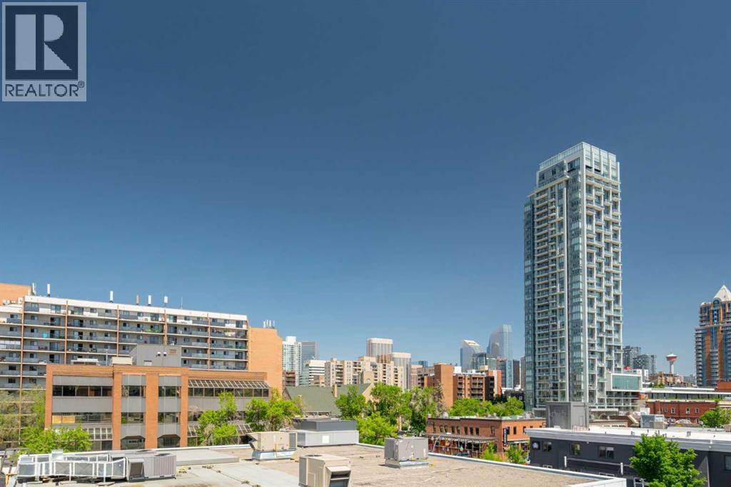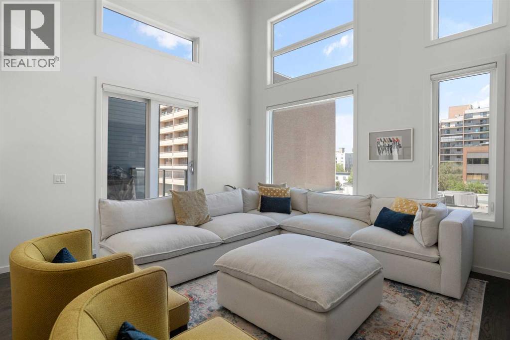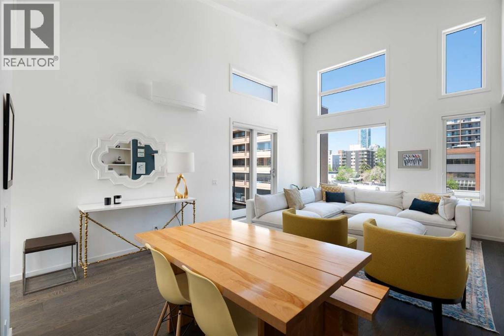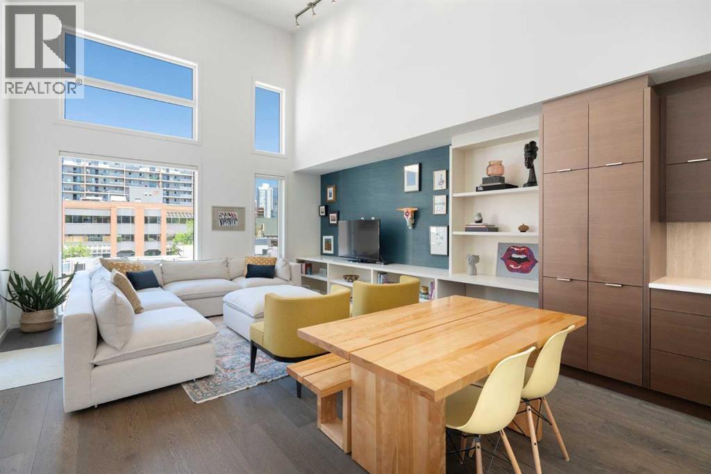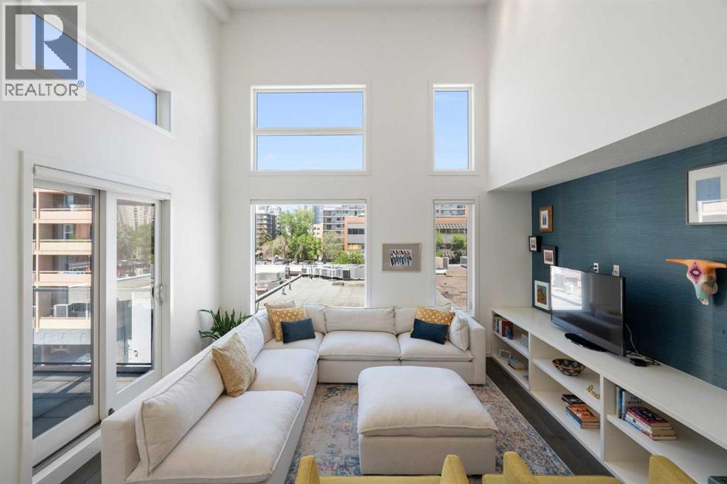 Welcome to The Block, one of Calgary’s most architecturally distinctive communities just off vibrant 17th Avenue. Designed by Sturgess Architecture and built by Avi Urban, this boutique development is known for its rare private courtyard concept — each residence opens directly to the outdoors, creating a sense of community, privacy, and independence that’s truly unmatched in the downtown core.This top-floor penthouse loft is one of the most desirable suites in the complex. Soaring 14’ vaulted ceilings and hardwood floors throughout create an airy, dramatic living space, while massive windows flood the home with natural light. A custom wall of built-ins anchors the living room with both style and functionality. The sleek kitchen features stainless steel appliances, lacquered cabinetry, and generous storage — perfect for both everyday living and entertaining. Step out onto your private deck with city views, complete with gas access for easy BBQ evenings. The spacious primary bedroom offers large windows and convenient access to a beautifully appointed bathroom with walk-in glass shower and modern vanity. The second bedroom is thoughtfully designed with a full wall of built-in storage, making it ideal for guests, a home office, or both. Complete with titled parking, additional storage, built-in laundry, and air conditioning, this is effortless urban living at its finest. Now offered at a significantly improved price, this penthouse represents outstanding value in one of Calgary’s most dynamic inner-city locations. Don’t miss your opportunity to experience The Block at its very best. (id:58070)