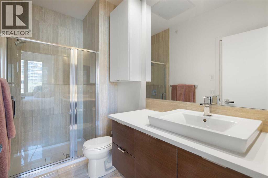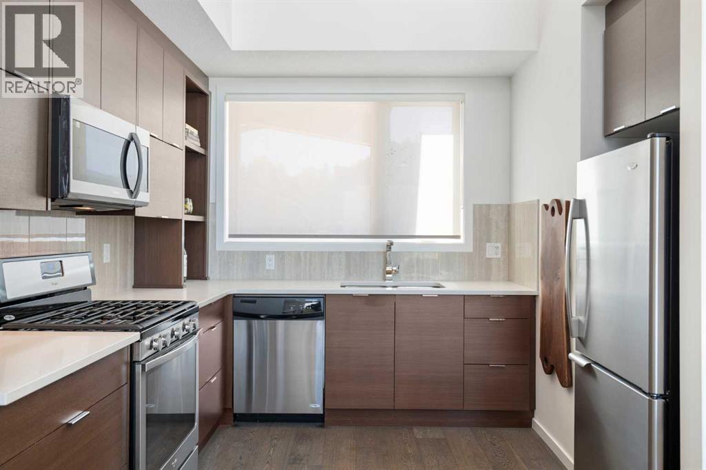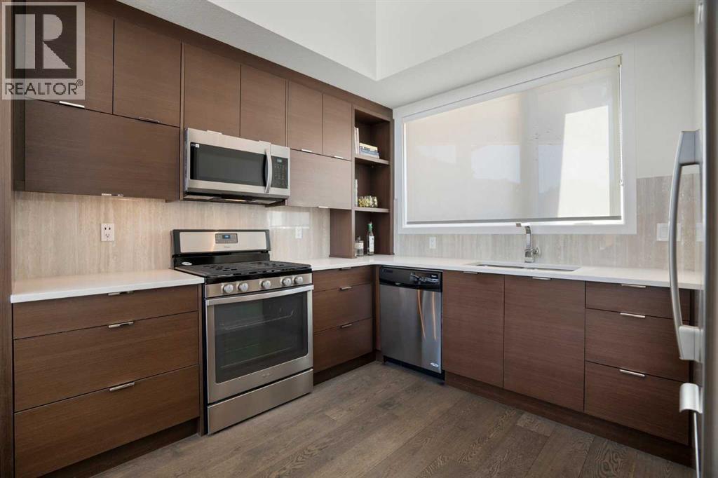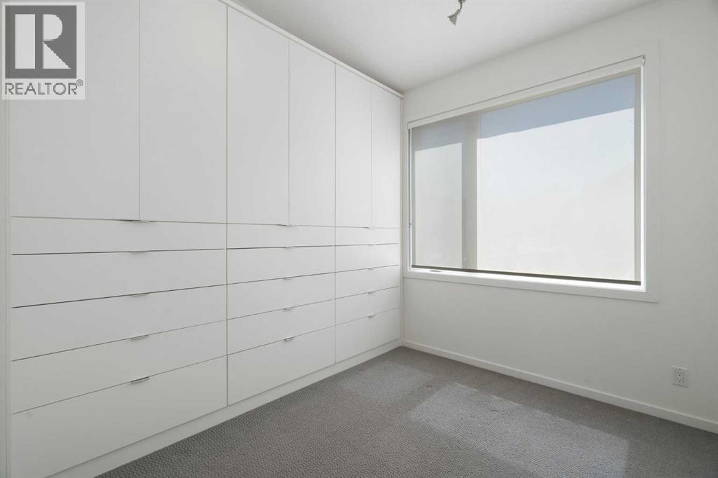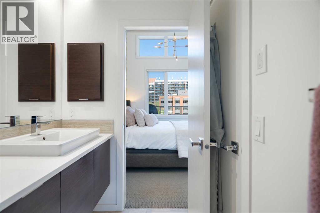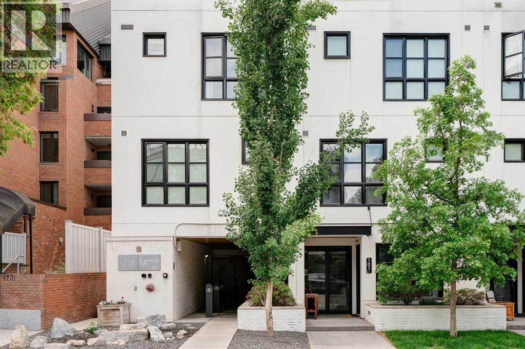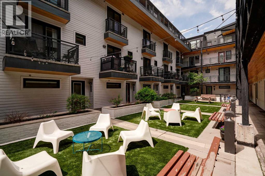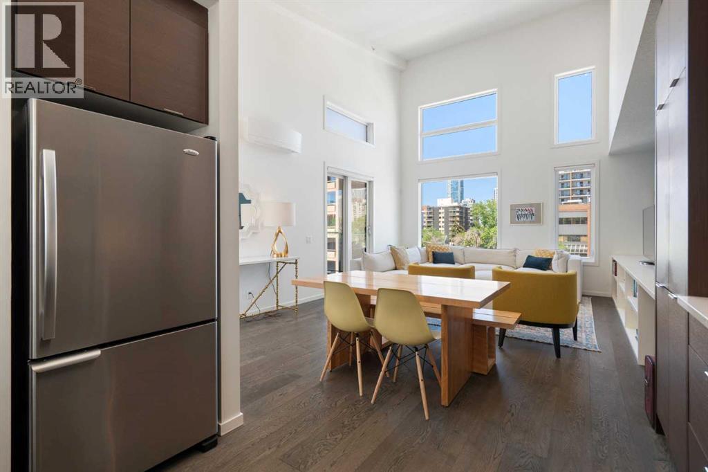 Welcome to The Block, one of Calgary’s most architecturally distinctive communities just off vibrant 17th Avenue. Designed by Sturgess Architecture and built by Avi Urban, this boutique development is known for its rare private courtyard concept — each residence opens directly to the outdoors, creating a sense of community, privacy, and independence that’s truly unmatched in the downtown core.This top-floor penthouse loft is one of the most desirable suites in the complex. Soaring 14’ vaulted ceilings and hardwood floors throughout create an airy, dramatic living space, while massive windows flood the home with natural light. A custom wall of built-ins anchors the living room with both style and functionality. The sleek kitchen features stainless steel appliances, lacquered cabinetry, and generous storage — perfect for both everyday living and entertaining. Step out onto your private deck with city views, complete with gas access for easy BBQ evenings. The spacious primary bedroom offers large windows and convenient access to a beautifully appointed bathroom with walk-in glass shower and modern vanity. The second bedroom is thoughtfully designed with a full wall of built-in storage, making it ideal for guests, a home office, or both. Complete with titled parking, additional storage, built-in laundry, and air conditioning, this is effortless urban living at its finest. Now offered at a significantly improved price, this penthouse represents outstanding value in one of Calgary’s most dynamic inner-city locations. Don’t miss your opportunity to experience The Block at its very best. (id:58070)