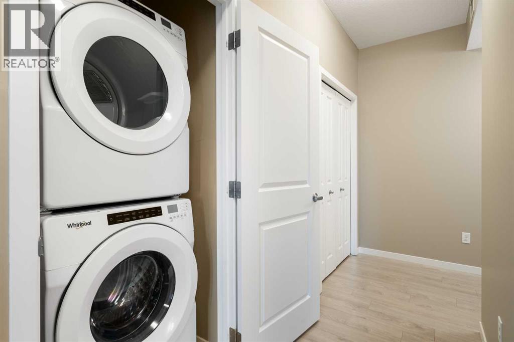 Your opportunity to make your next home in Sandgate, a great condo complex in the highly desirable lake community of Mahogany. This well designed and upgraded 2-bedroom, 2-bathroom corner unit with 900 sq. ft. of living space located on the top floor with a southwest exposure is a rare find. As you approach the unit, you will notice it is located at the end of the wide hallway, being one of 2 units sharing the entire end of the building. Open the door and you will experience the bright crisp freshness of this contemporary home. The 9’ knock down ceilings, vinyl plank flooring, and 2 closets for plenty of storage are great features. A few steps forward and you will be in the open living area with a 10’ ceiling and many windows flooding the space with natural light. Take a look at the gourmet kitchen. There is a massive island with breakfast bar, white quartz counter tops, an abundance of upgraded shaker cabinets with tall upper cabinets, soft closing doors and drawers, an abundance of pot drawers with under-mounted rollers, stainless steel appliances and a water purifier. The generous living room opens to the south facing large balcony with gas line and barbeque. A wall mounted air conditioner with separate compressor keeps the living area comfortable on those wonderful summer days. Wide slat venetian blinds throughout the unit provide the option to block out the light and heat. The spacious primary bedroom features a large walk-through closet and a 3-piece en-suite bathroom with quartz counter, tile floor, walk-in shower and a medicine cabinet. On the opposite side of the unit there is a second bedroom located beside a 4-piece bathroom with quartz counter, tile floor and a medicine cabinet. The stacked front-loading washer/dryer complete this wonderful home. Lightly lived in and well maintained, this unit has been professionally repainted in neutral colours and is move-in ready. There is a titled underground parking stall with a caged storage locker just down the st airwell beside this unit or take a short walk and ride the elevator. The complex offers a bicycle storage room, fitness center in building 10 and 2 guest suites. All this is located within walking distance of the heart of Mahogany with shops, services and all of the lake amenities including a clubhouse, swimming, skating, tennis courts, fishing and so much more. You have easy access to Stoney Trail and only minutes to the South Calgary Health Campus, Brookfield YMCA, public library and the future LRT station. Check it out today! (id:58070)