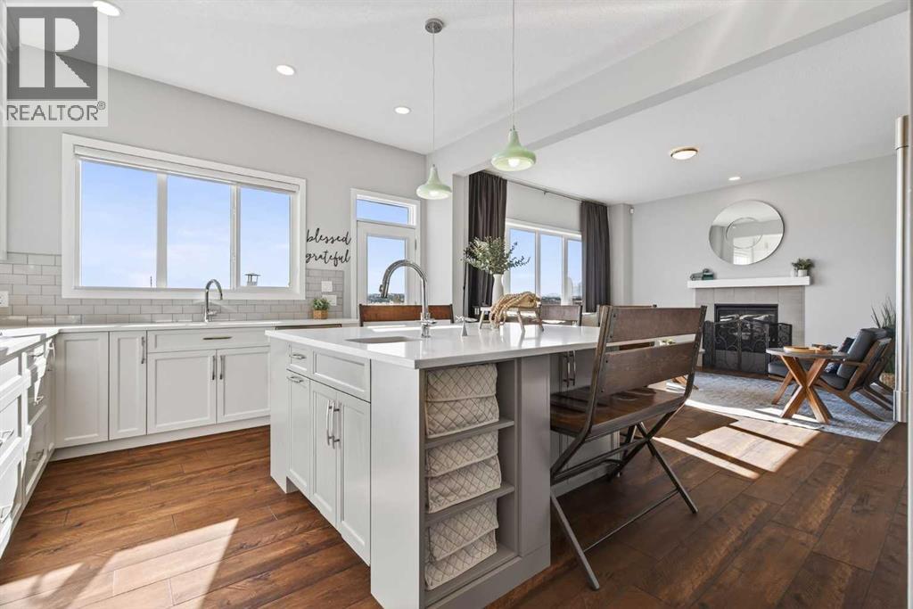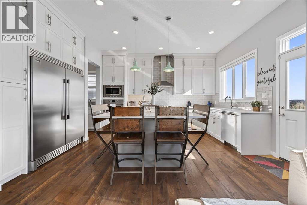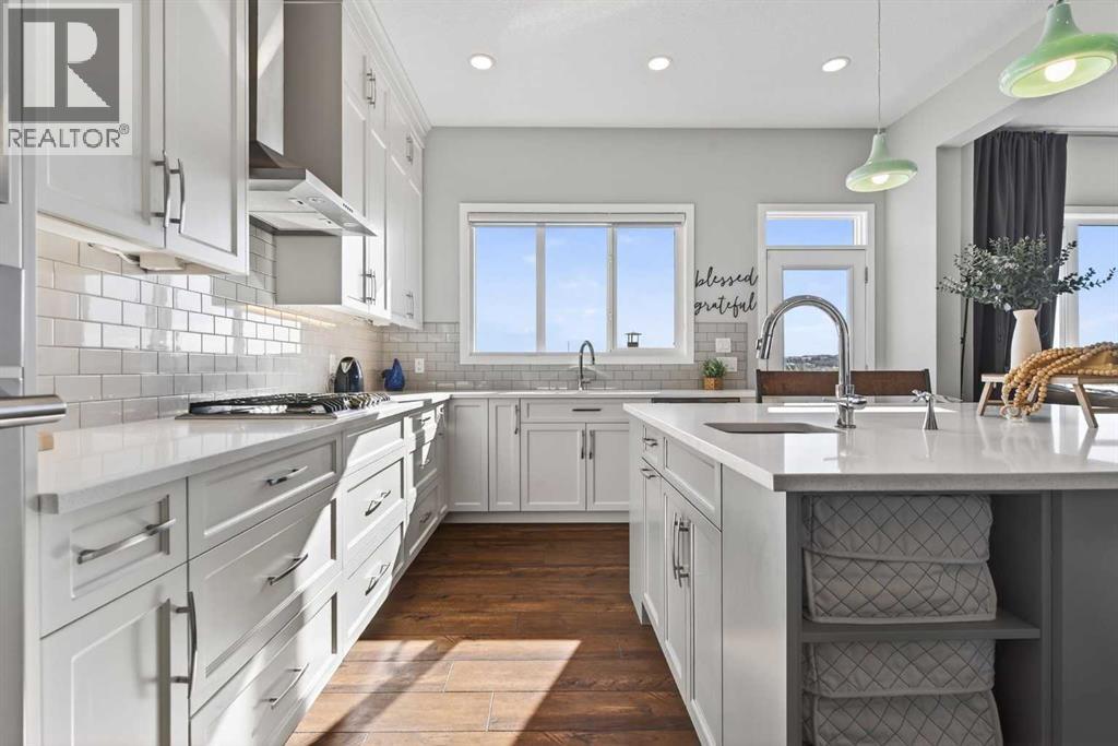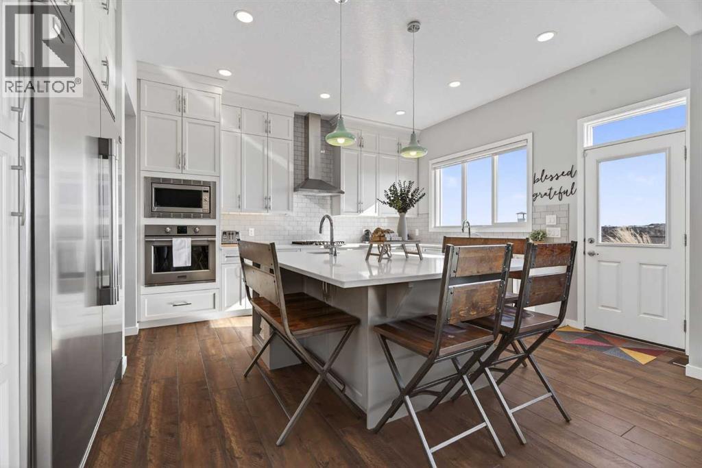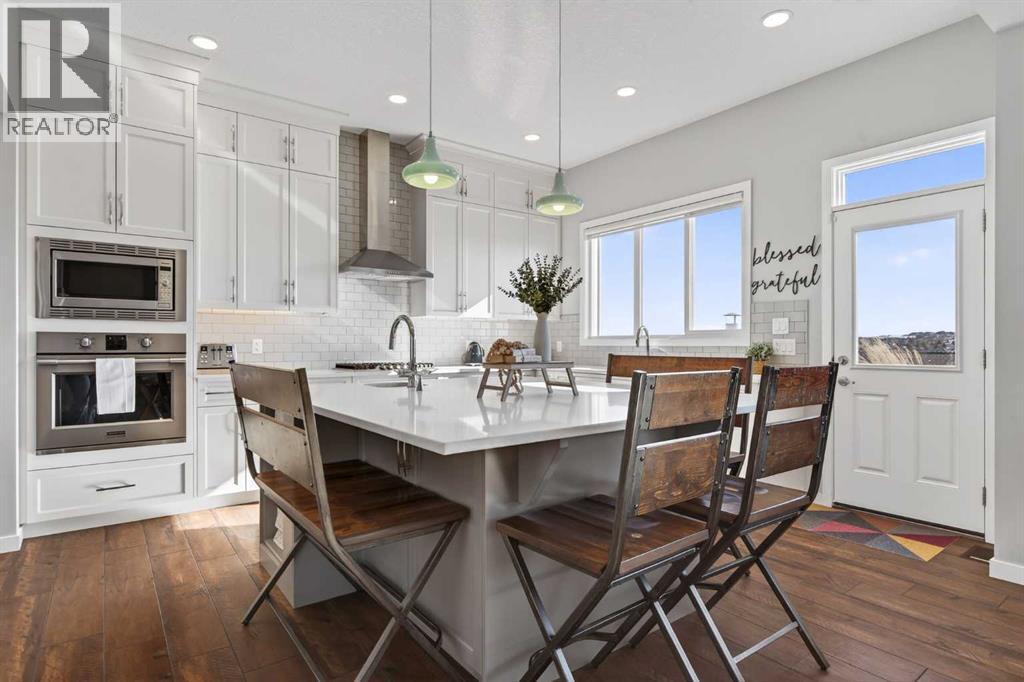 ~PANORAMIC 180 DEGREE VIEWS~Enjoy the twinkling lights of the town, the sound of trickling water while overlooking the Sheep River, and the majestic Rocky Mountains all in one glance. Perfectly placed at the top of the ridge in one of Okotoks most family friendly communities is 47 MIST MOUNTAIN RISE. This exceptional home will be sure to impress the moment you pull up to the twinkling GEMSTONE lights &stunning EXPOSED AGGREGATE driveway. Upgraded with a fully wrapped HARDIE BOARD exterior, the extra touches will continue to shine throughout the interior of the home. The 10 FOOT CEILINGS on the main floor will be sure to capture your eye as you enter the spacious tiled front entry. Enjoy the front flex space that can be used as a hobby space, music room, or home office. This open floor plan is perfect for entertaining! The chef-inspired kitchen is the heart of the home, featuring UPGRADED CEILING HIGH CABINETRY, QUARTZ countertops , UNDERMOUNT LIGHTING, a massive sit up island, BUILT IN OVEN & MICROWAVE , GAS COOKTOP , and a BUTLERS PANTRY! The inviting family room features a gas fireplace with a modern tile surround, creating the perfect space to relax or entertain. Adjacent to the living area, the generous dining space easily accommodates large family gatherings and dinner parties. TRIPLE PANE WINDOWS are just another upgrade you will appreciate while touring this beautiful home. Your eyes will be drawn to the IMMENSE VIEWS out every window of the south facing yard. Beautiful railing leads up the staircase to the spacious upper level where a comfortable bonus room offers the ideal setting for movie nights or family downtime. On this upper level you’ll find FOUR BEDROOMS including a luxurious primary retreat with a spa-inspired ensuite featuring dual sinks, a walk-in shower, a relaxing soaker tub, and a grand walk-in closet. You will love the size of the conveniently located upper-floor laundry room. The lower level offers approximately 1,100 sq ft of undevelope d space, with 2 windows and rough in plumbing, ready to be customized to suit your needs. The OVERSIZED DOUBLE GARAGE can easily ACCOMODATE YOUR TRUCK while still providing space for another vehicle and storage. Once you have fallen in love with inside ... then step outside to a TRUE BACKYARD OASIS!! Relax on the 20'x20' COMPOSITE DECK while watching the clouds drift through the big Alberta skies. Enjoy watching wildlife while picking vegetables out of the raised garden beds. This yard has been landscaped to perfection!! Imagine making a coffee in your new butlers pantry, then enjoying it while watching the kids play on the PERFECT GRASS, all while gazing at the outstanding mountain views. Its all possible here!! Backing onto the expansive Okotoks pathway system, enjoy the outdoor lifestyle this home offers. With its incredible ridge-top location, spectacular views, and thoughtfully designed layout, this home offers the perfect balance of style, size, comfort, and functionality for family living. (id:58070)