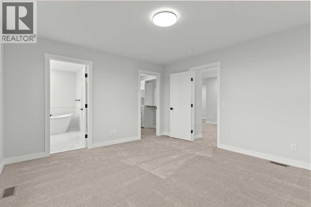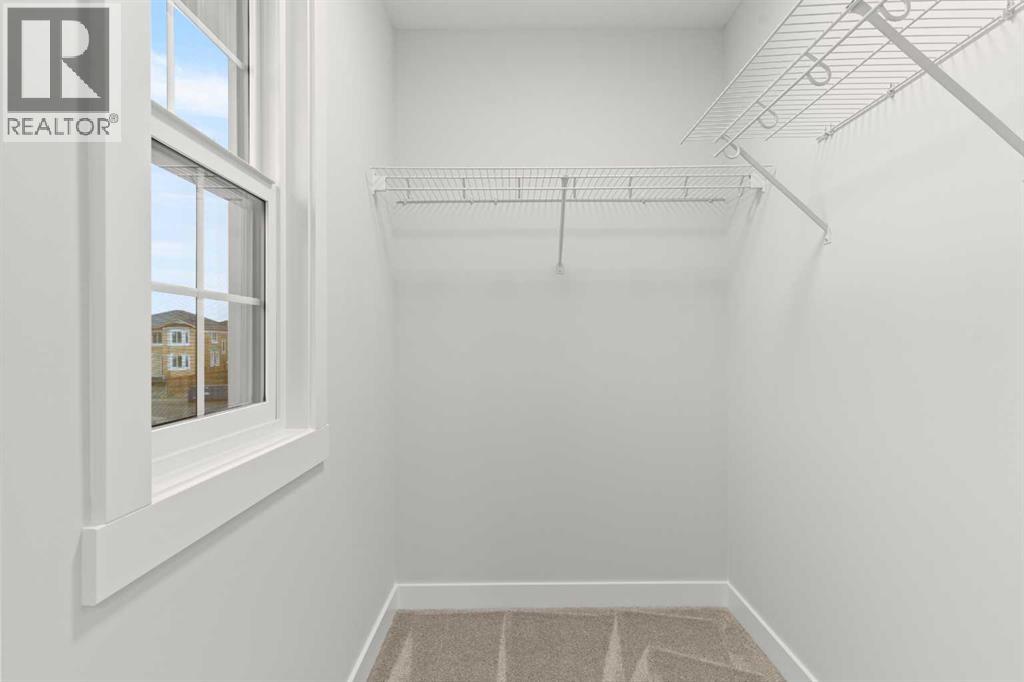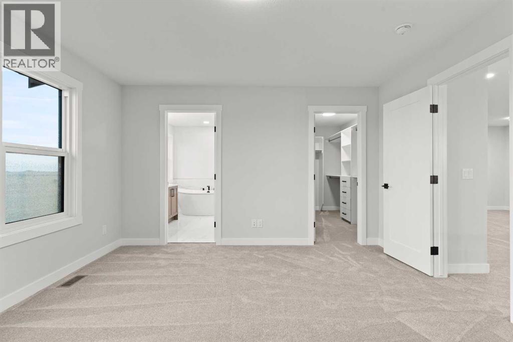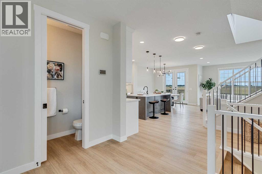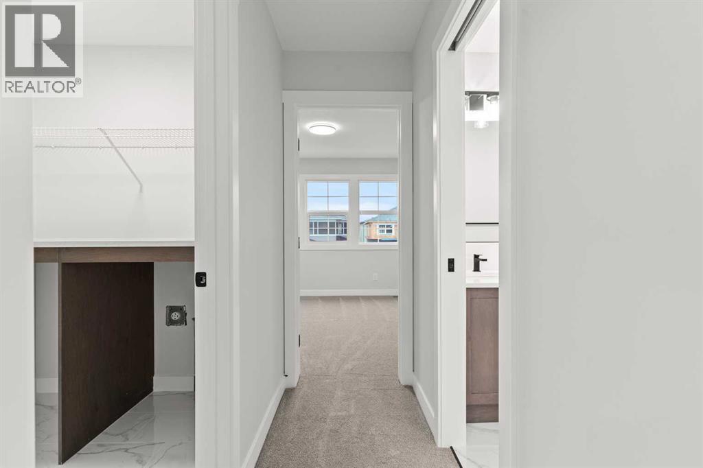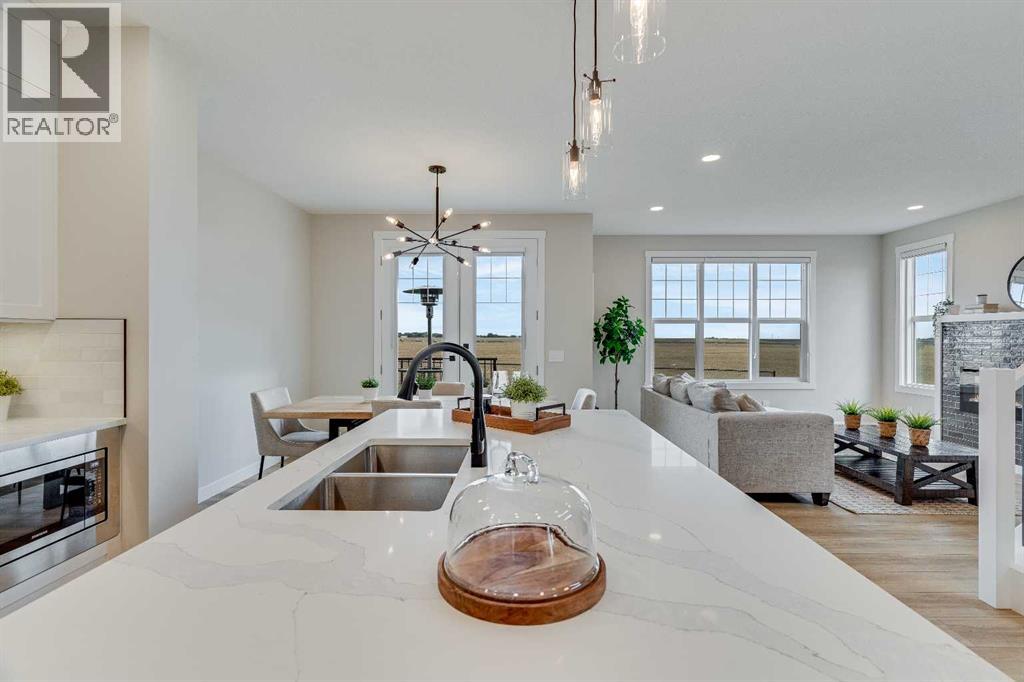 This beautifully designed 2134 SQFT semi-detached home, built by 5-star builder Golden Homes, sits on a conventional lot with an oversized double car front-attached garage, offering the perfect combination of functionality and modern craftsmanship in one of Chestermere’s most desirable communities.The main floor welcomes you with 9-foot ceilings, 8-foot doors, and an open-concept layout that’s both spacious and practical. The heart of the main floor is the upgraded kitchen, featuring two-tone cabinetry—Chantilly Lace white perimeter cabinets and a light wood island—quartz countertops in the kitchen and throughout the home, soft-close drawers with metal sides, and upgraded Samsung stainless steel appliances. The main floor also features a built-in microwave with a luxury stainless steel trim and a walk-in pantry with built-in shelves, ideal for storing everything from food to small appliances and dishware.The main level continues with a large dining area filled with light from the oversized triple-pane windows, a cozy living room with an electric fireplace, and glass sliding doors that lead to your backyard. Additional highlights include a half bath, side entrance, and a finished staircase to the basement, offering endless future development opportunities. The basement is fully roughed-in and includes a separate mechanical room for added safety and convenience.Making your way upstairs, you’re greeted by an oversized staircase with iron spindle railings and an open-to-below feature that adds even more space and light. The primary bedroom offers luxury finishings with a 5-piece ensuite, showcasing a fully tiled shower with glass doors, freestanding tub, double vanity, and a private enclosed toilet. The walk-in closet is custom-designed with built-in drawers and shelving.Two additional bedrooms each have their own walk-in closets and share a well-designed Jack & Jill bathroom with a double vanity and a separated toilet/shower space—perfect for daily convenience. The upper level also includes a laundry room with quartz countertop and shelving.Located in the family-friendly neighborhood of Kinniburgh South, this is your opportunity to own a brand new, thoughtfully upgraded home close to schools, parks, and everyday amenities an be part of the Golden Homes family! Pictures of same model. Selection specification are subject to change. (id:58070)