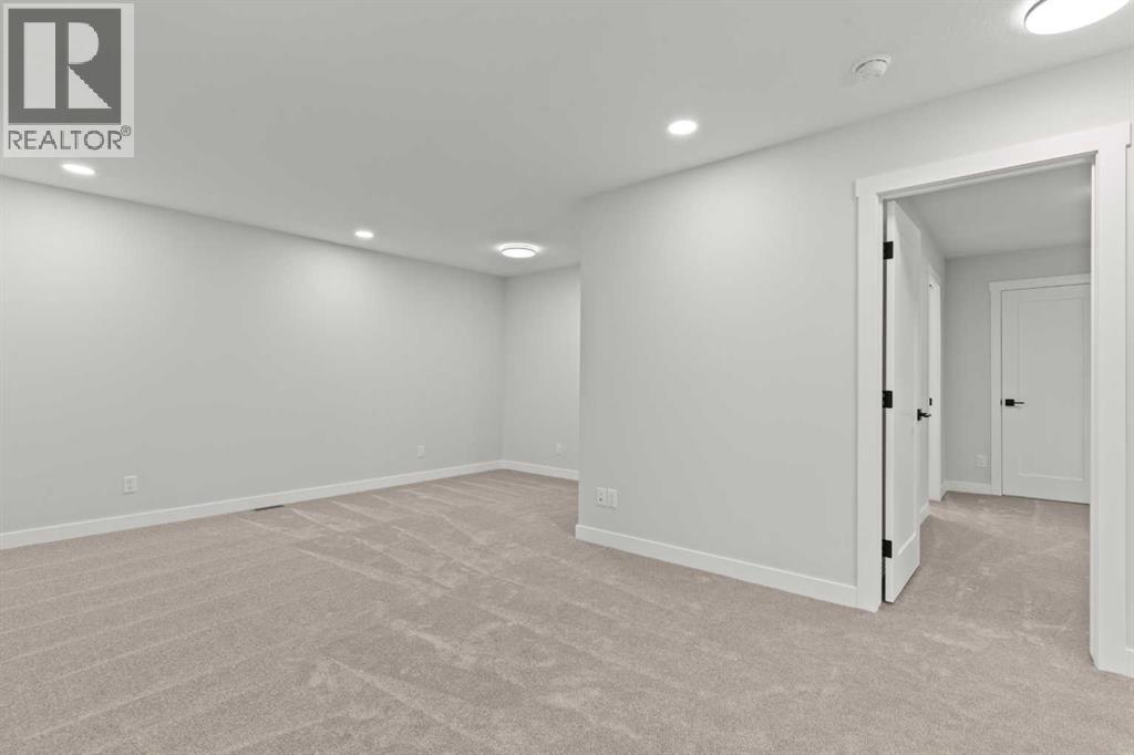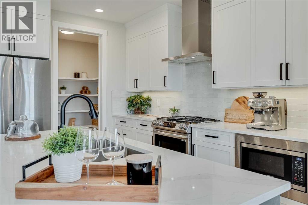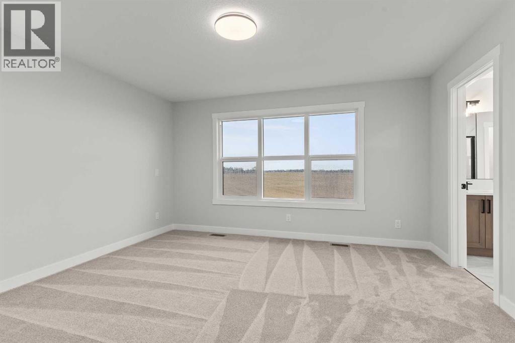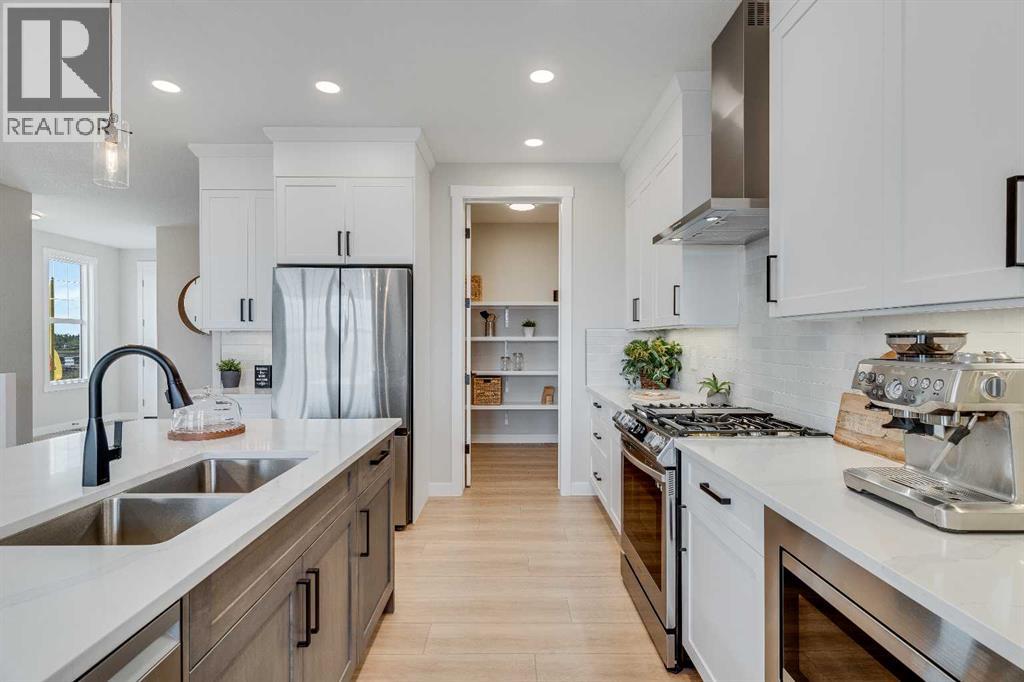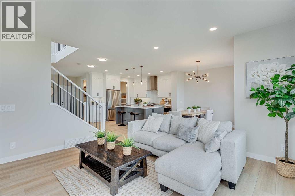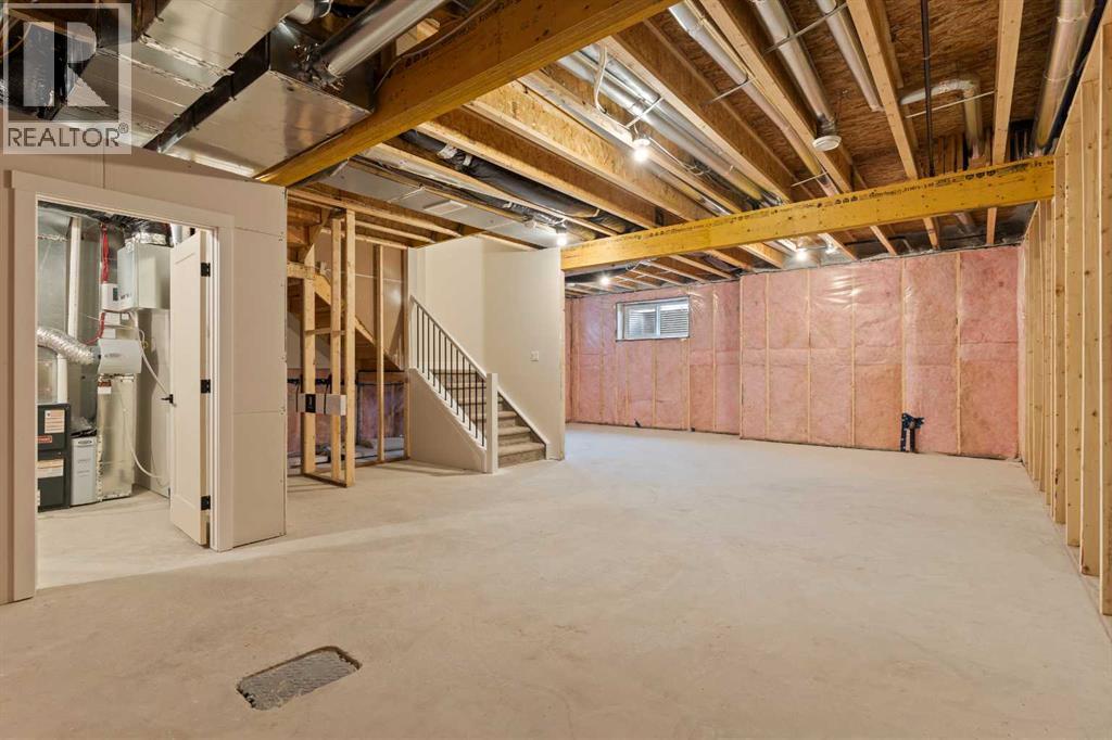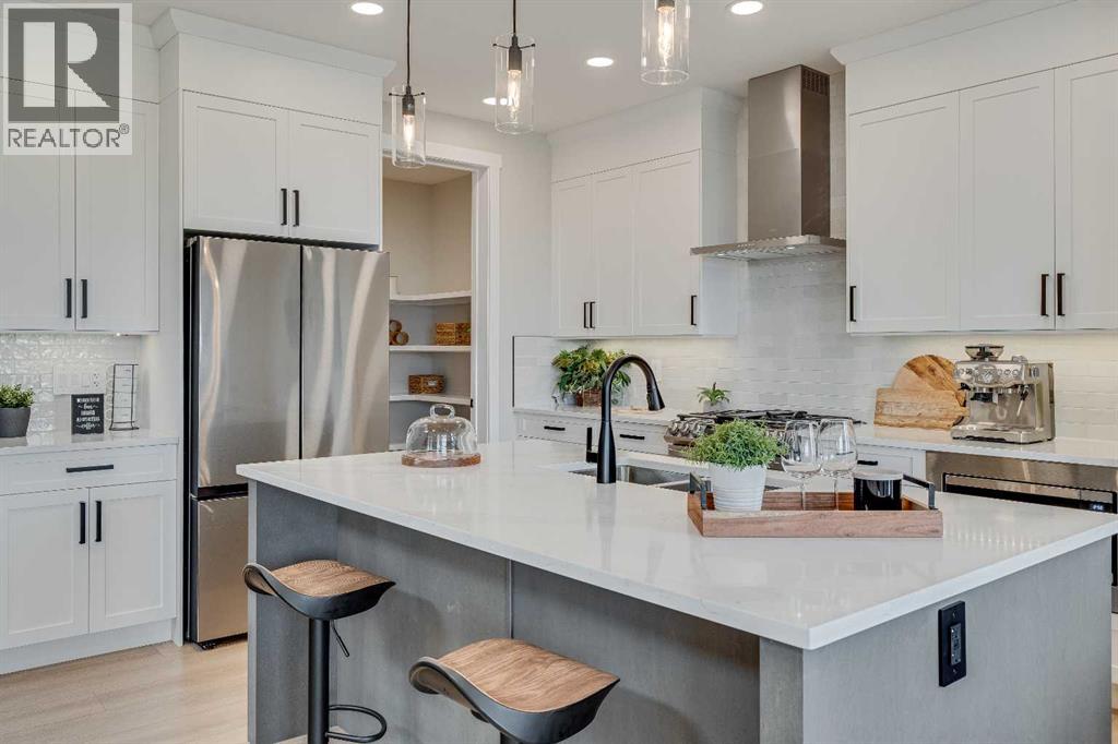 This beautifully designed 2134 SQFT semi-detached home, built by 5-star builder Golden Homes, sits on a conventional lot with an oversized double car front-attached garage, offering the perfect combination of functionality and modern craftsmanship in one of Chestermere’s most desirable communities.The main floor welcomes you with 9-foot ceilings, 8-foot doors, and an open-concept layout that’s both spacious and practical. The heart of the main floor is the upgraded kitchen, featuring two-tone cabinetry—Chantilly Lace white perimeter cabinets and a light wood island—quartz countertops in the kitchen and throughout the home, soft-close drawers with metal sides, and upgraded Samsung stainless steel appliances. The main floor also features a built-in microwave with a luxury stainless steel trim and a walk-in pantry with built-in shelves, ideal for storing everything from food to small appliances and dishware.The main level continues with a large dining area filled with light from the oversized triple-pane windows, a cozy living room with an electric fireplace, and glass sliding doors that lead to your backyard. Additional highlights include a half bath, side entrance, and a finished staircase to the basement, offering endless future development opportunities. The basement is fully roughed-in and includes a separate mechanical room for added safety and convenience.Making your way upstairs, you’re greeted by an oversized staircase with iron spindle railings and an open-to-below feature that adds even more space and light. The primary bedroom offers luxury finishings with a 5-piece ensuite, showcasing a fully tiled shower with glass doors, freestanding tub, double vanity, and a private enclosed toilet. The walk-in closet is custom-designed with built-in drawers and shelving.Two additional bedrooms each have their own walk-in closets and share a well-designed Jack & Jill bathroom with a double vanity and a separated toilet/shower space—perfect for daily convenience. The upper level also includes a laundry room with quartz countertop and shelving.Located in the family-friendly neighborhood of Kinniburgh South, this is your opportunity to own a brand new, thoughtfully upgraded home close to schools, parks, and everyday amenities an be part of the Golden Homes family! Pictures of same model. Selection specification are subject to change. (id:58070)