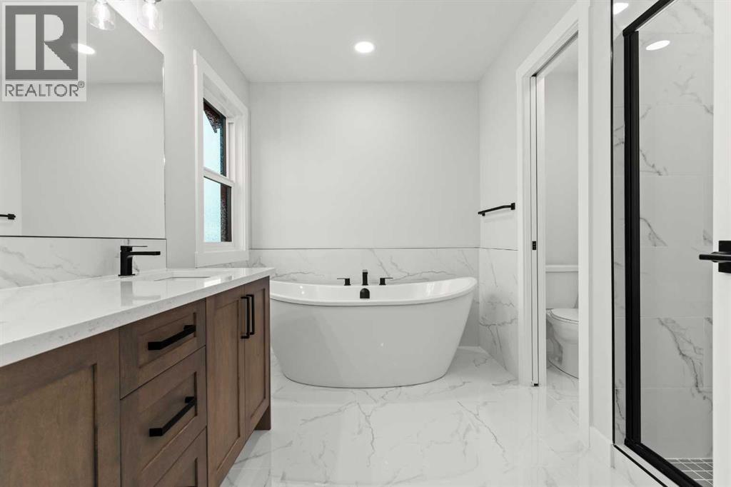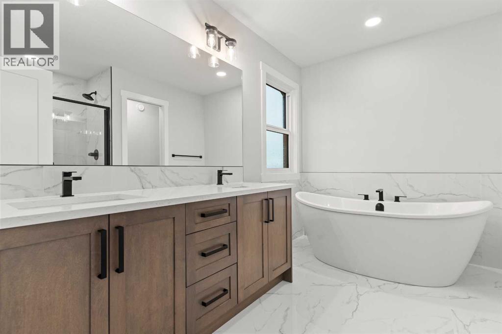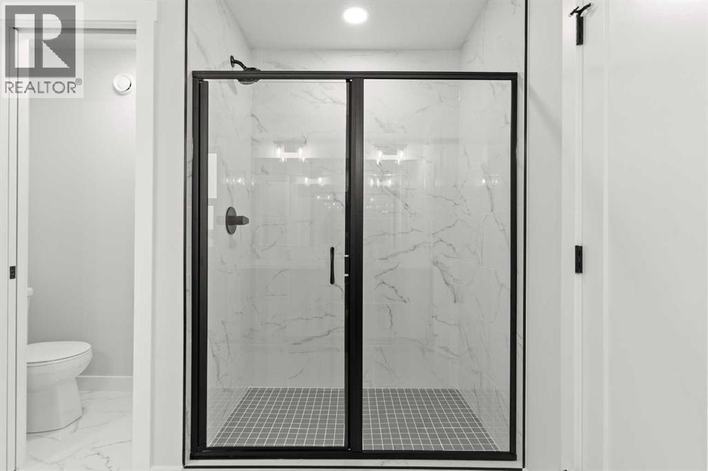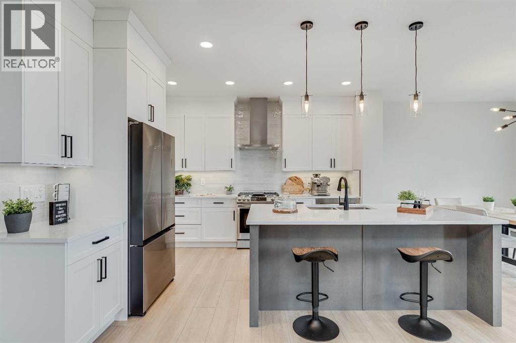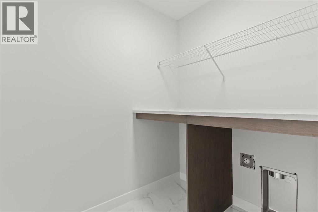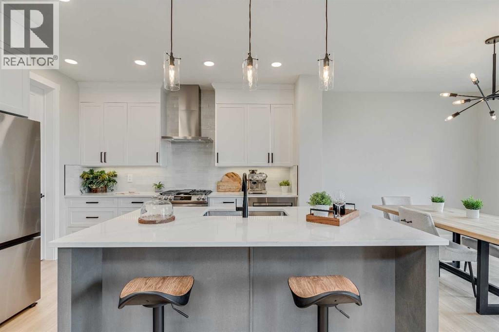 This beautifully designed 2134 SQFT semi-detached home, built by 5-star builder Golden Homes, sits on a conventional lot with an oversized double car front-attached garage, offering the perfect combination of functionality and modern craftsmanship in one of Chestermere’s most desirable communities.The main floor welcomes you with 9-foot ceilings, 8-foot doors, and an open-concept layout that’s both spacious and practical. The heart of the main floor is the upgraded kitchen, featuring two-tone cabinetry—Chantilly Lace white perimeter cabinets and a light wood island—quartz countertops in the kitchen and throughout the home, soft-close drawers with metal sides, and upgraded Samsung stainless steel appliances. The main floor also features a built-in microwave with a luxury stainless steel trim and a walk-in pantry with built-in shelves, ideal for storing everything from food to small appliances and dishware.The main level continues with a large dining area filled with light from the oversized triple-pane windows, a cozy living room with an electric fireplace, and glass sliding doors that lead to your backyard. Additional highlights include a half bath, side entrance, and a finished staircase to the basement, offering endless future development opportunities. The basement is fully roughed-in and includes a separate mechanical room for added safety and convenience.Making your way upstairs, you’re greeted by an oversized staircase with iron spindle railings and an open-to-below feature that adds even more space and light. The primary bedroom offers luxury finishings with a 5-piece ensuite, showcasing a fully tiled shower with glass doors, freestanding tub, double vanity, and a private enclosed toilet. The walk-in closet is custom-designed with built-in drawers and shelving.Two additional bedrooms each have their own walk-in closets and share a well-designed Jack & Jill bathroom with a double vanity and a separated toilet/shower space—perfect for daily convenience. The upper level also includes a laundry room with quartz countertop and shelving.Located in the family-friendly neighborhood of Kinniburgh South, this is your opportunity to own a brand new, thoughtfully upgraded home close to schools, parks, and everyday amenities an be part of the Golden Homes family! Pictures of same model. Selection specification are subject to change. (id:58070)
