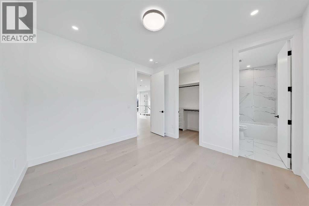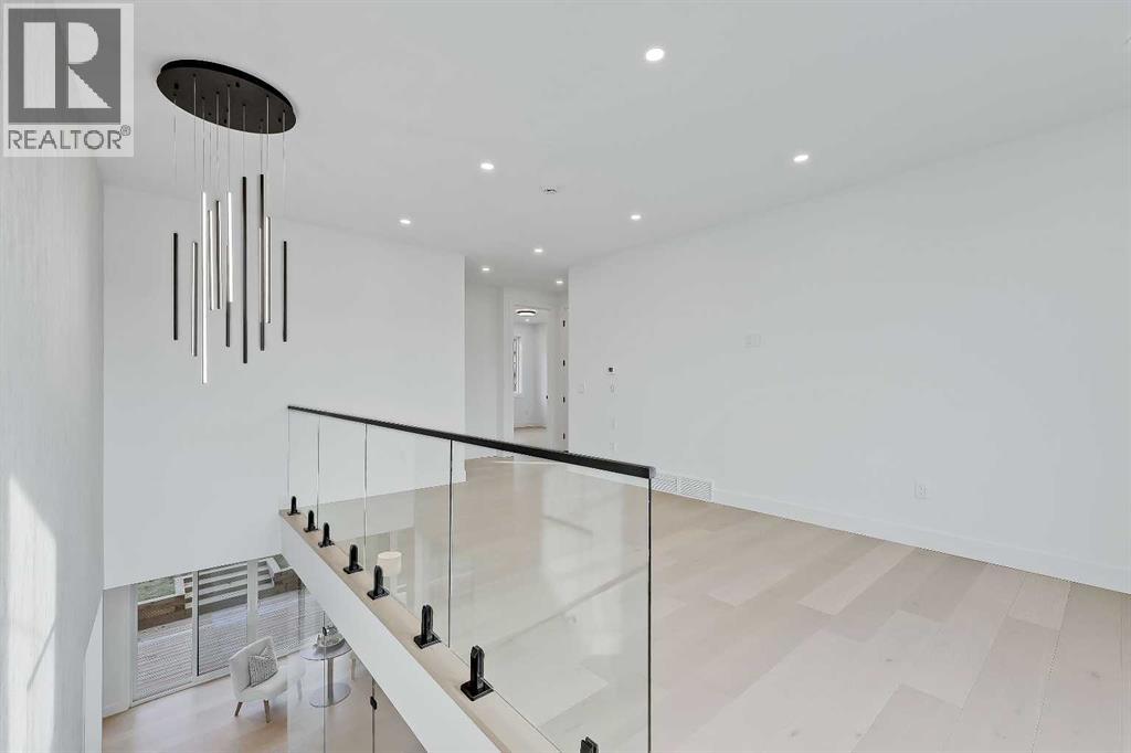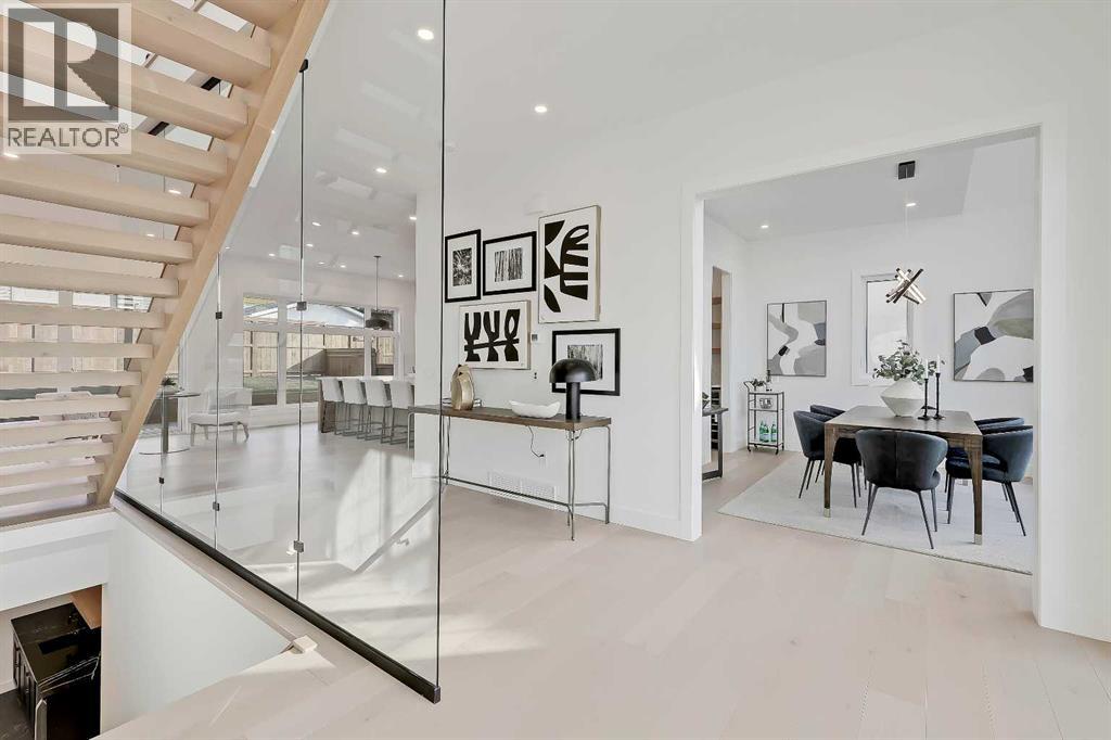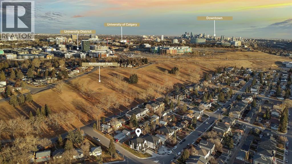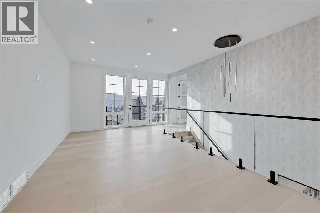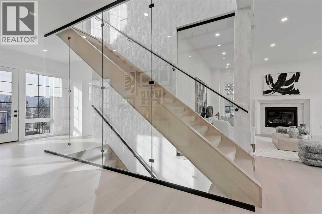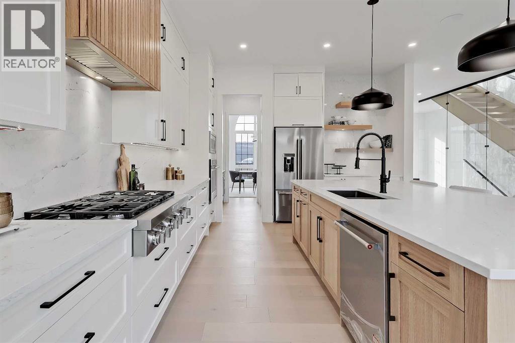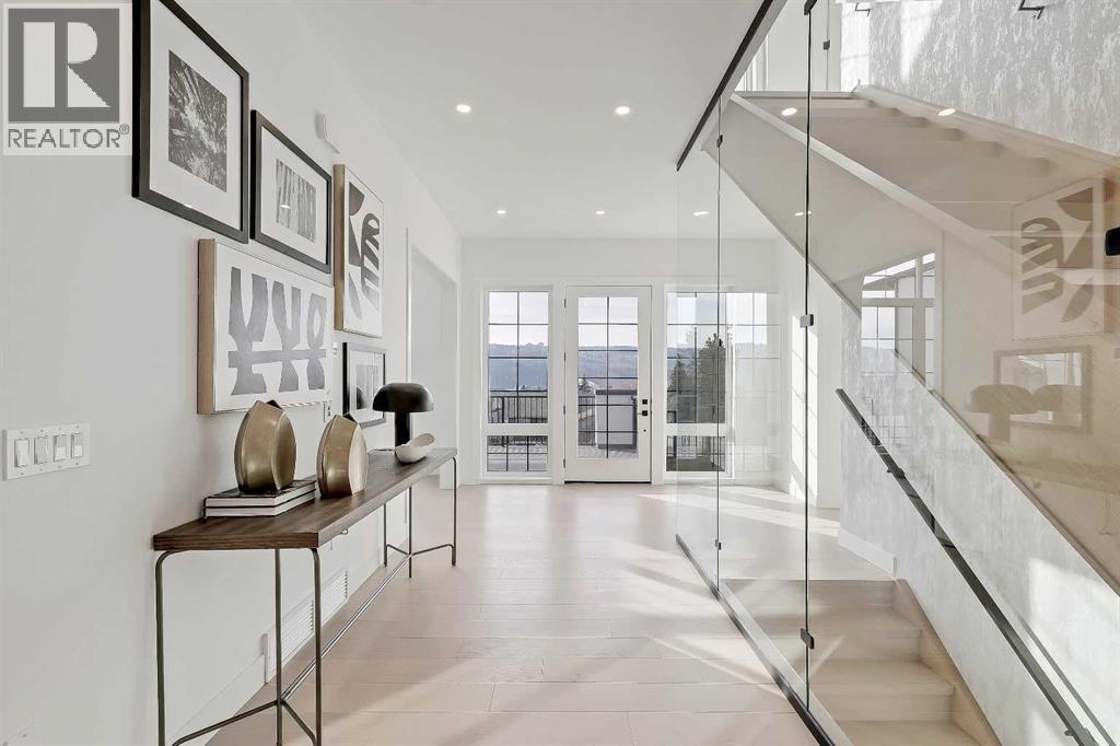 Perched high above the river valley in MONTGOMERY, this newly built estate home by NX HOMES blends bold architectural design with sweeping west-facing views and refined, contemporary comfort. Every detail has been thoughtfully curated—from the striking arched windows that flood the interior with natural light to the custom oak staircase and the cohesive balance of texture, tone, and proportion that defines each space. This is a home that feels both commanding and serene—a perfect match for its hillside setting just minutes from Market Mall, the University of Calgary, and the city’s vibrant northwest core. Inside, soaring 10-foot ceilings and a gallery-style foyer set the tone for what’s to come. The main level is anchored by a CHEF’S KITCHEN designed for gathering and performance, featuring waterfall-edge stone counters, high-end stainless steel appliances, and a large central island with seating for casual conversation. The BUTLER’S PANTRY offers extended prep and storage space, while the open-concept layout connects seamlessly to the dining area and a sunlit great room warmed by a modern gas fireplace. Oversized west windows frame mountain views, and double doors extend the living space outdoors to a generous upper deck—perfect for summer evenings and golden-hour sunsets. A front office, stylish powder room, and discreet storage complete this level with purpose and grace. Upstairs, three BEDROOMS WITH IN-FLOOR HEATED ENSUITES create private retreats for family and guests alike. The PRIMARY SUITE captures the west horizon with expansive windows and vaulted ceilings, a custom walk-in closet with built-ins, and a SPA-INSPIRED ENSUITE featuring a freestanding soaker tub, dual vanities, and an oversized glass-enclosed shower. A front-facing BONUS ROOM provides additional flexibility for a reading nook or play space, while the full-size LAUNDRY ROOM with sink keeps the upper level as functional as it is refined. The FULLY FINISHED WALK-OUT BASEMENT extends the home’s li ving and entertaining potential. Here, a sleek WET BAR opens to a spacious recreation and movie area—an ideal backdrop for game nights and gatherings. There’s also a fourth bedroom with a nearby full bath, a dedicated MUDROOM WITH BUILT-INS, and a rough-in for IN-FLOOR HEATING to keep every corner warm through Calgary’s winters. Every element of this property reflects craftsmanship and quality, from the ENERGY-EFFICIENT SYSTEMS and superior insulation to the TRIPLE ATTACHED GARAGE with R/I for gas heater and the low-maintenance landscaped exterior. Outdoor lighting highlights the home’s modern architecture, while the tiered front approach and private rear yard enhance curb appeal and usability. In a community prized for its views, parks, and proximity to downtown, this home stands apart—not just for its design, but for how it lives. Elegant yet welcoming, contemporary yet timeless, it’s the rare opportunity to own a truly ONE-OF-A-KIND CUSTOM BUILD IN MONTGOMERY. (id:58070)