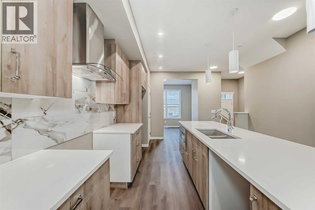 UNBELIEVABLE OPPORTUNITY & A SMART INVESTMENT. This brand-new “Rayn” pairs stylish family living with real income potential thanks to a fully developed 2-bedroom, 1-bathroom legal suite with its own private entrance—perfect for rental revenue or multi-generational living. It’s one of the best 2-bedroom suite layouts you’ll see, with a thoughtfully planned use of space that makes furnishing (and renting) easy from day one. Inside, the main level impresses with warm natural vinyl plank flooring and modern finishes throughout. The central kitchen is the showpiece: natural wood-tone cabinetry to the bulkhead, modern backsplash, chimney hood fan, stainless steel appliances, and bright white quartz that wraps an oversized island—ideal for coffee catch-ups or weekend entertaining. The dining area sits perfectly between kitchen and living, comfortably fitting an extended table for holidays. At the rear, the living room features floor-to-ceiling windows for great light, plus a smartly tucked back entry with a 2-piece bath. Two unique spaces elevate daily life: a versatile flex room just off the kitchen (home office, playroom, or gym) and a raised homework/tech nook overlooking the main floor—clean, functional, and surprisingly fun. Upstairs, a cozy bonus room anchors the level (movie nights, play space, or reading corner). The primary retreat sits quietly at the back with an oversized window, a generous walk-in closet, and a stylish 4-piece ensuite featuring dual sinks and a full-size shower. It feels like it belongs in a much larger home. Hotchkiss is one of southeast Calgary’s newest master-planned communities, celebrated for its wide-open prairie and mountain vistas, quick connectivity, and nature-first design. Framed by Stoney Trail and Highway 22X for easy commuting—and just minutes to nearby Mahogany and Seton—Hotchkiss puts shopping, services, the South Health Campus, and daily essentials within easy reach. The community is anchored by a 30-acre natural wetland with b oardwalks and pathways, part of a broader green network that’s planned to include roughly 51 acres of park space and trails, creating a true outdoor playground for walking, jogging, and wildlife watching. Family-friendly planning is central here, with future amenities that include a K-9 school and about four acres of neighbourhood commercial, plus new parks and play areas as the community builds out across its ~237 acres. In short, Hotchkiss offers the calm of nature, the convenience of the southeast, and the promise of a thoughtfully connected community as it grows. (id:58070)