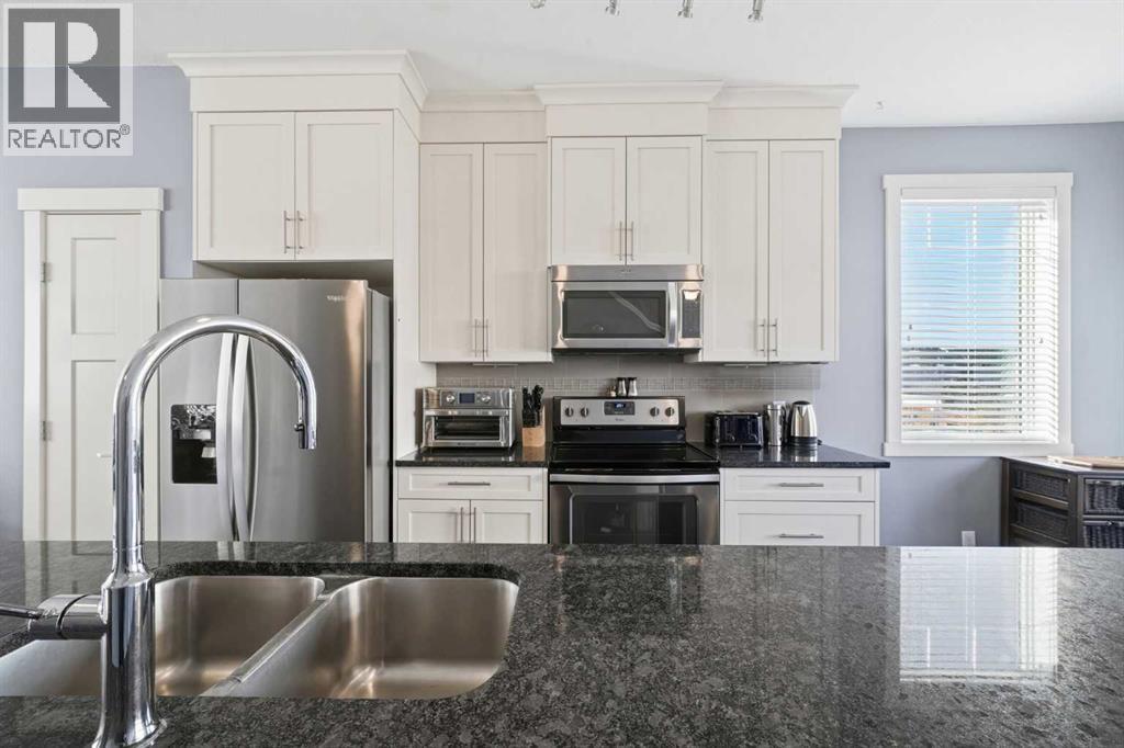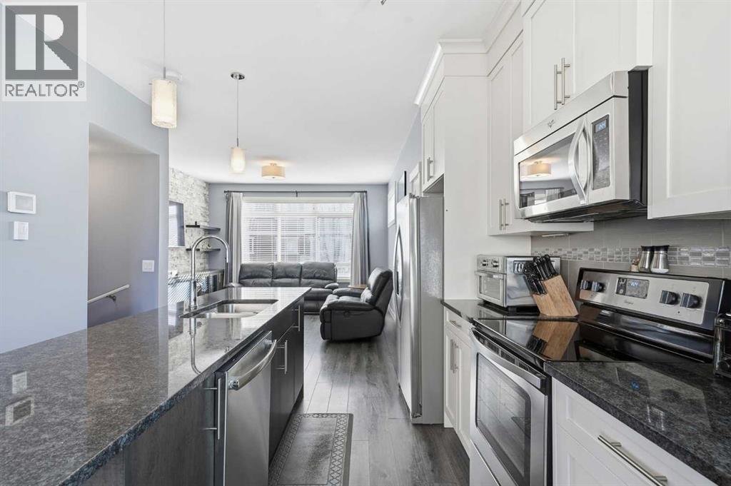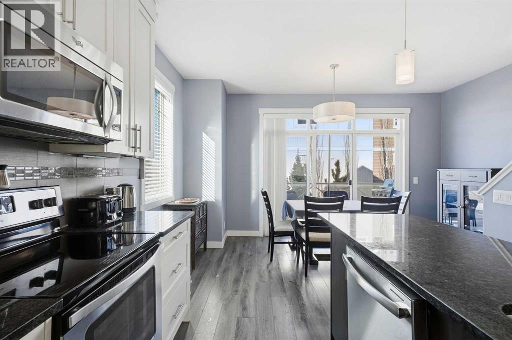 Welcome to this beautifully upgraded corner-unit townhome offering 2 primary bedrooms + den and 2.5 BATHS in a fantastic Calgary location. The bright living room features a stunning REAL STONE FEATURE WALL, custom built-ins, and an elegant electric FIREPLACE. The kitchen boasts granite countertops, a large island with eating bar, and flows into the formal dining area with access to a private balcony complete gas BBQ hookup.Upstairs you’ll love the VAULTED ceilings, convenient upper-floor laundry, and two spacious bedrooms including a generous master suite with room for a king-sized bed, walk-in closet, and a 3-piece ensuite featuring HEATED TILE flooring and an upgraded quartz vanity. The single attached garage includes CUSTOM SHELVING. Ideally located near visitor parking, schools, and shopping.A must-see corner unit with excellent upgrades and unbeatable convenience! (id:58070)