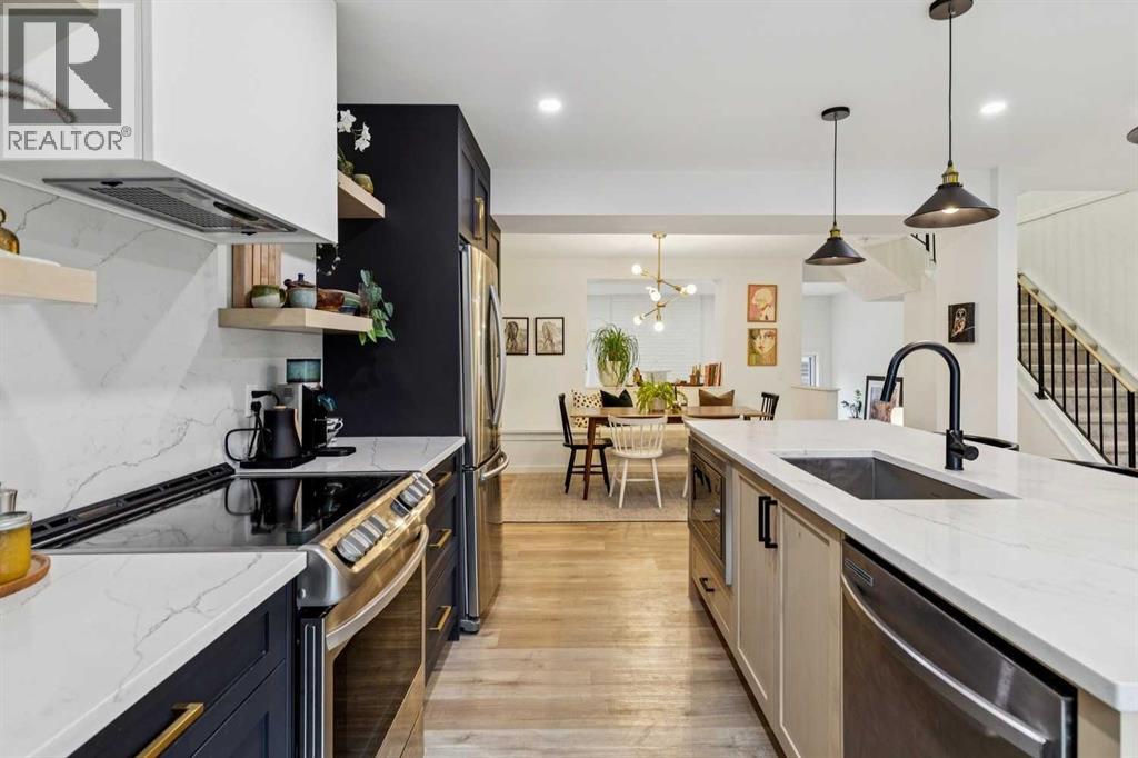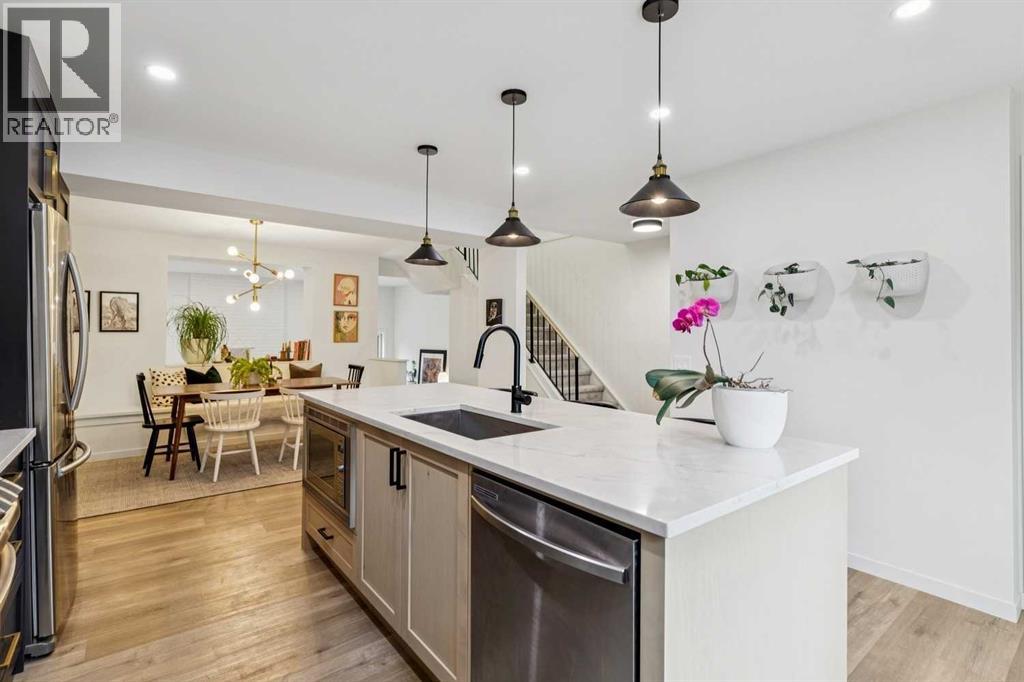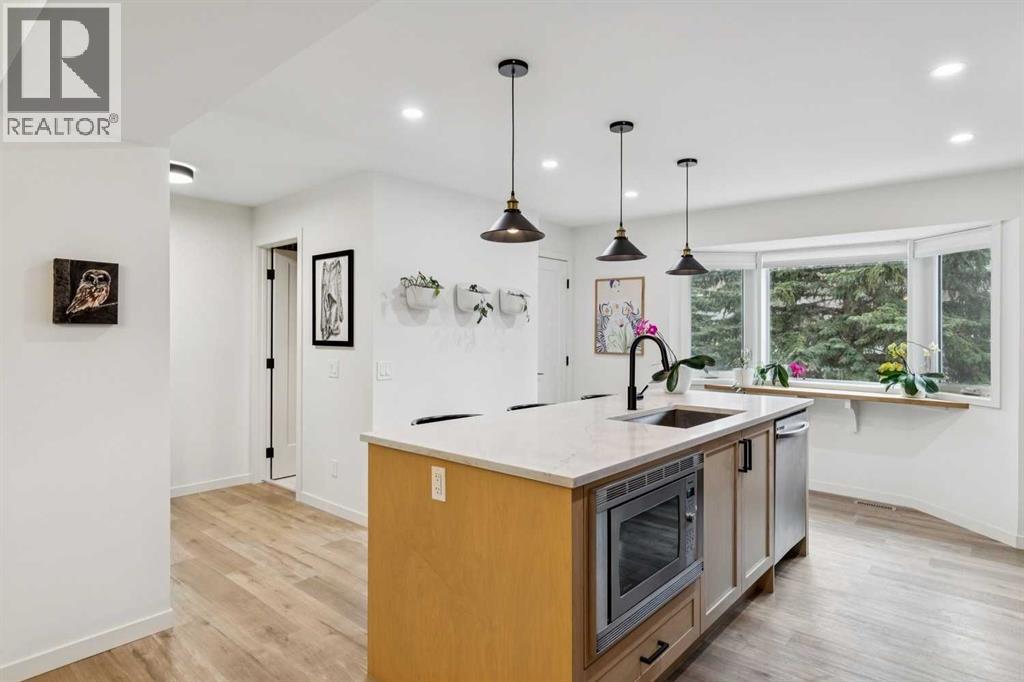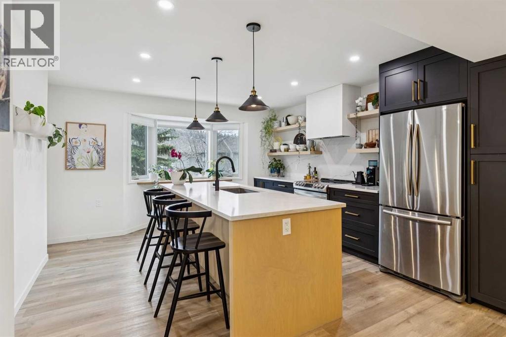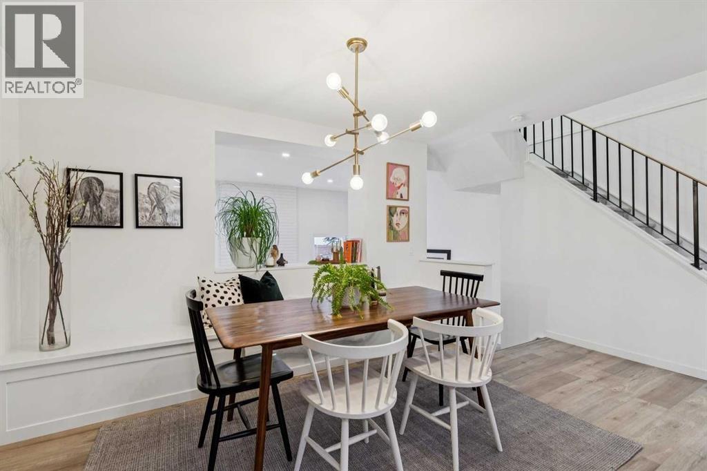 Completely renovated from top to bottom, this high-quality, stylish townhouse offers a rare blend of modern design, thoughtful upgrades, and an unbeatable location with greenspace behind and just one row from the scenic pathways of the Bow River. Featuring a single attached garage with brand-new epoxy flooring and a driveway, this home has been refreshed throughout, including all new windows, creating a truly move-in ready experience. Inside, the main level impresses with a dramatic 2-storey ceiling in the living room, anchored by a cozy gas fireplace and finished with durable LVP flooring, while patio doors lead to a private, FULLY FENCED BACKYARD. The adjacent kitchen and dining area are equally striking, showcasing beautiful updates with a large island with breakfast bar, stainless steel appliances including an oven that has barely been used, stone countertops and backsplash, custom cabinetry, floating open shelves, a large walk-in pantry, and a charming bay window with café-style seating, perfect for morning coffee or a work-from-home nook. The dining space features a custom built-in bench, adding both style and function. Also on this level, the show-stopping half bathroom is beautifully finished with tile flooring, granite countertops, bold black walls, and unique, modern design details with updated fixtures throughout. Upstairs, you will find 3 well-sized bedrooms and 2 full bathrooms, including a spacious primary retreat with a large walk-in closet complete with built-ins, new window coverings, and a private, treed outlook with mature evergreens. The ensuite offers double sinks, granite counters, tile flooring, and a large, gorgeous tiled shower, while the secondary bathroom includes a tub/shower combo and granite countertops. The fully finished basement extends your living space with LVP flooring, laundry, a flex room, and convenient under-stair storage. A welcoming front patio sitting area adds to the home’s charm, while the surrounding community offers a u nique, nature-filled setting with mature trees throughout, easy access to downtown, the Children’s Hospital, the Foothills Hospital, and quick routes west to the mountains - making this an exceptional opportunity for those seeking both lifestyle and location. The maintenance fees are some of the lowest in the neighbourhood! (id:58070)