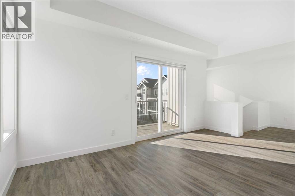 Welcome to The Jasper, a stunning top-floor stacked townhouse that offers the perfect blend of style and function. This unit features over 1250 sq ft of thoughtfully designed living space, with most of the layout conveniently situated on a single level. Step inside and up to the main floor and you will discover an open-concept living area with a full kitchen that's a home chef's dream. The kitchen boasts elegant quartz countertops, soft-close drawers, and stylish two-tone cabinets highlighted by pendant lighting. An adjacent, flexible space is perfect for a spacious dining area or a home office. This home has two large bedrooms and two full bathrooms. The primary bedroom is a true retreat, featuring a massive walk-in closet and a luxurious 4-piece ensuite. A spacious laundry room adds to the convenience.This unique floorplan is designed to feel like a modern apartment but with the added benefits of a main floor storage/flex area and direct access to an oversized, extended single-car garage.This home is perfectly situated to offer the best of both convenience and community. It's located right next to a future school site, with transit options directly at your doorstep for effortless commuting. Enjoy a short two-minute walk to Bow Valley High School, and a quick five-minute trip to the Spray Lakes Sports Centre for all your recreational needs. For bigger city amenities, you're only 20 minutes from South Calgary, and the mountains are within easy reach, with Canmore just a 40-minute drive away. (id:58070)