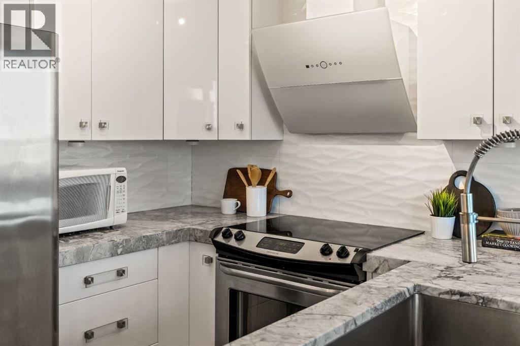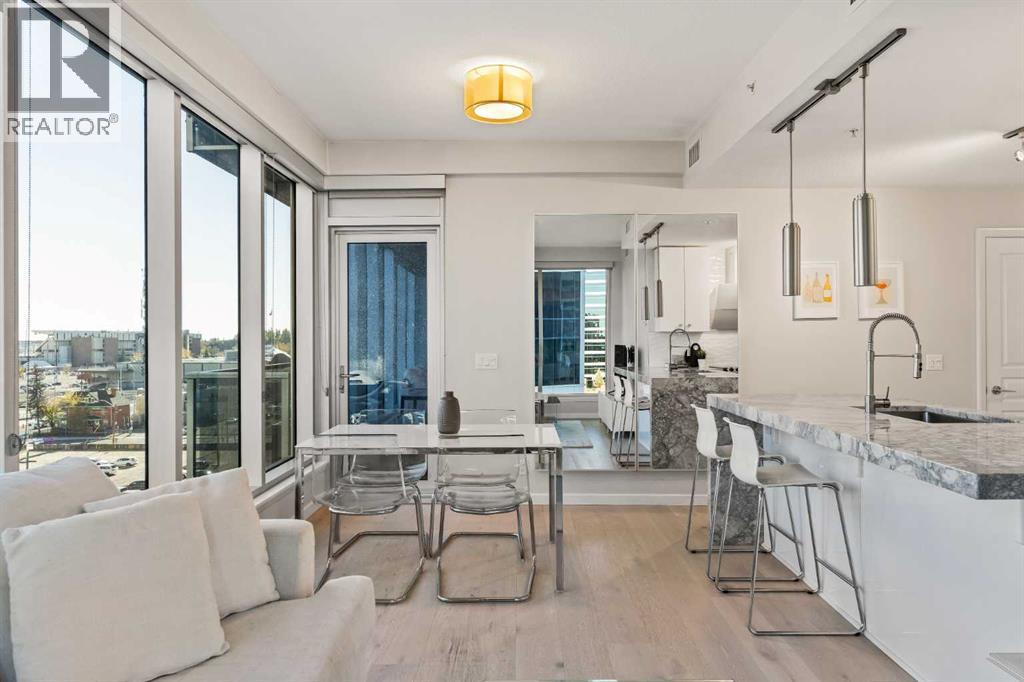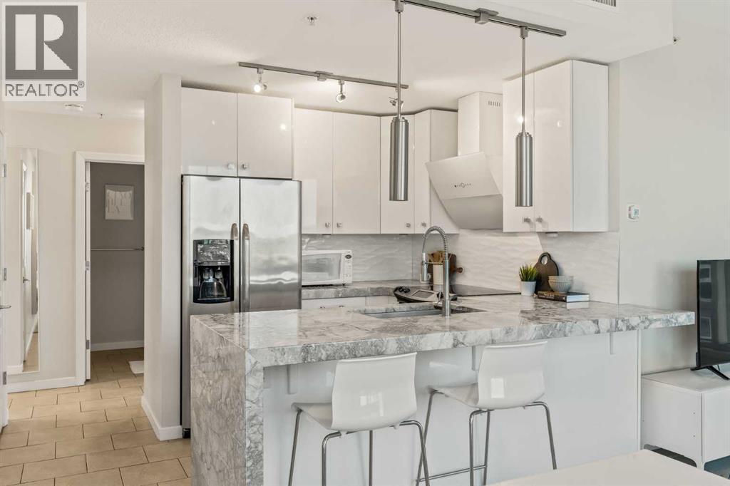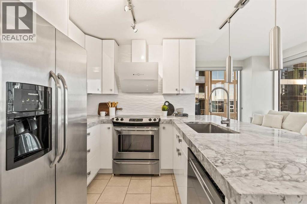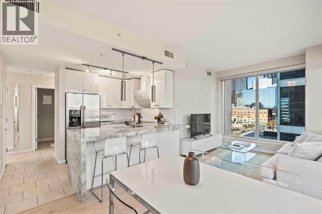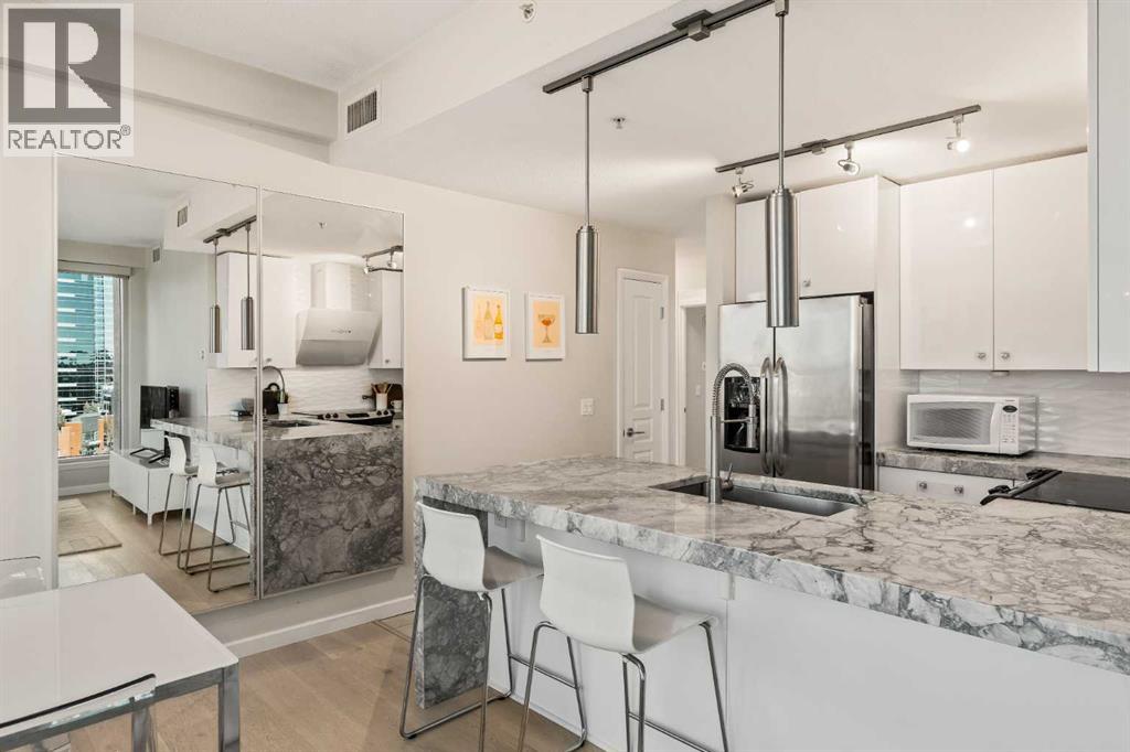 Welcome to Alura, where timeless elegance meets contemporary design in this fully renovated condo. This beautifully updated property features 2 bedrooms, 2 bathrooms and TWO Titled Parking Stalls - a very rare offering for a Beltline condo! This property redefines luxury urban living in the heart of downtown Calgary. The bright kitchen features mitred-edge marble countertops with a dramatic waterfall finish, a custom Italian-engineered hood fan, and full-height high-gloss cabinetry that provides both beauty and functionality. Resilient tile flooring flows throughout the main entry, hallway and kitchen, with updated hardwood flooring throughout the living space and bedrooms. The open-concept living and dining areas are flooded with natural light and offer stunning panoramic city views, including breathtaking morning sunrises that illuminate the skyline and views of downtown Calgary from both the living area and primary bedroom. The full dining space + island peninsula seating makes hosting and entertaining that much easier and more comfortable. The primary suite is a true retreat, complete with captivating downtown views, a fully customized walk-in closet, and a luxurious 4-piece ensuite with updated vanity and granite countertops. A second bedroom which is located at the opposite end of the condo for optimal privacy, and full bathroom make this layout ideal for guests, a home office, or shared living. Step outside to your private, fully covered balcony - an all-season outdoor oasis perfect for morning coffee, evening wine, or year-round barbecues. Additional features include 2 Titled underground heated parking stalls (providing rental income for a stall if only one is needed), a secure storage locker, and access to Alura’s premier amenities including concierge and a full gym. Located in an amenity-rich building with easy access to the downtown core, 17th Avenue and endless restaurants and retail options nearby, this property is ideal for young professionals or inves tors. This home offers the perfect balance of sophistication, comfort, and convenience - everything downtown living is meant to be. (id:58070)